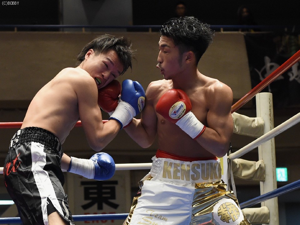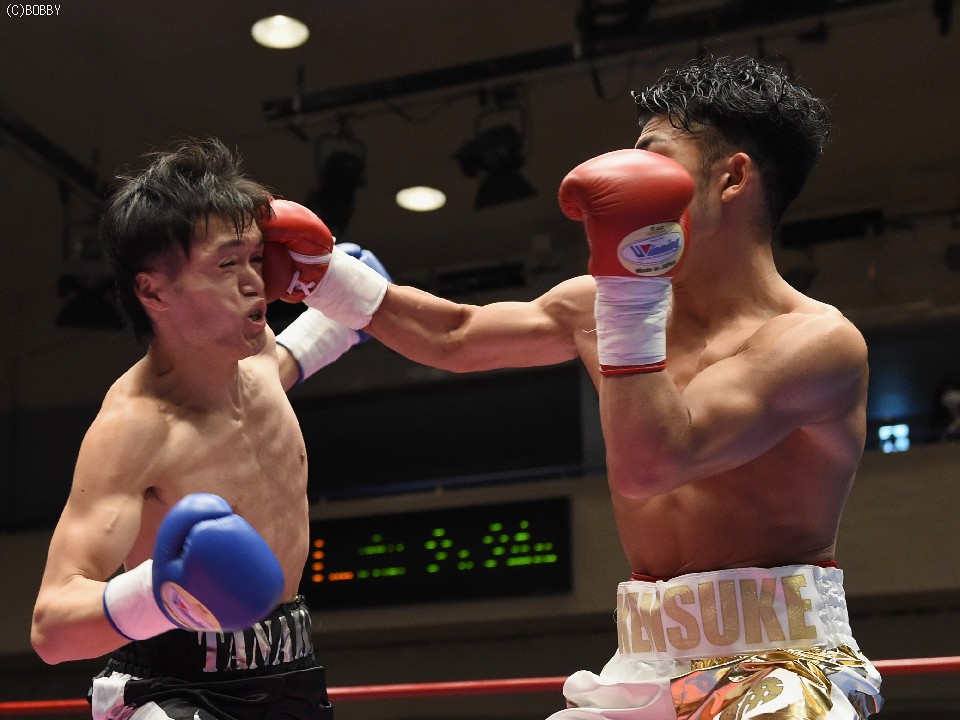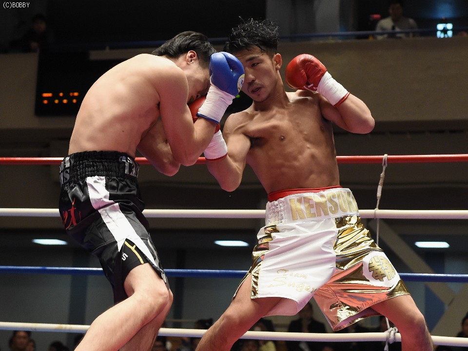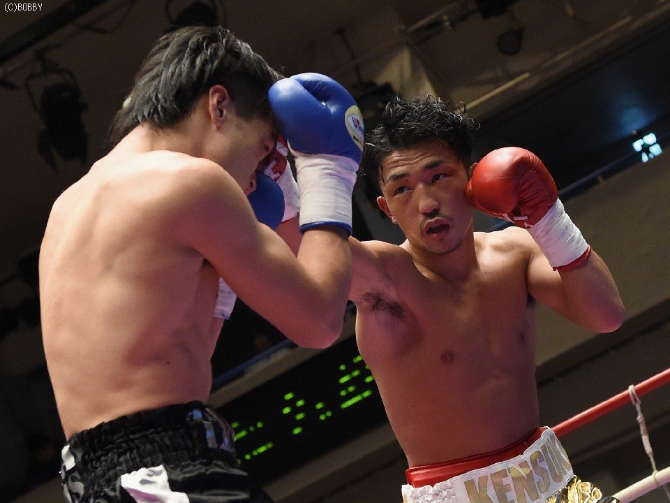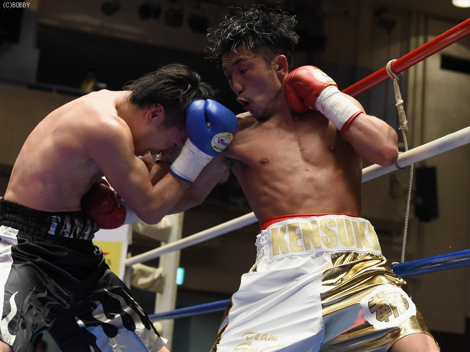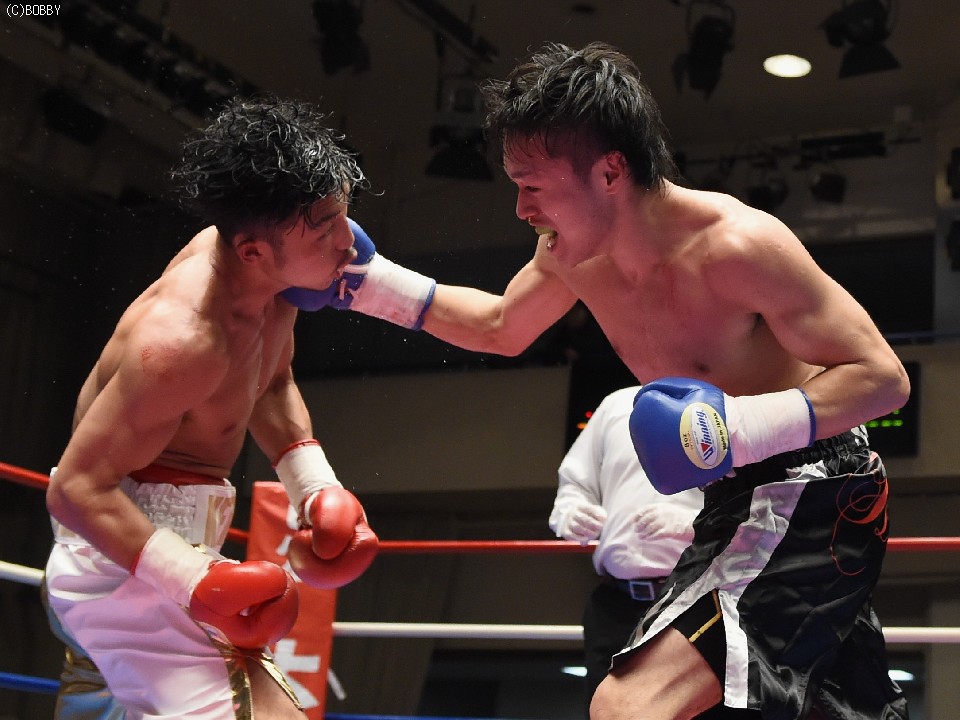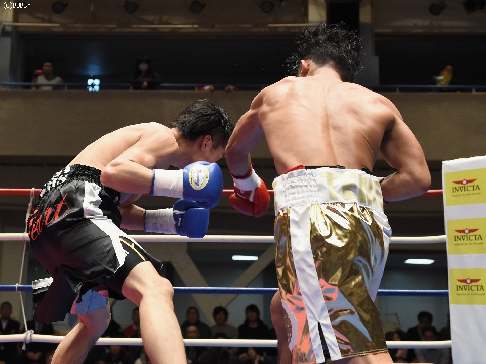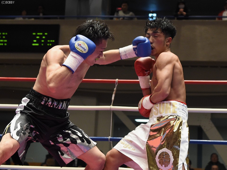 試合:開始と同時に前に出た田中が、頭を沈め左右を振るう。左の強打を浴び出鼻を挫かれたサウスポー佐々木だが、すぐにサイドに動いて距離を取るとジャブからキレのある左ストレートで反撃。ペースを握りかけたが、直線的な田中がそれを上回るプレスで右ストレート、左フックをしつこく繰り出す。アグレッシブさで圧されていた佐々木も4Rに入ると積極的に仕掛け、左フックのカウンターを取ったかと思えば、このRの終了間際に左ストレートをドンぴしゃで合わせ、鮮やかなダウンを奪った。田中も最後まで攻撃の手を休めなかったが、佐々木の懐を脅かすまでは至らず。判定で佐々木が3勝目、トーナメント決勝に駒を進めた。決勝は角本と対戦。