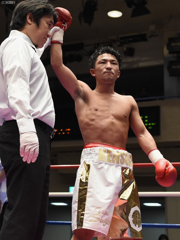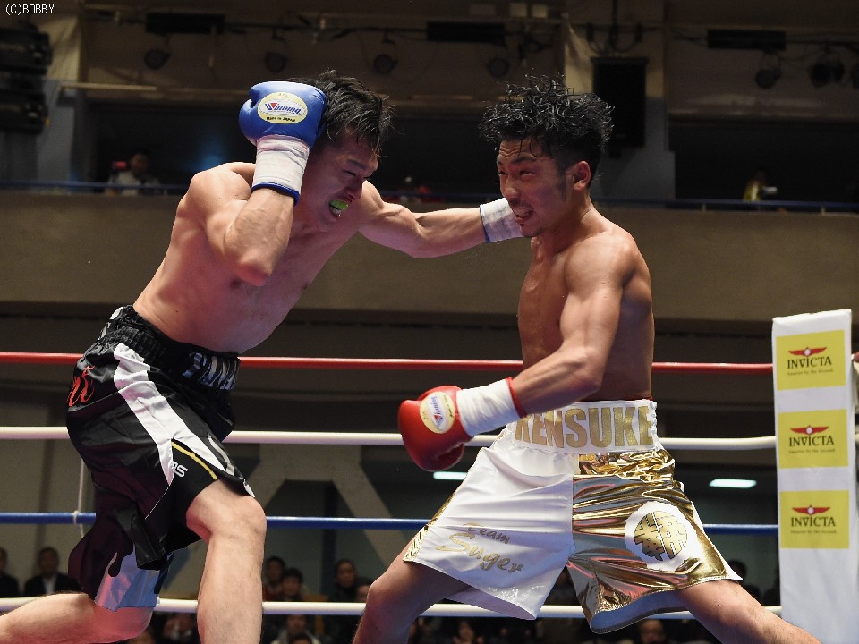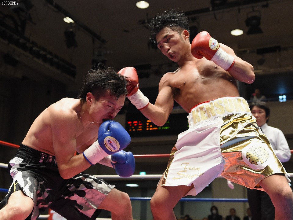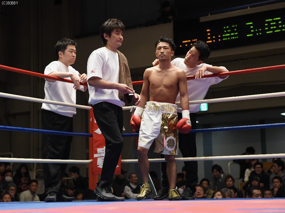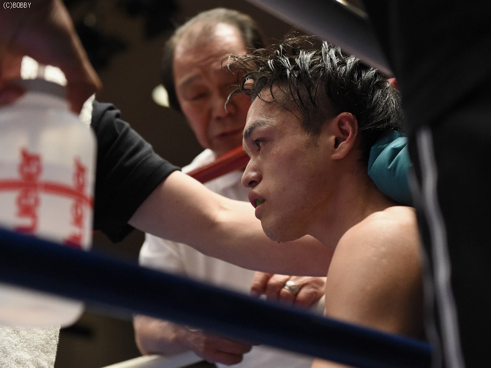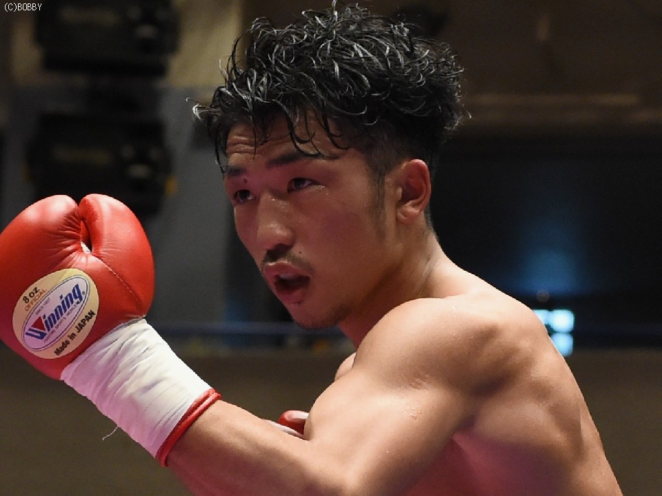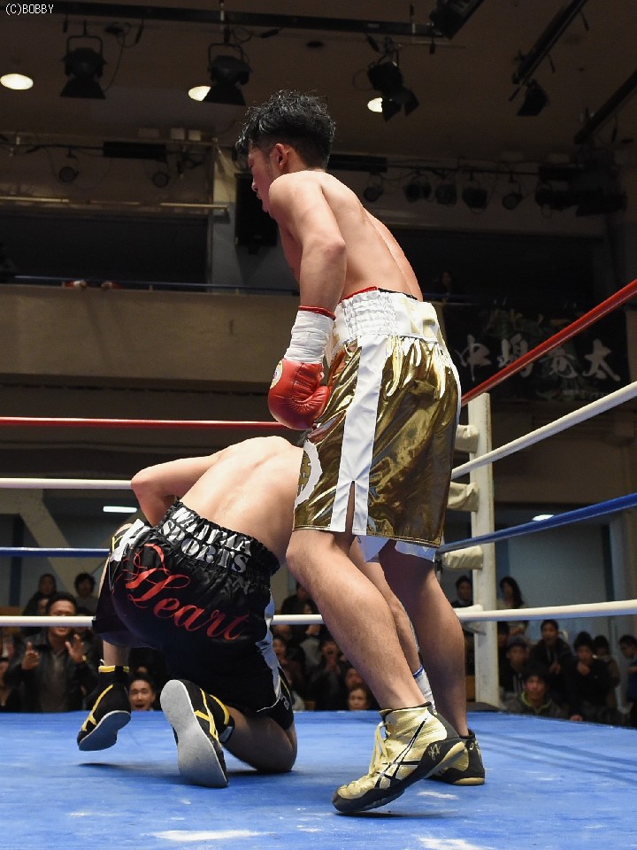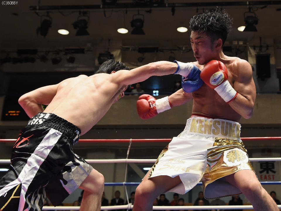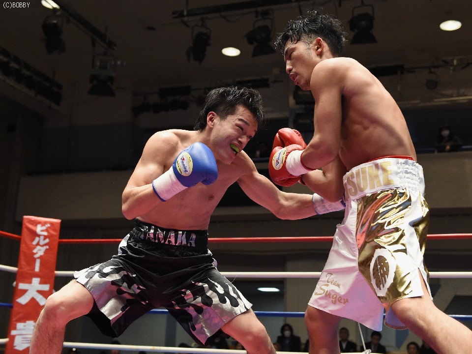 試合:開始と同時に前に出た田中が、頭を沈め左右を振るう。左の強打を浴び出鼻を挫かれたサウスポー佐々木だが、すぐにサイドに動いて距離を取るとジャブからキレのある左ストレートで反撃。ペースを握りかけたが、直線的な田中がそれを上回るプレスで右ストレート、左フックをしつこく繰り出す。アグレッシブさで圧されていた佐々木も4Rに入ると積極的に仕掛け、左フックのカウンターを取ったかと思えば、このRの終了間際に左ストレートをドンぴしゃで合わせ、鮮やかなダウンを奪った。田中も最後まで攻撃の手を休めなかったが、佐々木の懐を脅かすまでは至らず。判定で佐々木が3勝目、トーナメント決勝に駒を進めた。決勝は角本と対戦。