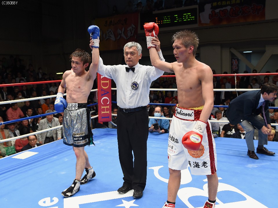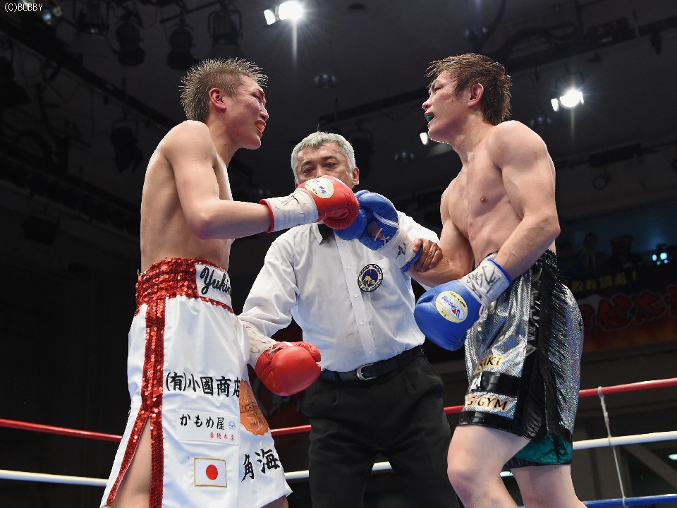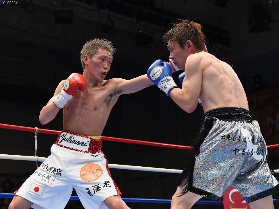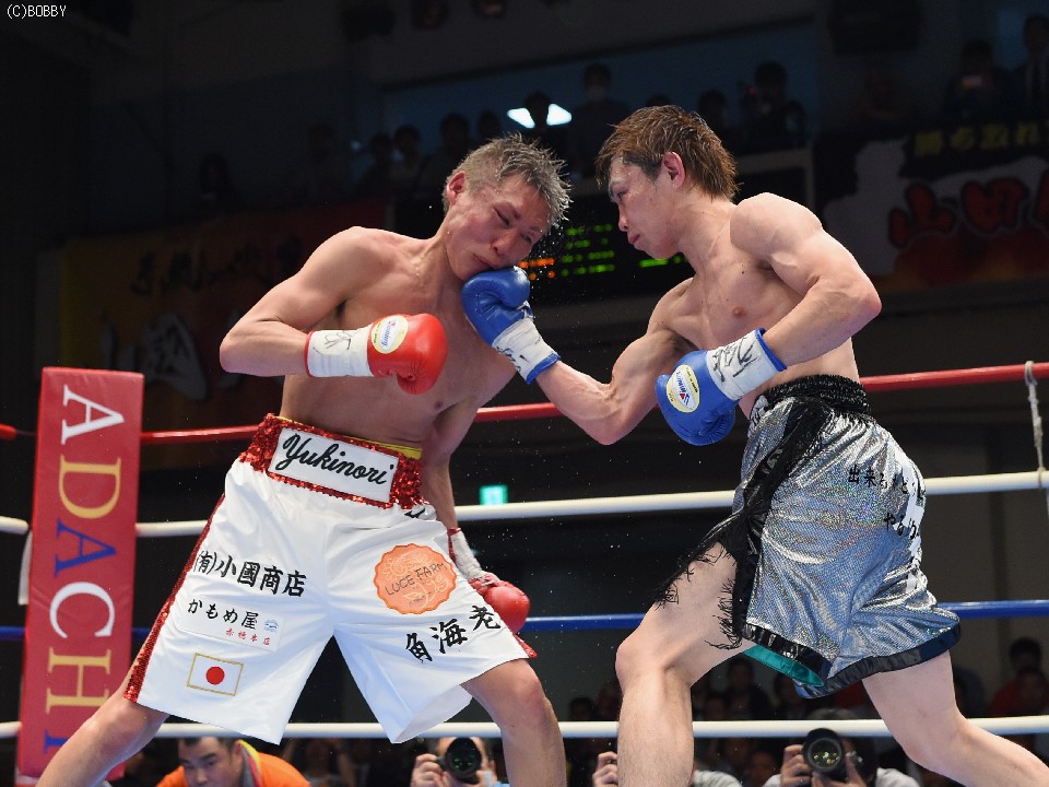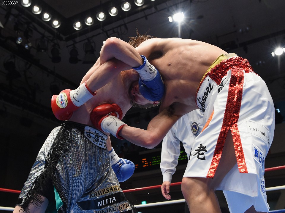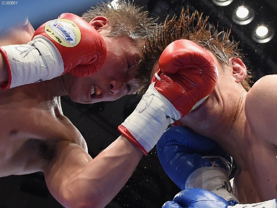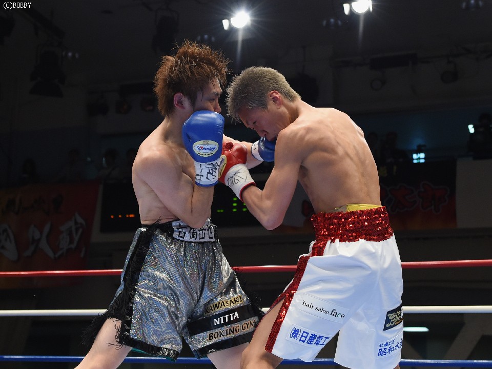 試合:タイトル初挑戦の古橋を迎え、小國がOPBF王座以来の初防衛戦に臨んだ。試合は挑戦者が体を振りながら前に出てスタート。これに小國が慌てず、ジャブ、ワンツーで迎えると、戦前の予想どおりに古橋の圧力がグイグイと増した。古橋はジャブで先手も取り続けたが、小國も足を止めては回転のあるワンツー、アッパーで迎え撃ち、3Rは激しい打ち合いへと発展。しかし、体を合わせての押し合いは気持ちの強い挑戦者の土俵。小國も左ボディで対抗したが、接近戦は古橋が上回った。5R終盤には王者をコーナーに詰めて上下へとパンチを打ち込み、前半は悪くてもイーブンかと思われたが、途中採点は3者ともに49-46で小國がポイント。この採点を聞いた古橋が続く6Rにワンツー、ボディで猛然と襲いかかり、王者を再び追い詰めたが、小國も顔を腫らしながら距離が近づいてはボディ、離れてはワンツーで反撃。挑戦者の必死の追い上げに後半の苦戦は否めなかったが、前半の貯金が幸いし、辛くもドロー防衛に成功した。