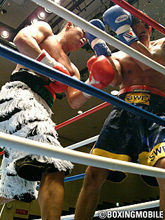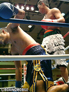 試合:両者探り合いの1R。澤永は徹底したボディ狙いだが手数が少ない。対するサウスポーのサクナロン、澤永のボディ攻めをバックステップで捌き、飛び込んでの左ストレートを放つが、こちらも後が続かない。あくまでボディ狙いの澤永は3R、ロープにサクナロンを追い込むとボディ連打でサクナロンはダウン。が、立ち上がるサクナロンに澤永、ラッシュを仕掛けられず逃げられてしまう。4R、逃げるサクナロンを今度はコーナーで捕まえようやく上下に連打。最後はボディにまとめサクナロン2度目のダウン。レフェリーがカウントを数えるが立ち上がる気配なし。そのまま10カウントで澤永がKO勝ちを収めた。