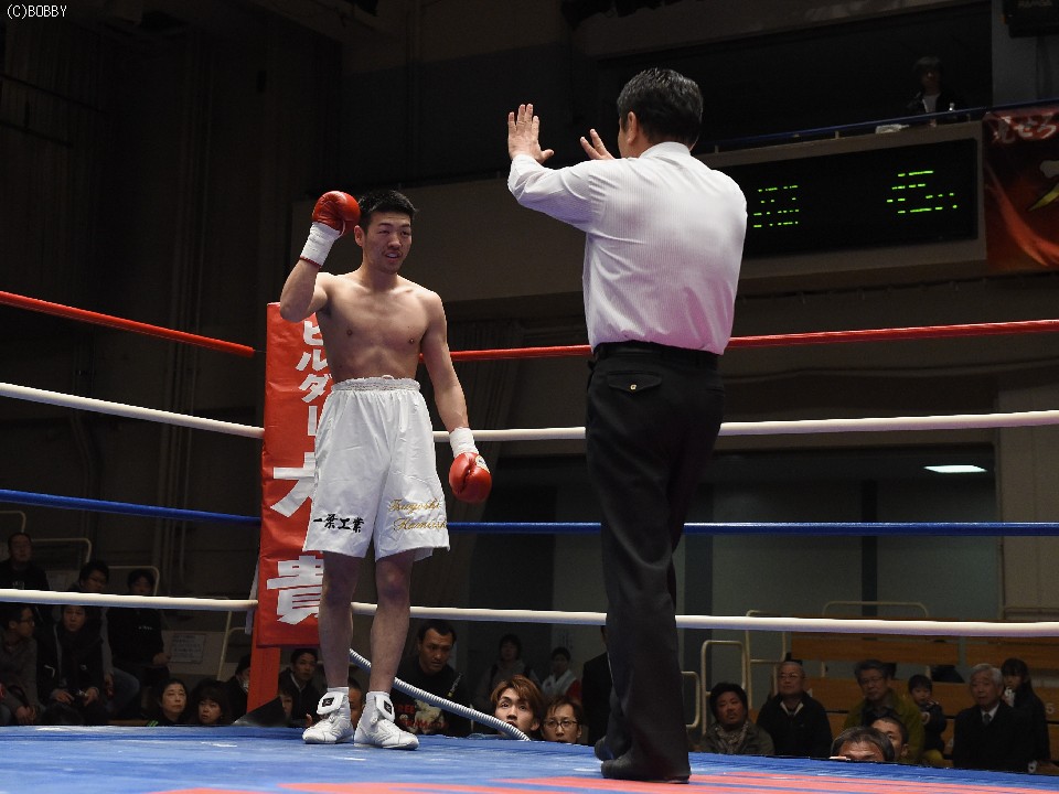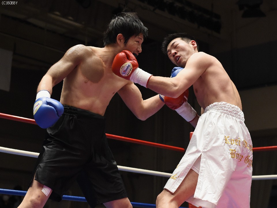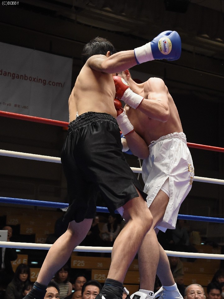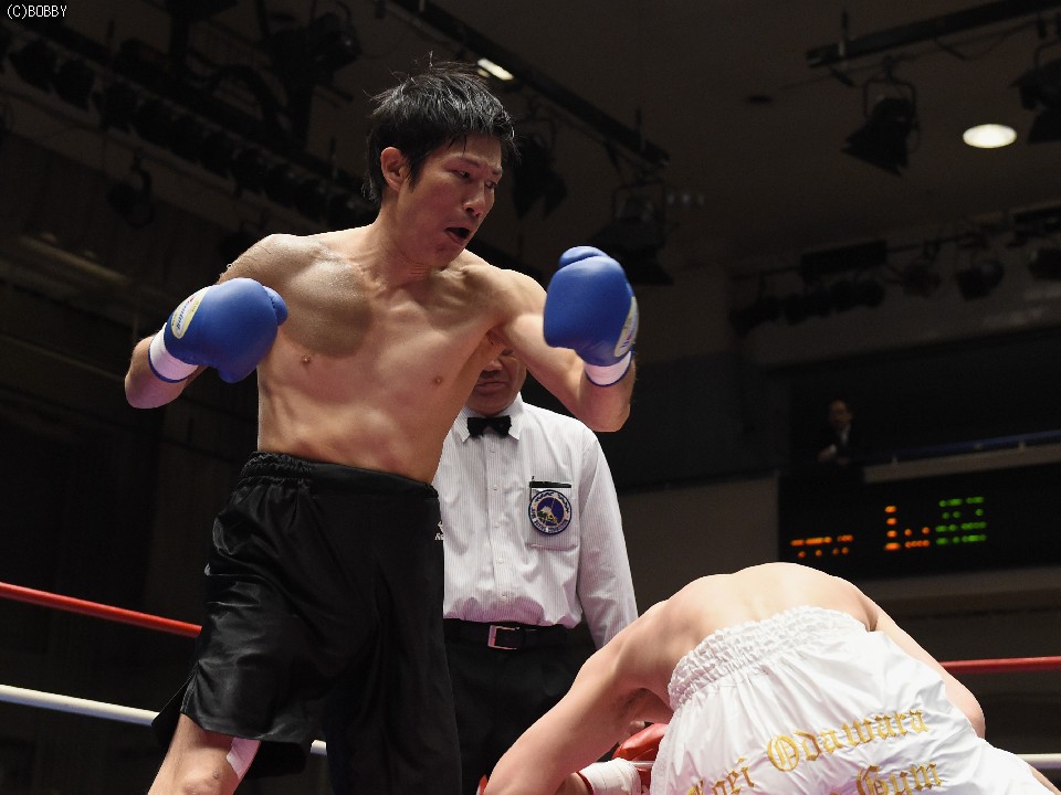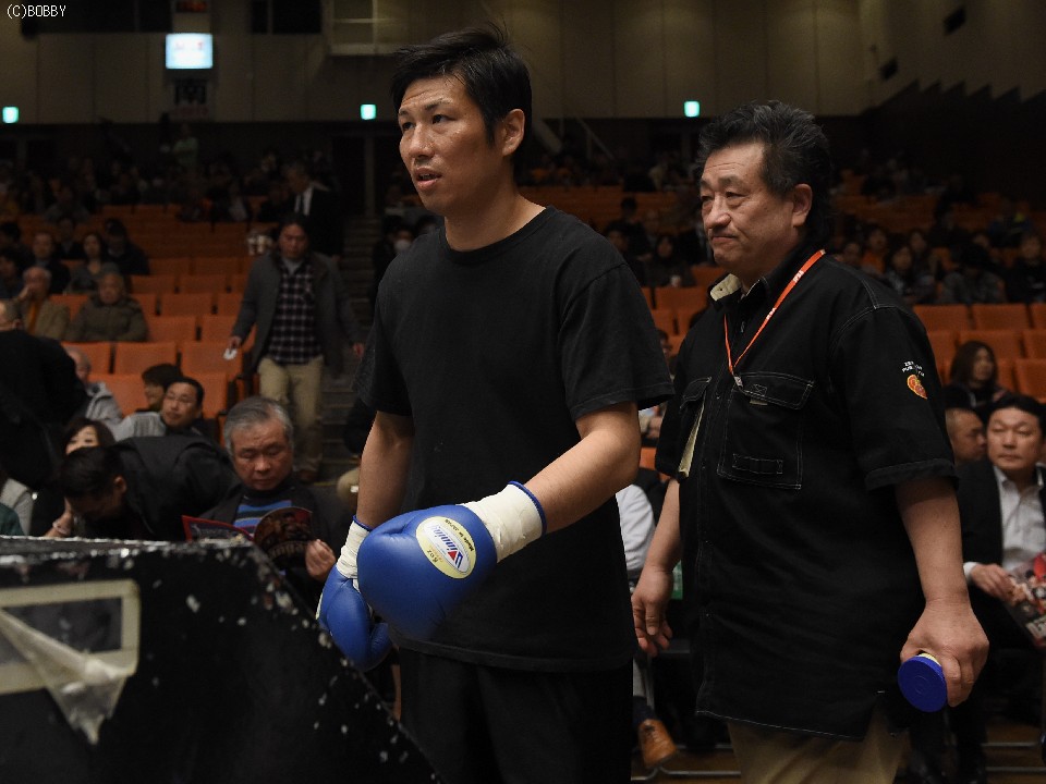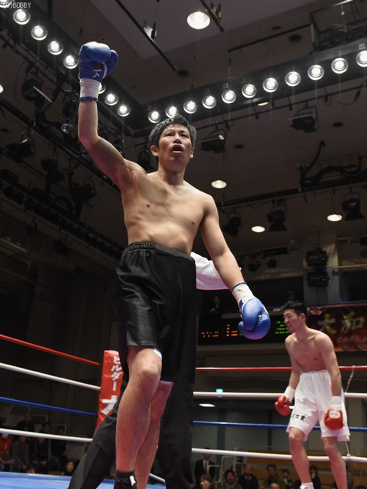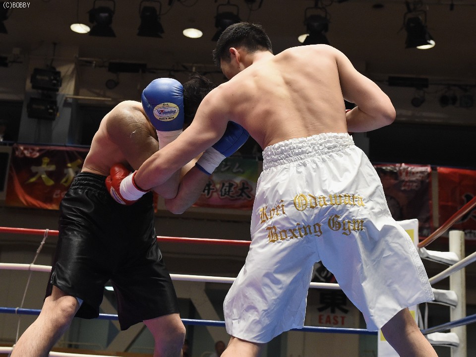 試合:浜野のワンツーに立ち上がりのリズムを崩された名原だが、1分を過ぎると打ち合いに持ち込む。スタミナが切れる度に後退したが、残り1分で立て続けにダウンを奪い1R・KO!6月で37歳定年を迎える名原が初勝利を上げた。