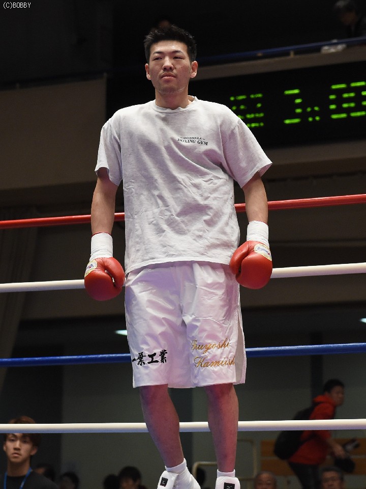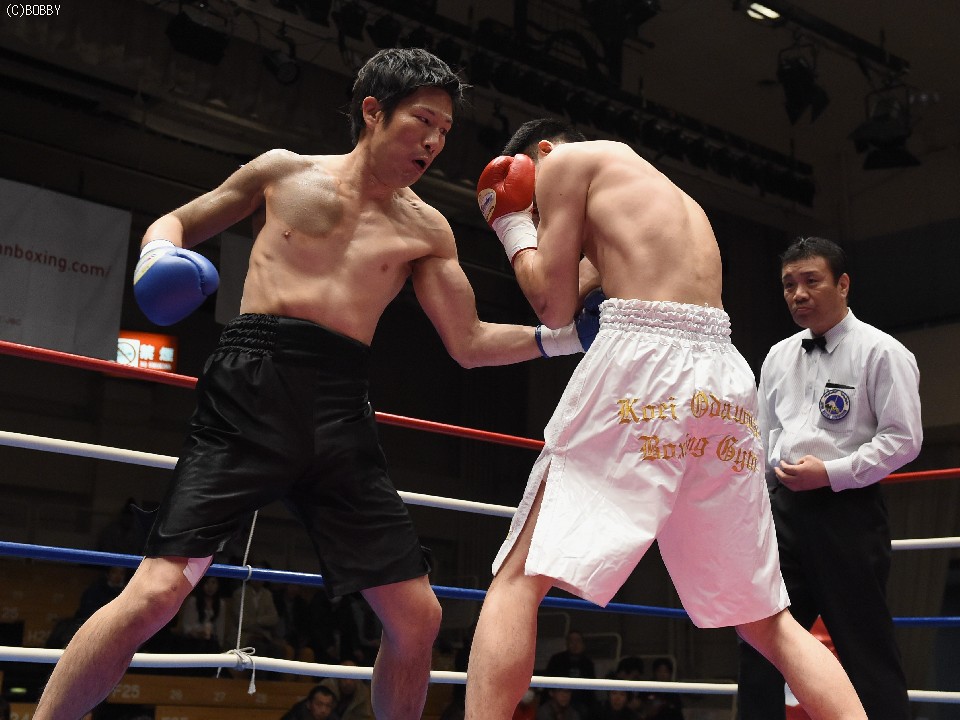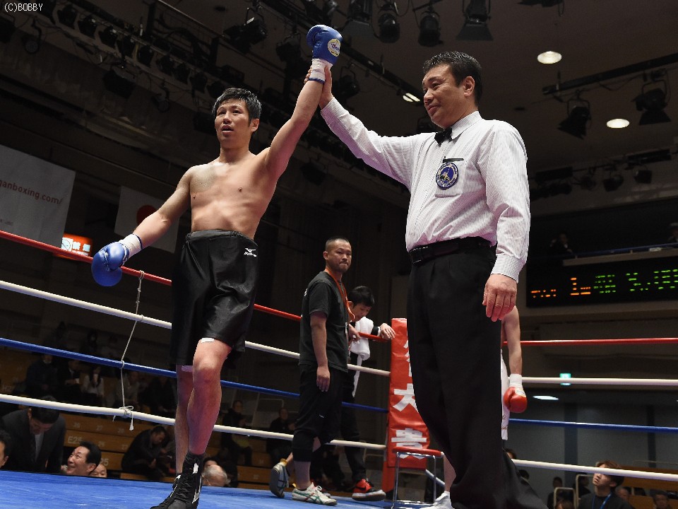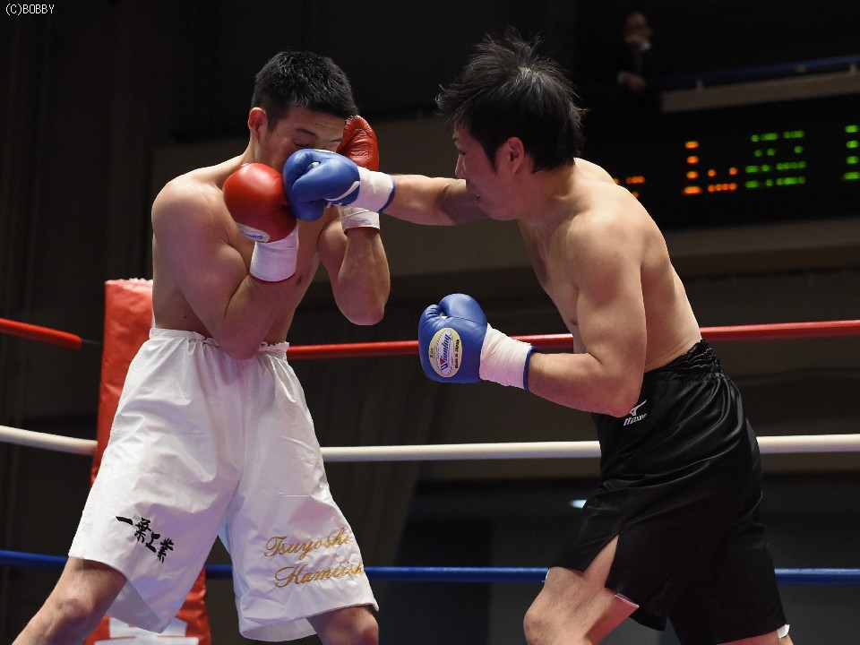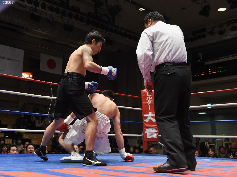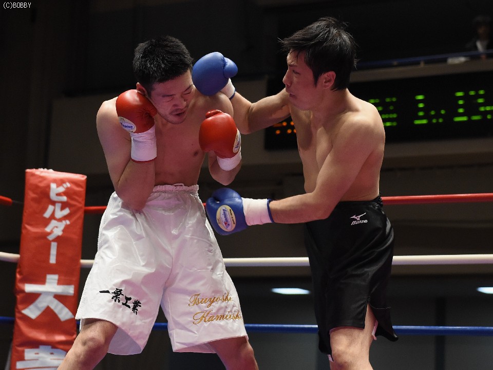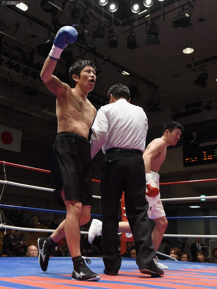 試合:浜野のワンツーに立ち上がりのリズムを崩された名原だが、1分を過ぎると打ち合いに持ち込む。スタミナが切れる度に後退したが、残り1分で立て続けにダウンを奪い1R・KO!6月で37歳定年を迎える名原が初勝利を上げた。