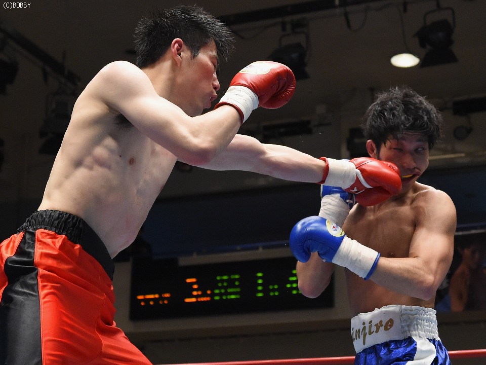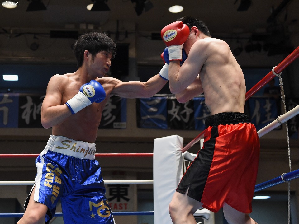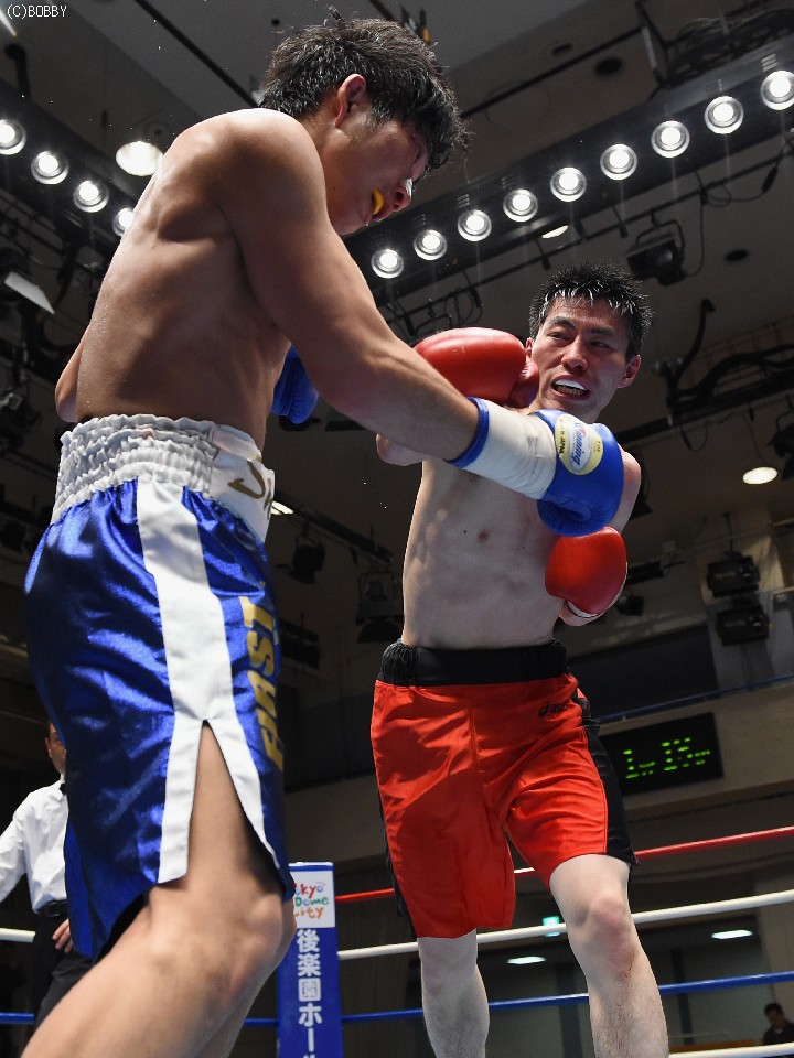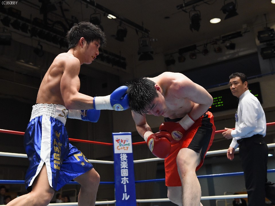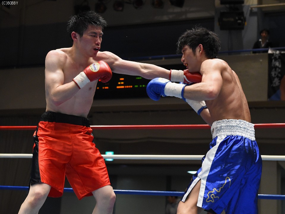 試合:立ち上がり、ジャブから右をつなげたい両者だがパンチの的確さは河田が上回り右ストレートをヒットしてリズムをつかむ。さらに攻勢をかける河田だが、ガードが下がったところに中野の右カウンターが決まり試合を五分に戻す。両者、決定打が出ないまま迎えた4R、ポイントを取りにアグレッシブに攻めにいったが、最後まで採点の難しいラウンドが続いた。公式結果は河田の1-0の引き分けとなるも残りの二者は河田を優勢とし、トーナメントを勝ち上がった。