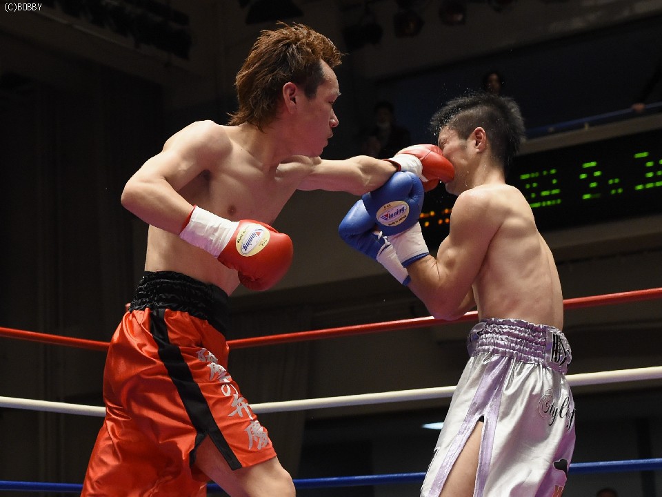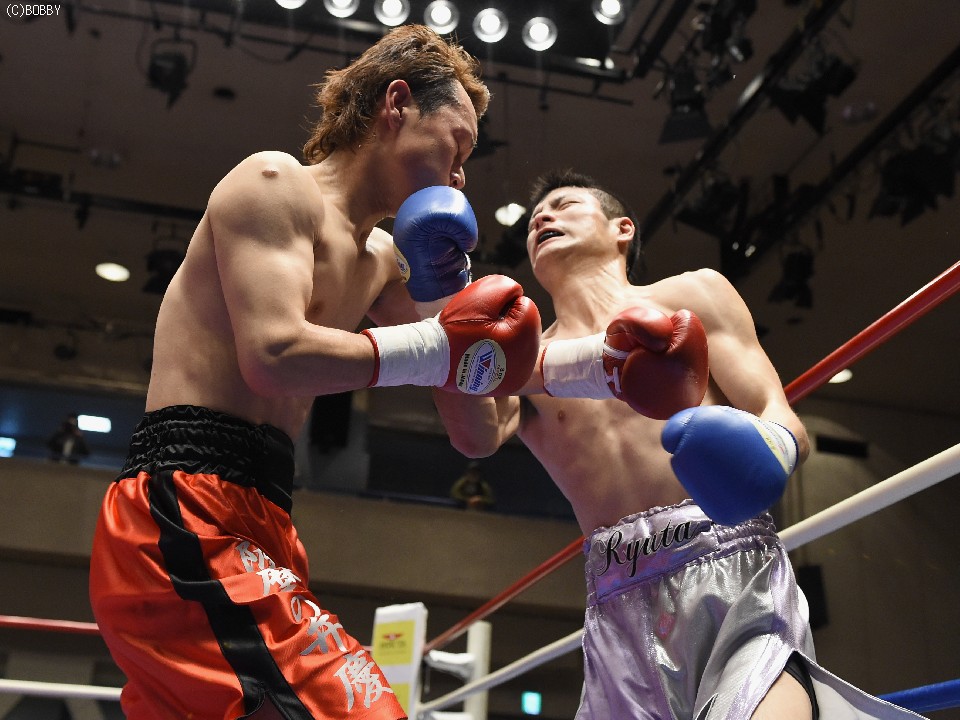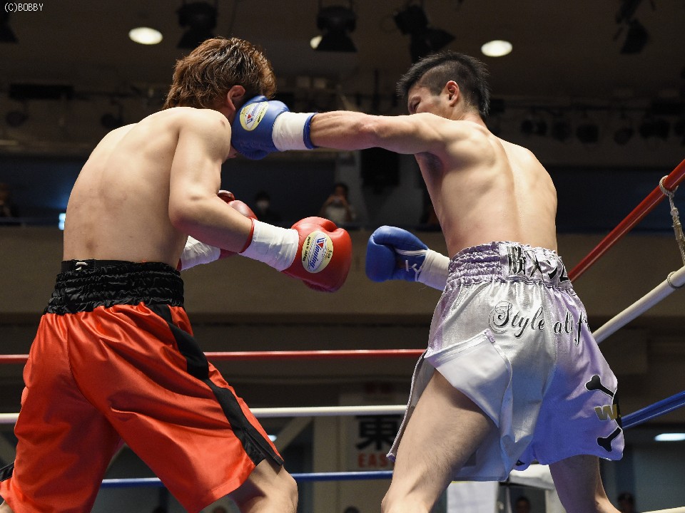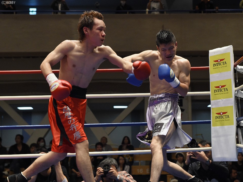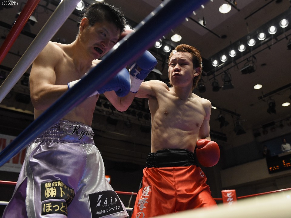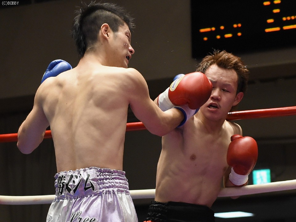 試合:デビュー戦のサウスポー窪が、まずはジャブ、左ストレートを上下に打ち分けては大内をロープに詰める。しかし、大内も距離を取りジャブを突いては右を狙うと、2Rに左を伸ばしダウンを先制。立ち上がった窪を一気に仕留めにかかったが、打ち合いの中で右フックから左を返され逆に倒されてしまった。3Rは互いに距離を警戒し一呼吸置いたが、最終4Rは先手の取り合いから打撃戦に発展。どちらも譲らぬ攻防となった。