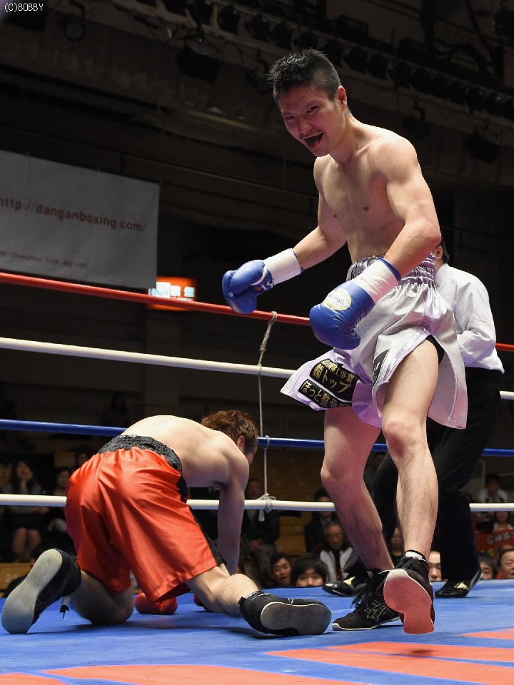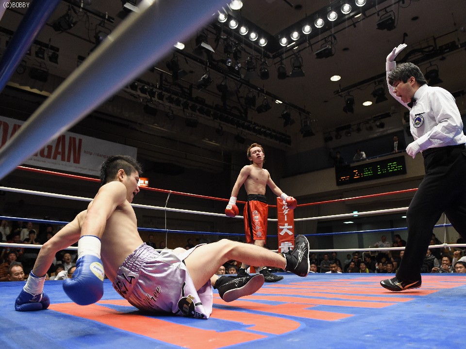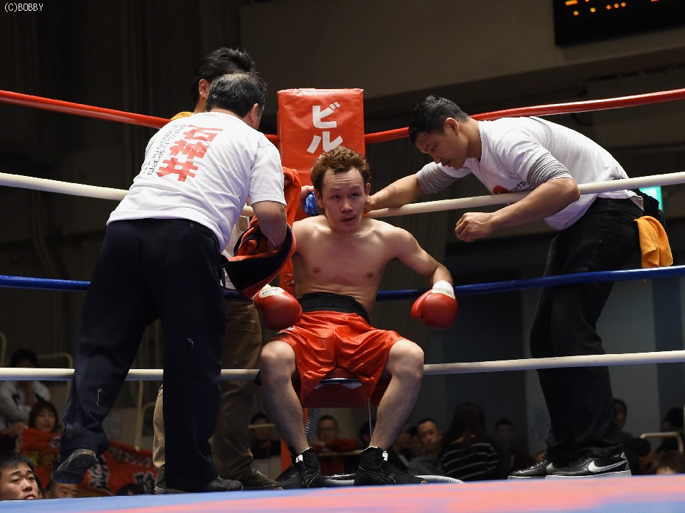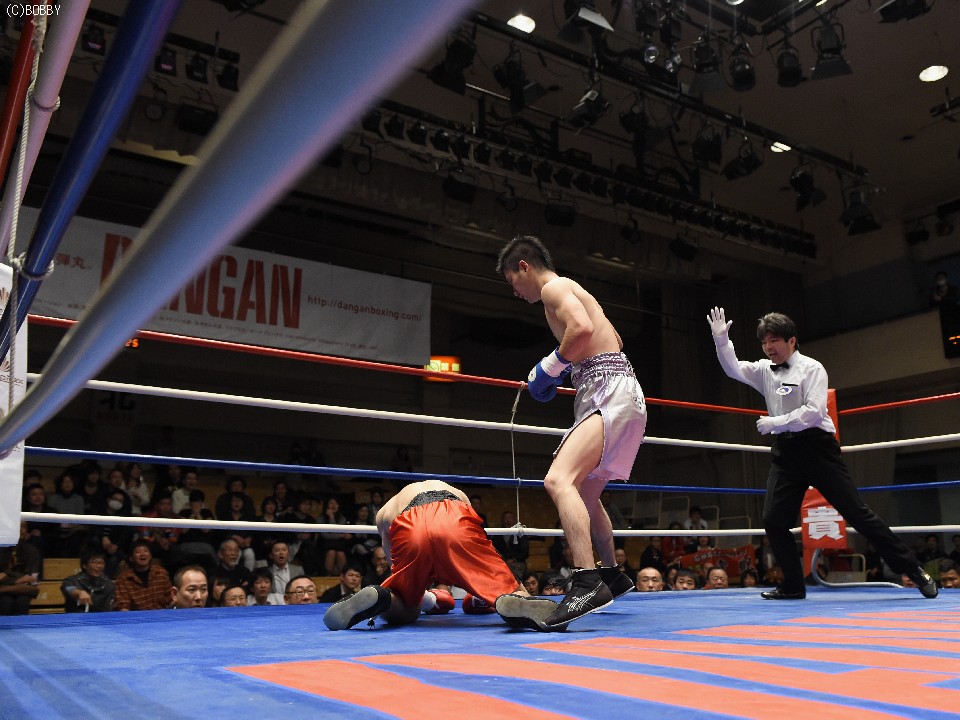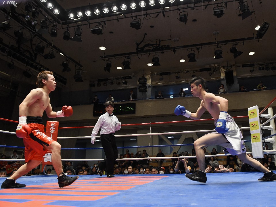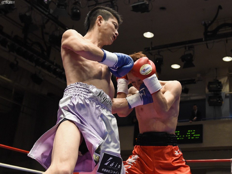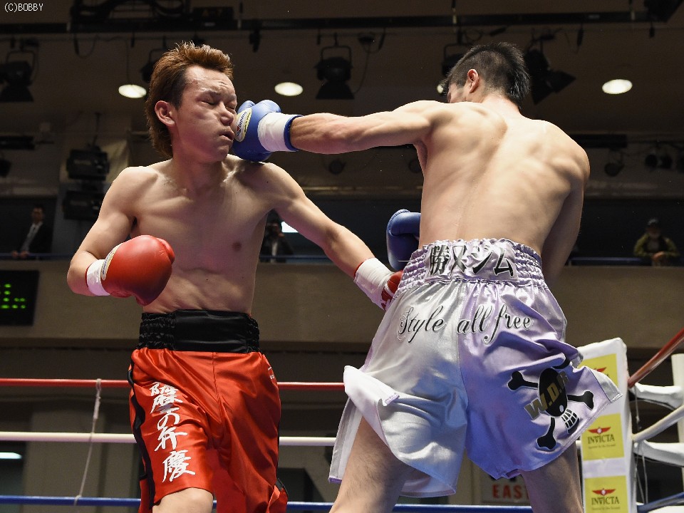 試合:デビュー戦のサウスポー窪が、まずはジャブ、左ストレートを上下に打ち分けては大内をロープに詰める。しかし、大内も距離を取りジャブを突いては右を狙うと、2Rに左を伸ばしダウンを先制。立ち上がった窪を一気に仕留めにかかったが、打ち合いの中で右フックから左を返され逆に倒されてしまった。3Rは互いに距離を警戒し一呼吸置いたが、最終4Rは先手の取り合いから打撃戦に発展。どちらも譲らぬ攻防となった。