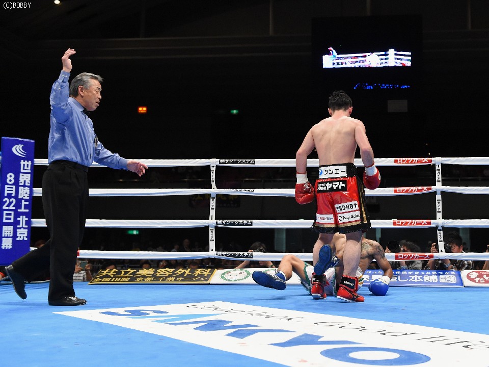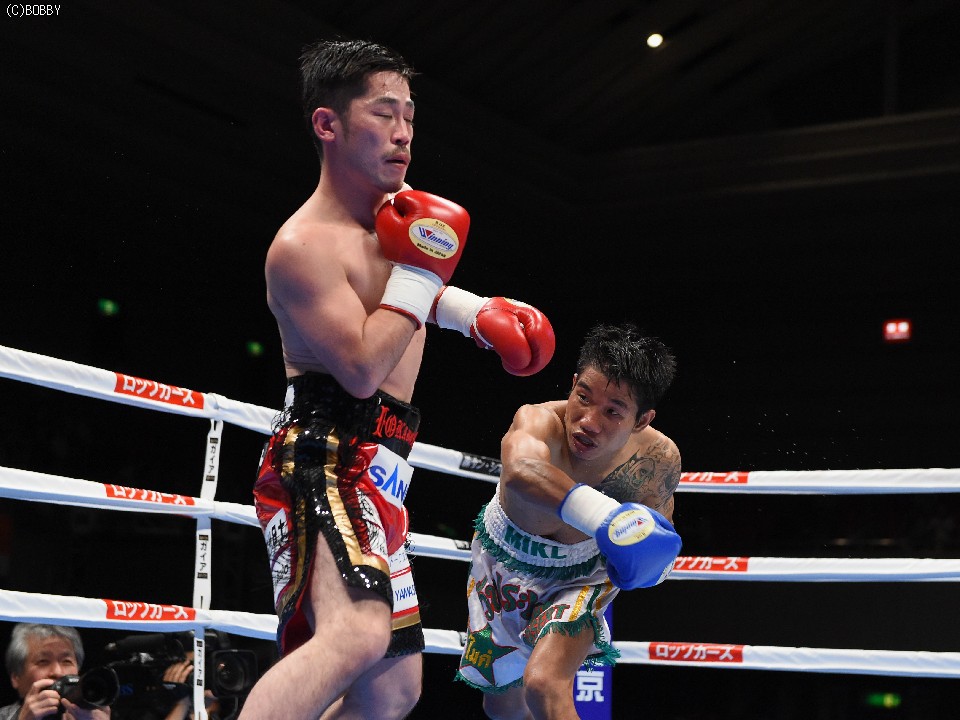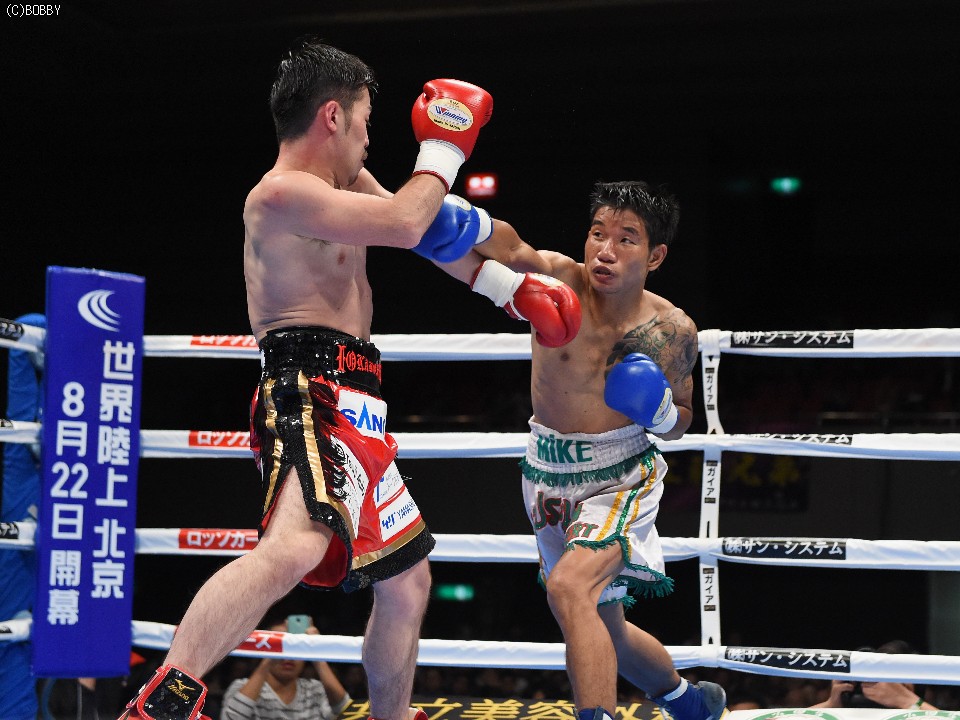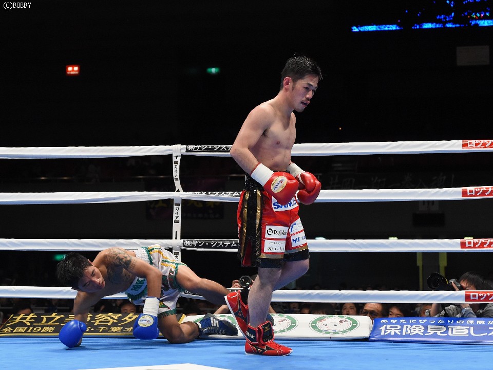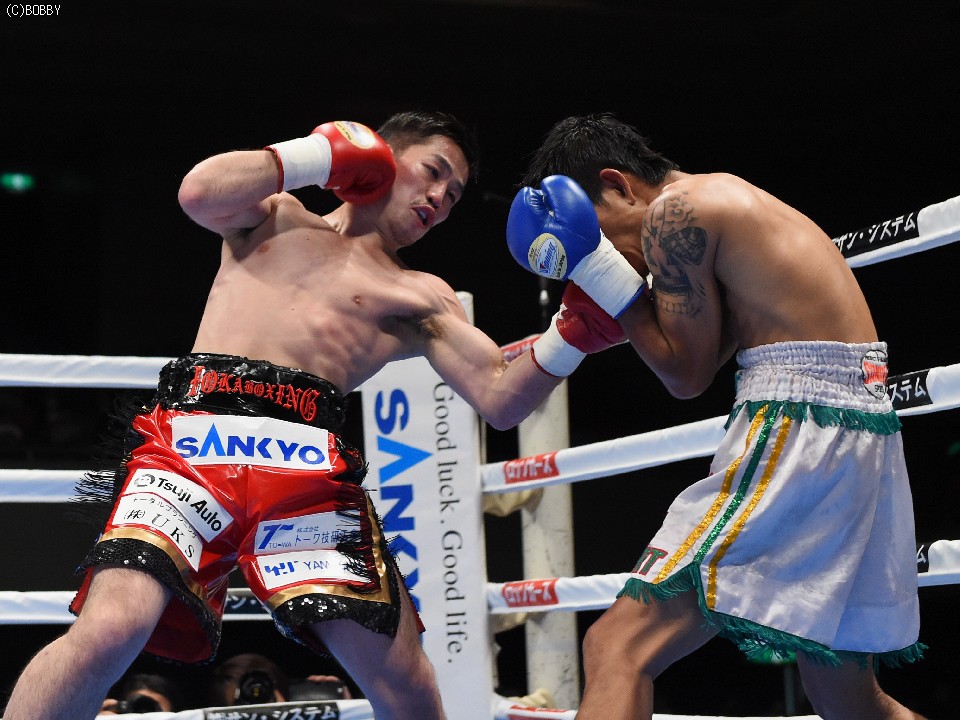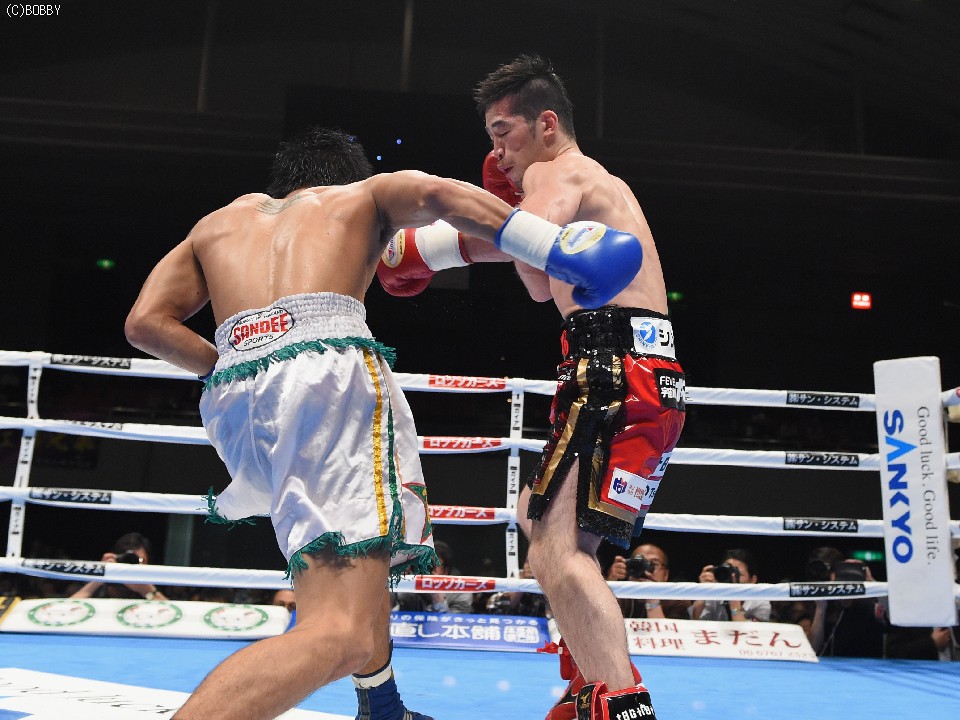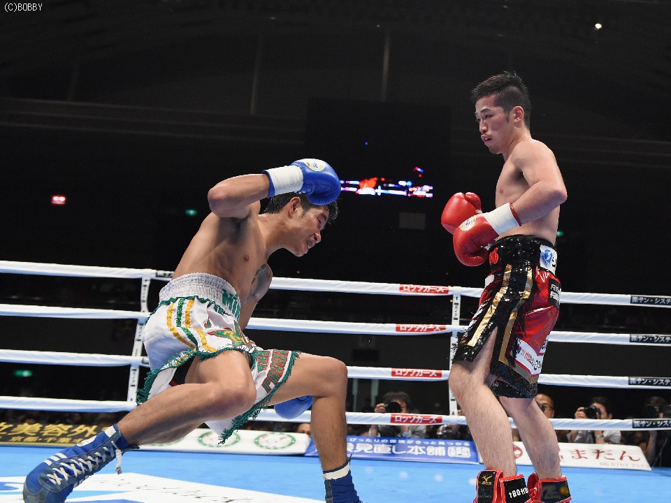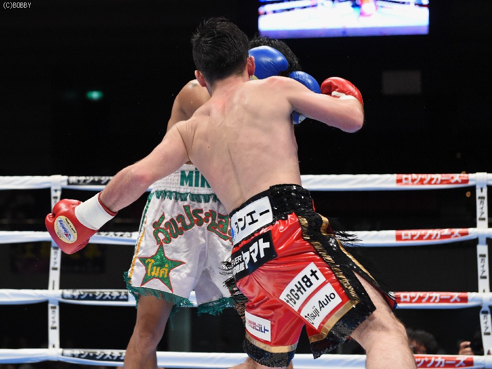 試合:序盤、ジャブの刺し合いになるが宮崎のジャブの方が的確に決まる。2R、左ボディアッパーから顔面へのコンビネーションでペースを握る。3R、宮崎の左アッパーの連打から右ストレートがドンピシャで決まりダウンを奪う。4R、フィニッシュは時間の問題となった宮崎は慌てることなく2度のダウンを奪い、ナムポンは立ち上がったが最後はレフェリーが抱きかかえ試合をストップした。