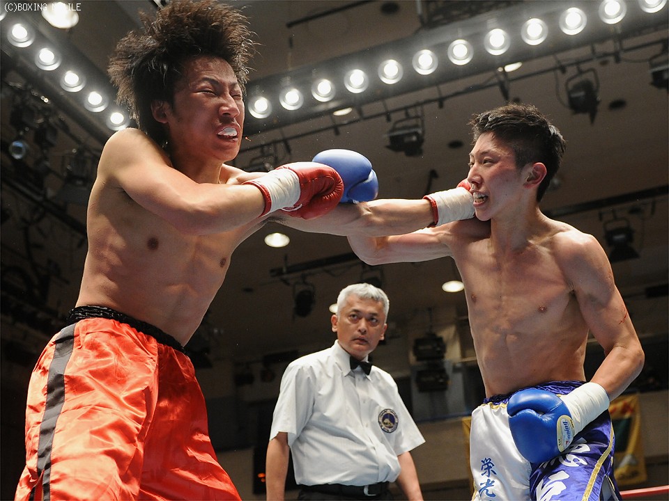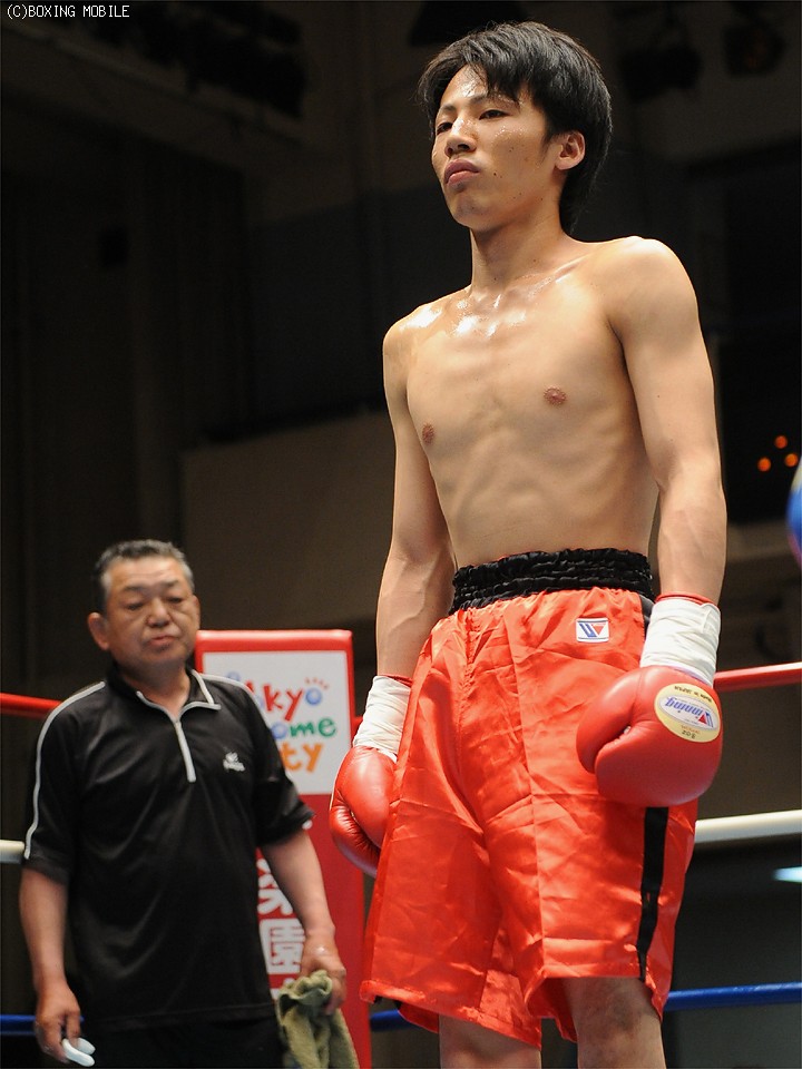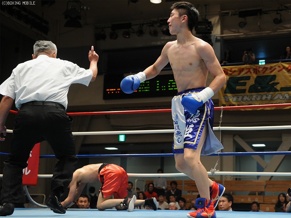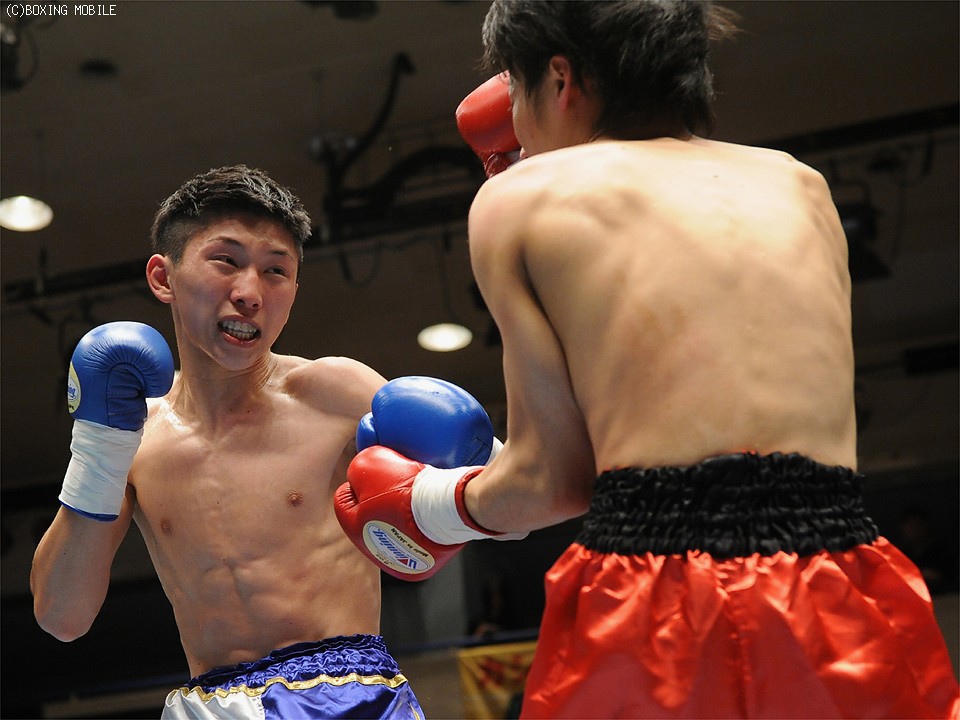 試合:17歳の神津がジャブから伸びのあるストレートを再三ヒット。神津のテンポの良いワンツーに後退していた平原だが、1分過ぎに右ショートカウンターが決まると神津はバランスを崩してダウン。しかし神津はダメージは少なく回転を強め、2分には逆にダウンを奪い返す。2R、ダメージの残る平原にここが勝負とみた神津はボディもまじえたコンビショーンを放つと防戦一方になった平原を見てレフェリーは試合を止めた。