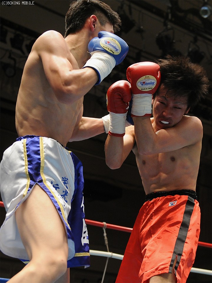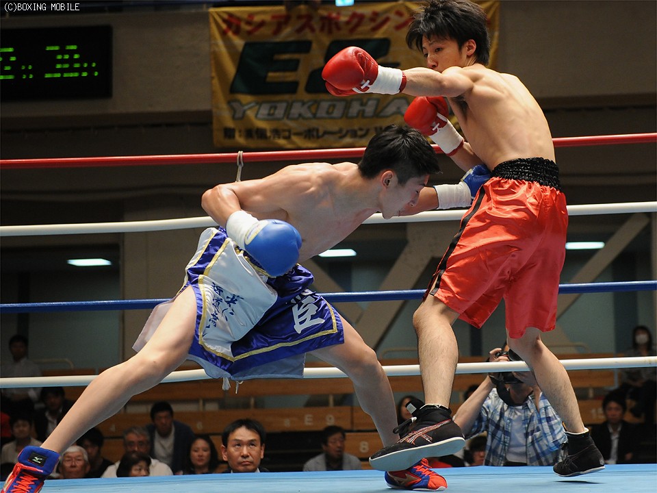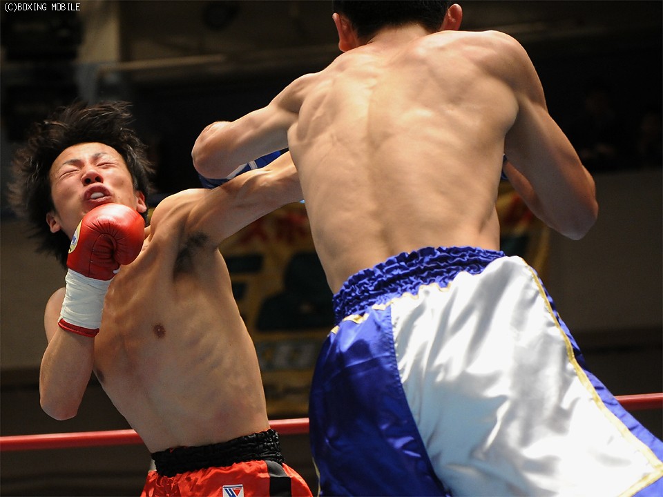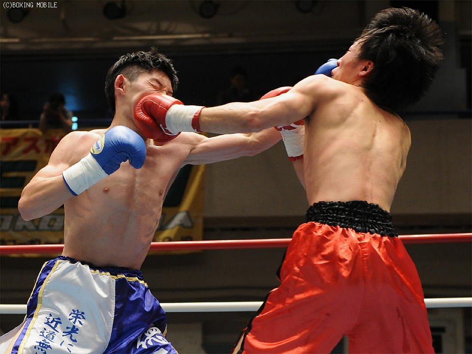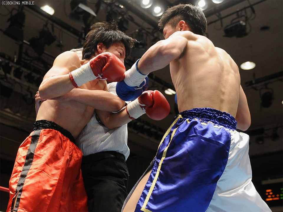 試合:17歳の神津がジャブから伸びのあるストレートを再三ヒット。神津のテンポの良いワンツーに後退していた平原だが、1分過ぎに右ショートカウンターが決まると神津はバランスを崩してダウン。しかし神津はダメージは少なく回転を強め、2分には逆にダウンを奪い返す。2R、ダメージの残る平原にここが勝負とみた神津はボディもまじえたコンビショーンを放つと防戦一方になった平原を見てレフェリーは試合を止めた。