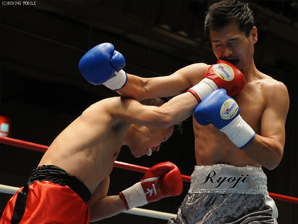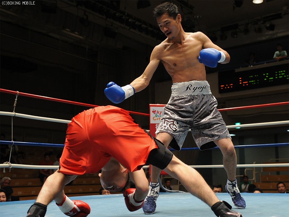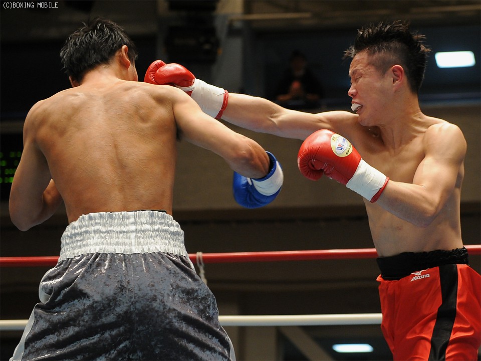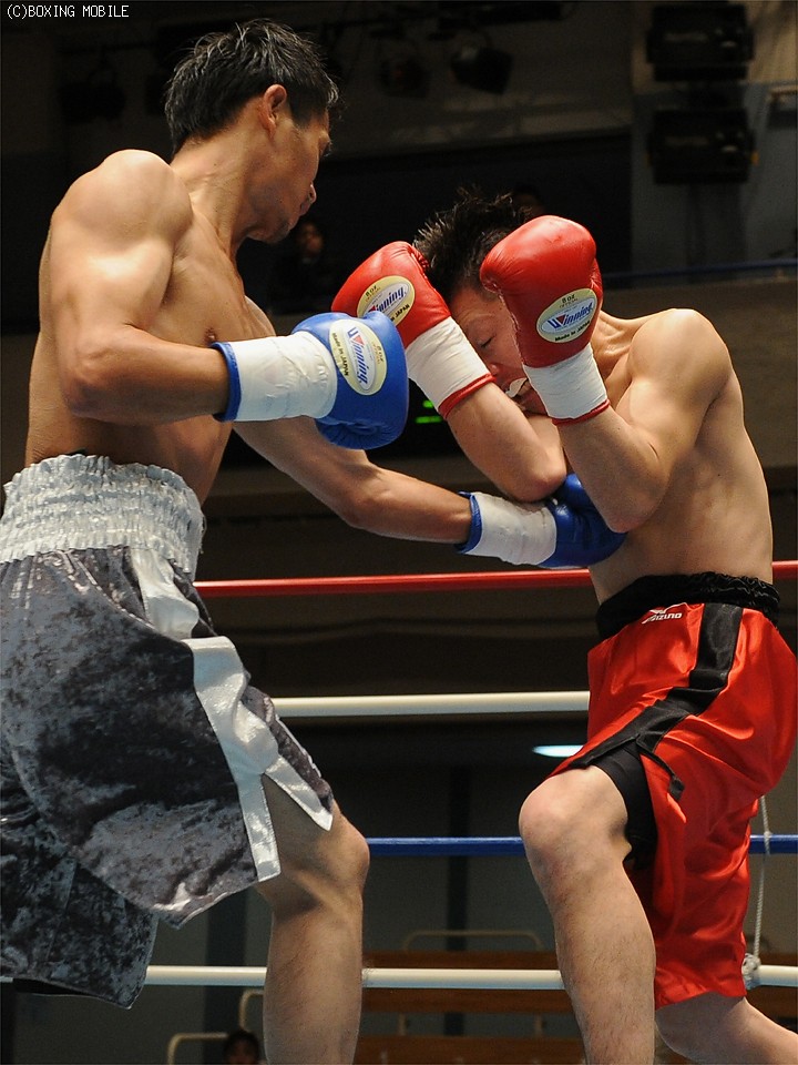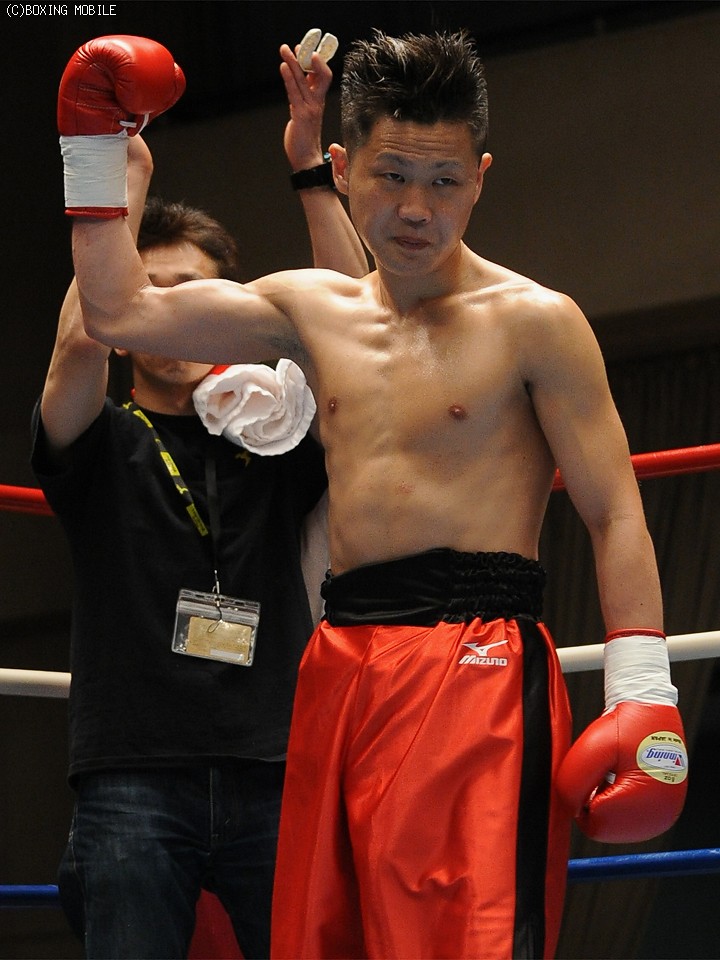 試合:菊地がワンツーの連打を繰り出すが、サウスポー福永は冷静に距離を取り上下にパンチを散らすと菊地は後退。最初に左右のアッパーでダウンを奪い、立ち上がってきたきたところを最後は左ストレートで仕留めた。