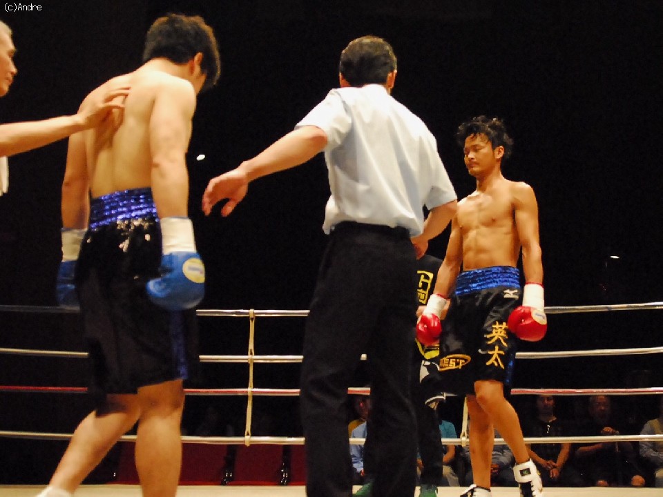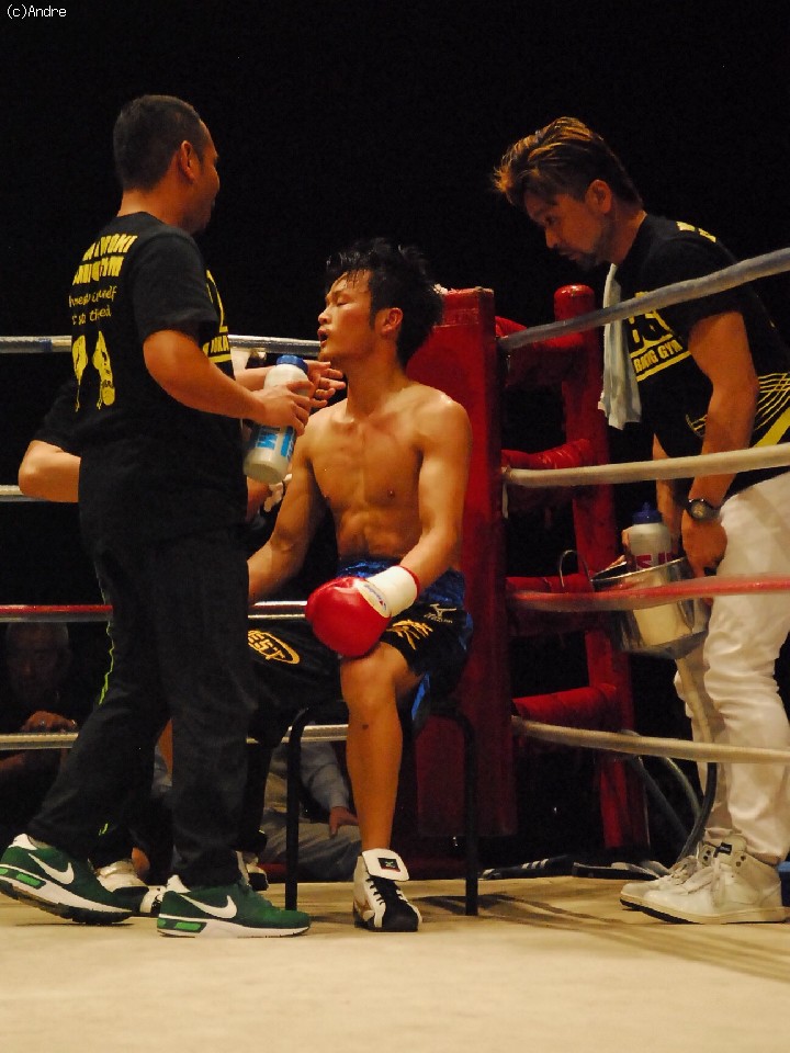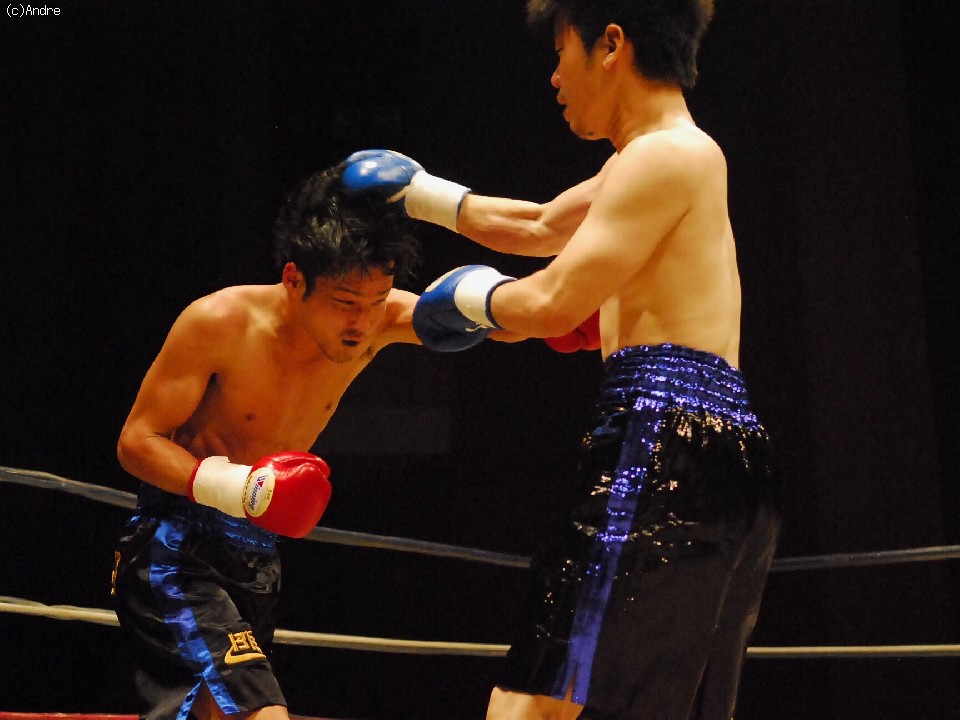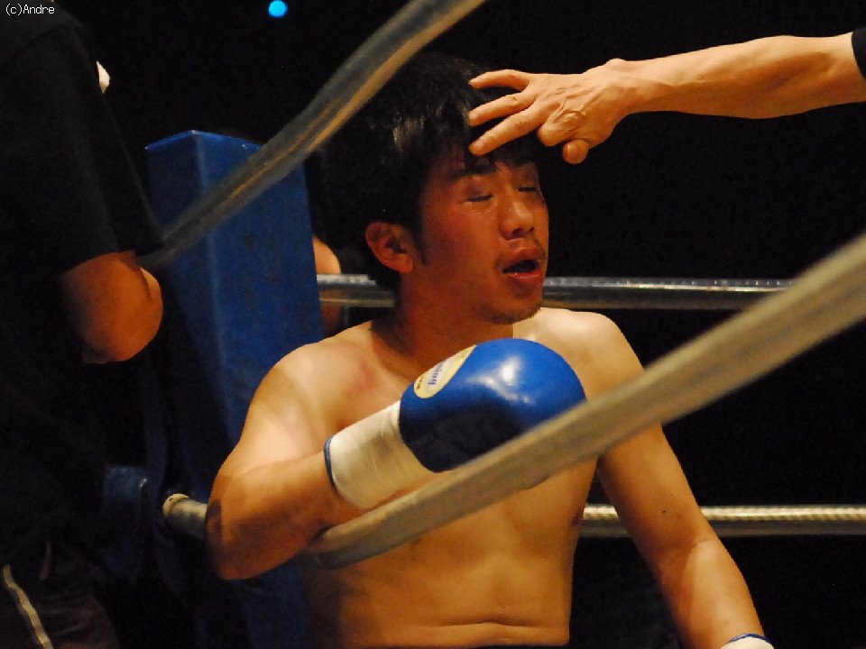 試合:序盤から打ち合う両者。東はワンツーから前に出ると左右のボディを打つ。対して、デビュー戦の三宅は打たれながらも前に出ると左右のフックを振るう。1R終了時、東のヒッティングによる三宅の右目の負傷が深く三宅陣営が棄権。
