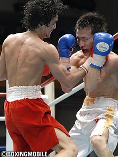 試合:序盤、両者ジャブで距離をはかる静かな立ち上がり。サウスポー山中は右ジャブで距離を取りたいが、船井は距離を詰めたいのか、山中の左ストレートとの打ち合いになると距離が接近してしまいクリンチが多くなる。中盤、船井が飛び込んで来た所に、山中の左ストレートがカウンターでヒットし、船井痛恨のダウン。ラウンドを凌ぐが、このダウンで船井は右目上をヒッティングでカット。山中は左ストレートの距離を把握したのか、的確に左ストレート・左アッパーをヒットさせペースを奪う。船井も反撃に出るが左フック・右ストレートが大降りに。7Rに入ると山中が左ストレートを軸に猛然とラッシュを掛ける。左ストレート・右フック・左アッパーがヒットすると、船井はロープに釘付けとなり、船井サイドからタオルが投入され試合終了。山中がTKOで船井を降し、ランカーの実力を発揮した。