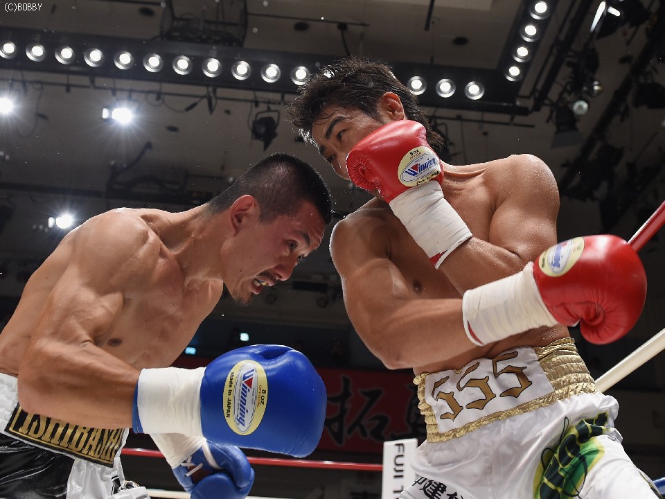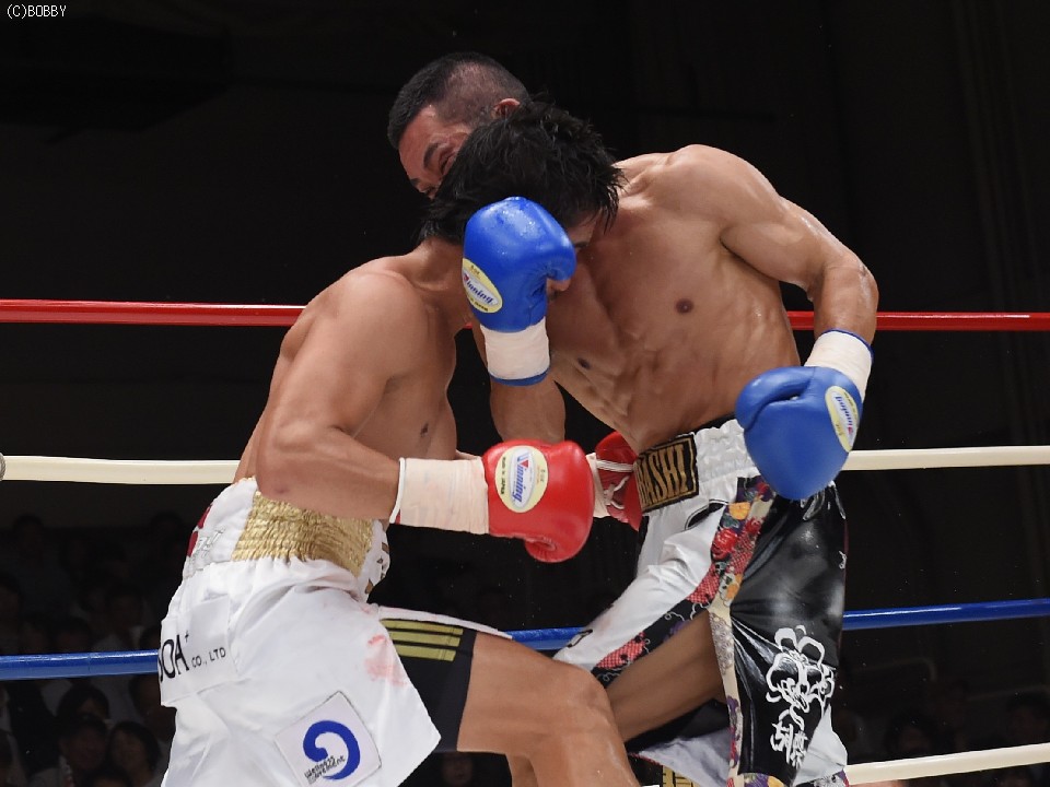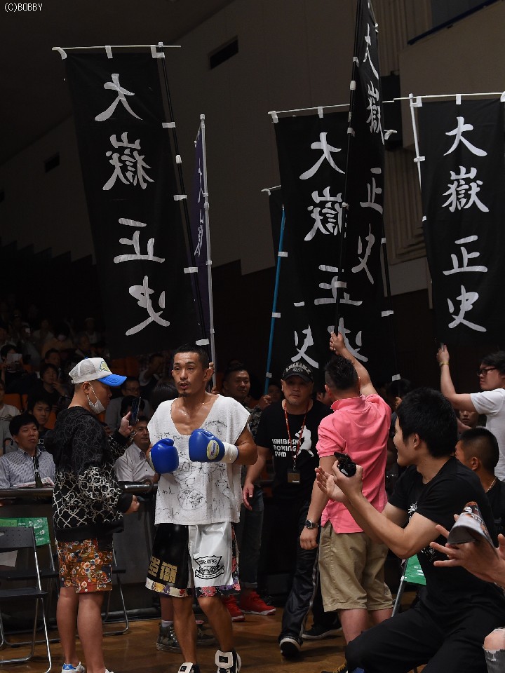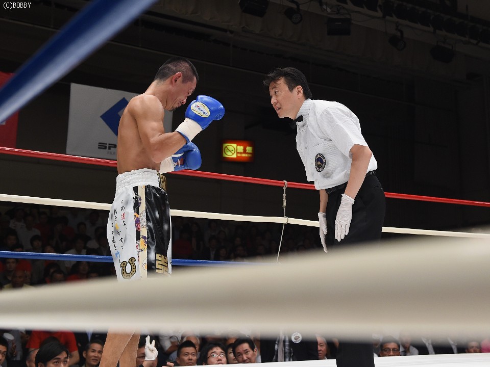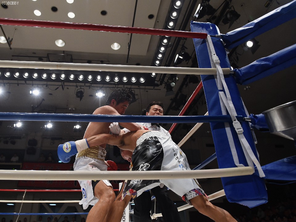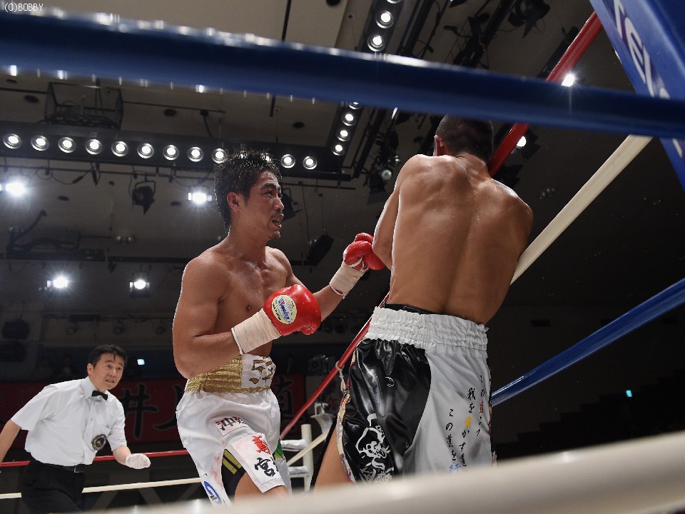 試合:2012年に日本王座決定戦で敗退(帝里に判定負け)して以来、7連勝中の翁長と3度目の日本ランカーへの挑戦となる大嶽の対戦。初回、両者フェイントをかけながら様子を見ていたが、サウスポー翁長の鋭い左ストレートが命中、大嶽はダウンを喫してしまう。2R、接近戦に持ち込みたい大嶽は頭を振りながら懐に飛び込もうとするが、翁長のステップワークに自分の距離にさせてもらえない。ペースを握った翁長は左ストレートからの返しの右フックが徐々に決まり、ダメージを与えていく。4R、被弾しながら前進を続ける大嶽がロープに詰め、右ストレートで顔をのけぞらせる場面も作るが、翁長がパンチを上下に散らしペースを譲らない。中盤、勝負を決めたい翁長が左ストレートを再三ヒットさせるが、大嶽の粘りもあり攻めあぐねてしまう。6R、終了間際、翁長の左から連打が決まり棒立ちとなったところでレフェリーはロープダウンを宣告。7R、懸命に抵抗を続けた大嶽だったが、ダメージの深さを見たレフェリーが抱きかかえた。