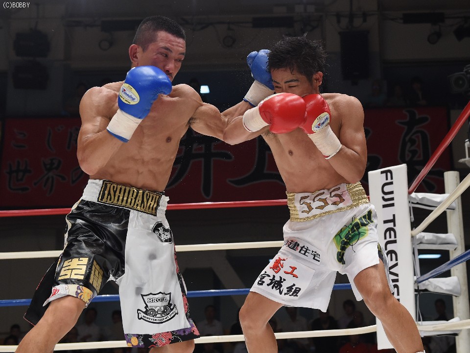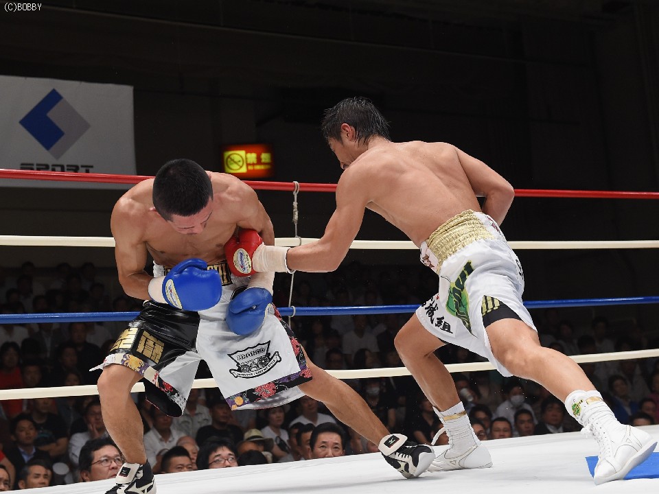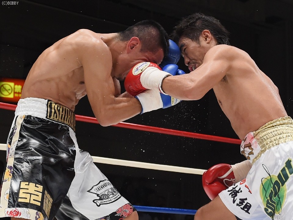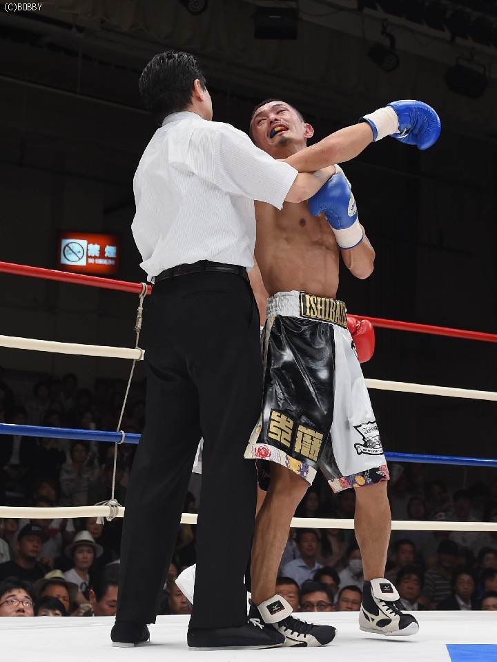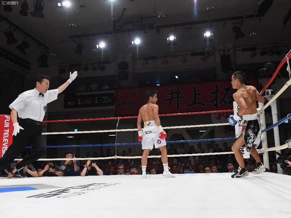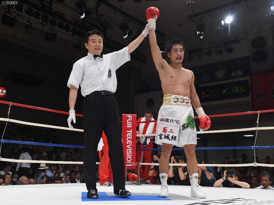 試合:2012年に日本王座決定戦で敗退(帝里に判定負け)して以来、7連勝中の翁長と3度目の日本ランカーへの挑戦となる大嶽の対戦。初回、両者フェイントをかけながら様子を見ていたが、サウスポー翁長の鋭い左ストレートが命中、大嶽はダウンを喫してしまう。2R、接近戦に持ち込みたい大嶽は頭を振りながら懐に飛び込もうとするが、翁長のステップワークに自分の距離にさせてもらえない。ペースを握った翁長は左ストレートからの返しの右フックが徐々に決まり、ダメージを与えていく。4R、被弾しながら前進を続ける大嶽がロープに詰め、右ストレートで顔をのけぞらせる場面も作るが、翁長がパンチを上下に散らしペースを譲らない。中盤、勝負を決めたい翁長が左ストレートを再三ヒットさせるが、大嶽の粘りもあり攻めあぐねてしまう。6R、終了間際、翁長の左から連打が決まり棒立ちとなったところでレフェリーはロープダウンを宣告。7R、懸命に抵抗を続けた大嶽だったが、ダメージの深さを見たレフェリーが抱きかかえた。