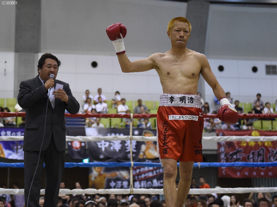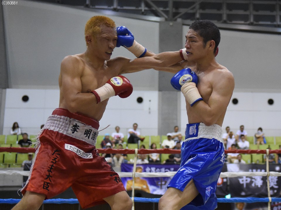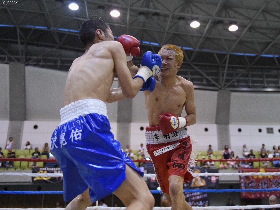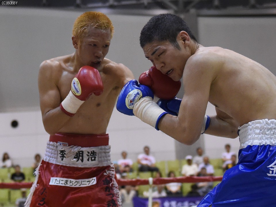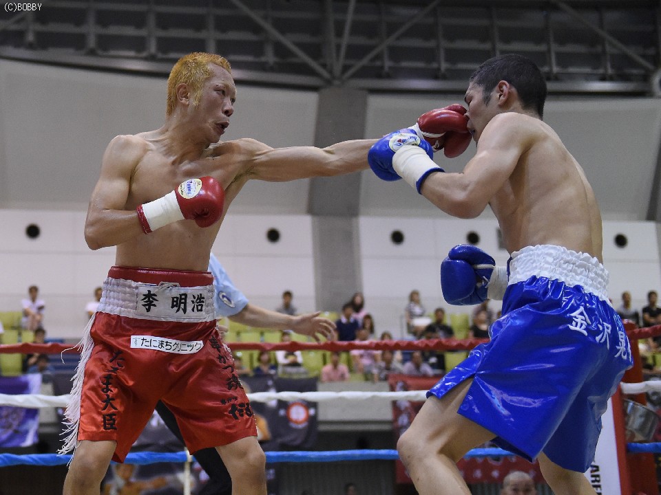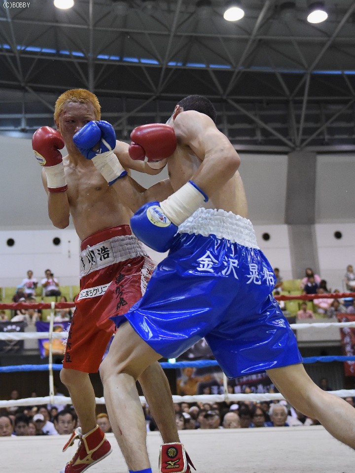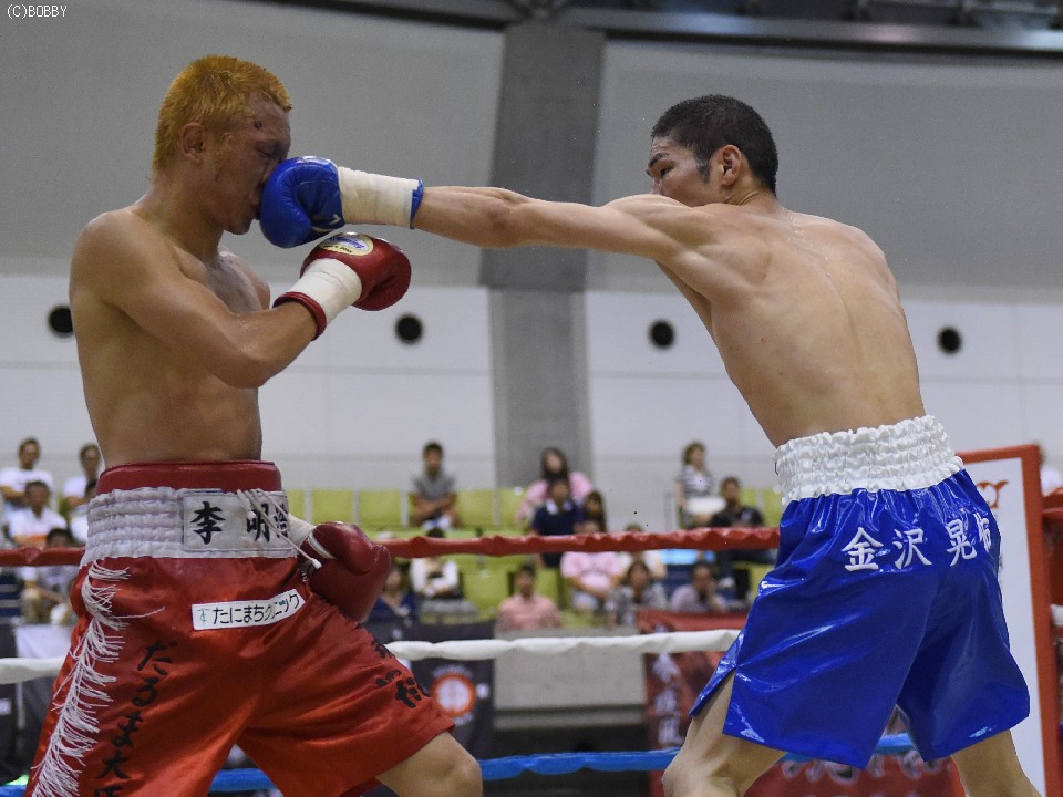 試合:日本・東洋太平洋ランカー李に金沢が挑んだ一戦。初回終了間際に連打の打ち合いから李の左フックが当たって金沢はバランスを崩したが追撃は逃れた。リング中央で連打を打ち合った両者は3回、クリンチはないままパンチの速さと的中率で競ったが決定打には恵まれず。両者が勢いよく飛び出していった4回、プレスを強めたのは金沢。李はバックステップしてパンチを交わして主導権を譲らず。5回、李の左アッパーに金沢の足元が乱れたが下がって追撃を回避。続く6回、李の右ストレートがオープニングパンチとなったが金沢はダメージを感じさせずに左ボディからの手数でしのぐ。この回、李の有効打で金沢は右眉を負傷。インターバル中、セコンドの指示に大きな声で「はい」と答えた李は7回、金沢の右ストレートを受けながらも速いワンツーの連続でロープ際からの難を逃れた。8回、李の右ストレートに何度も腰を落とした金沢だったがダウンは免れた。李が大きくリングを使った最終回、前に出た金沢、パンチで応戦した李。試合は判定に。