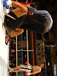 2006年全日本新人王の出田は9連勝中。上体を振りながらリズムよく前に出る出田に対し、左右の大振りで対抗するプラムアル。詰め寄りながらボディから打ちおろし気味に放った出田の右でプラムアルがリングに沈んだ。