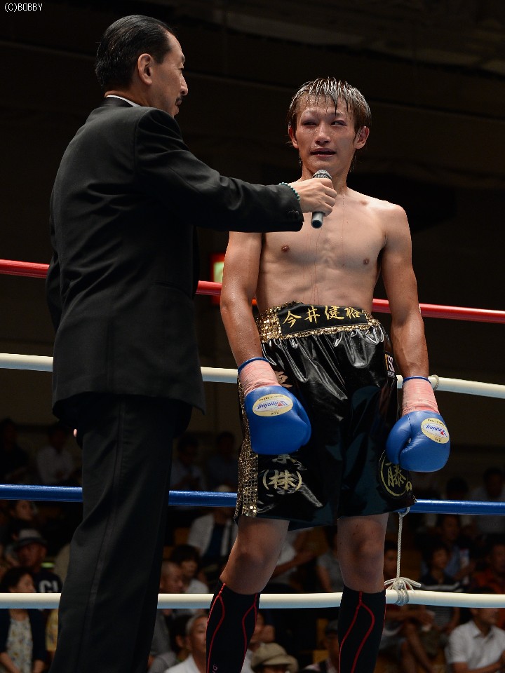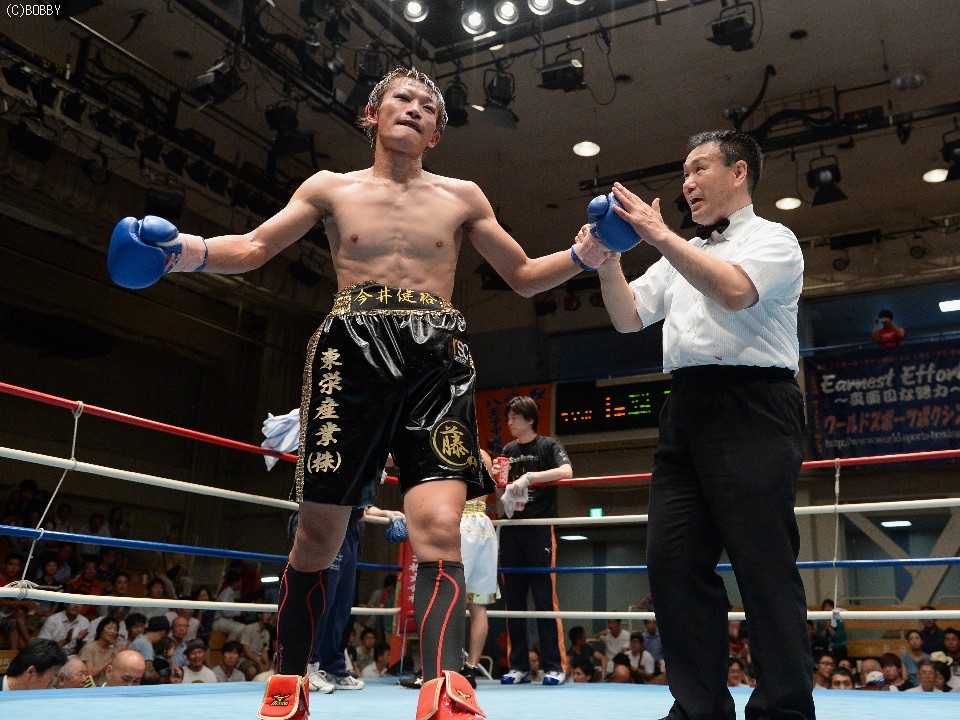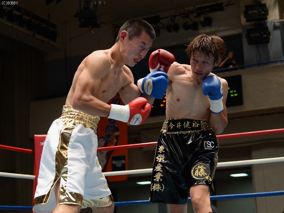 試合:本日2組目のデビュー対決。スピードで上回る今井がワンツーから右の強打で先制した。足がありながらも敢えて打ち合いを望み、松本がコツコツと繰り出すパンチも多く被弾したが、ワンツー、フック、アッパーと多彩なパンチで最後まで押し続け、フルマークの判定勝ちを飾った。