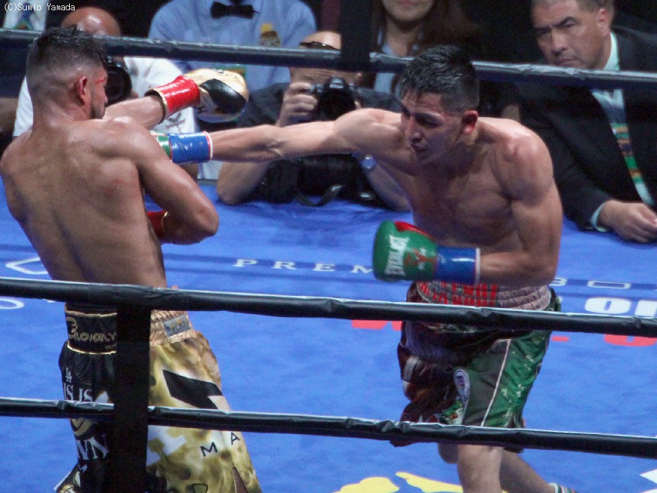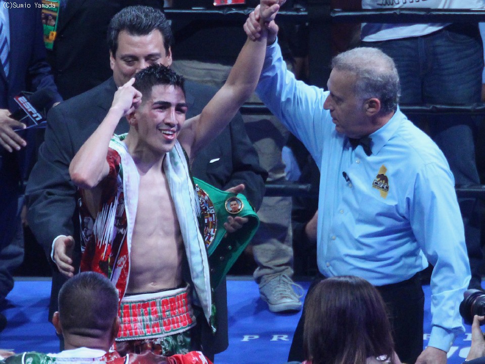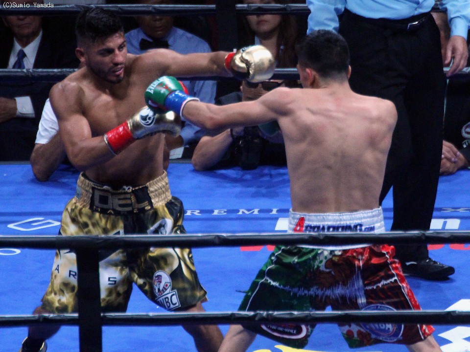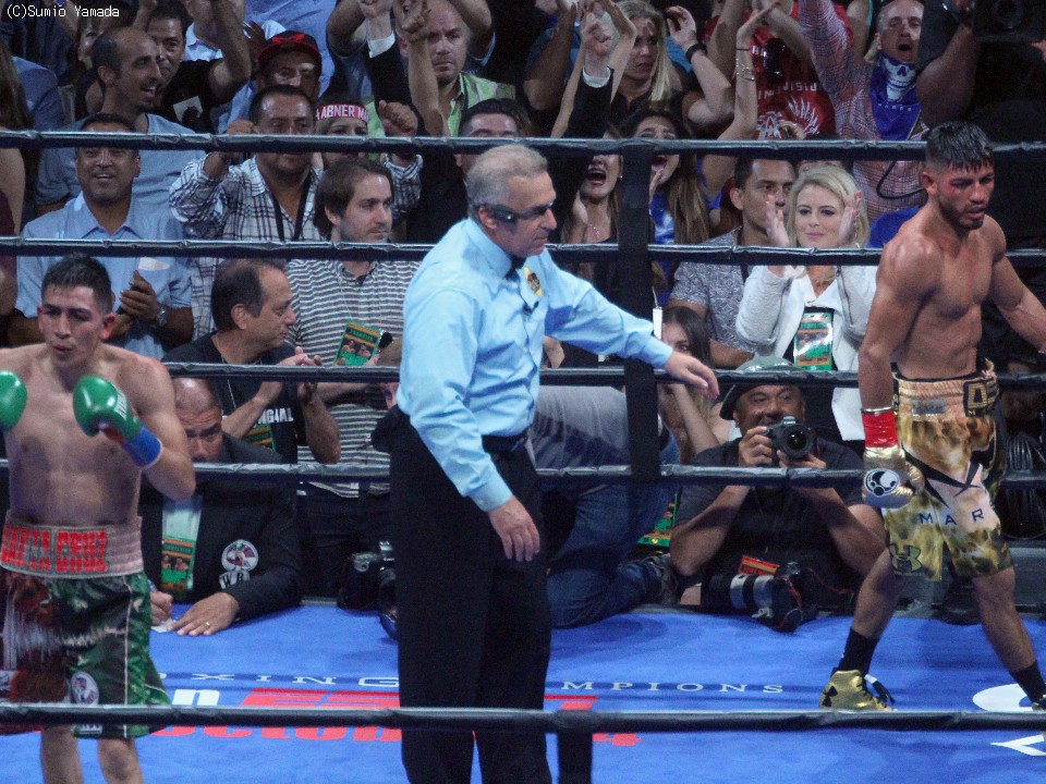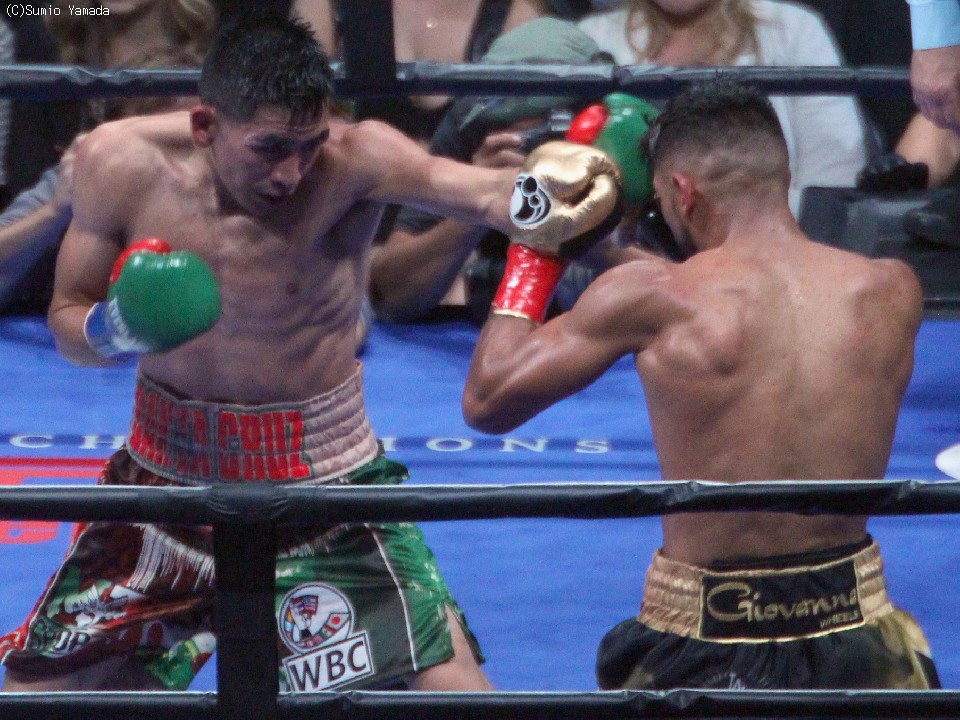 バンタム級からスーパーバンタム級、そしてフェザー級と常に先に制覇してきたマレスが積極的に距離を詰めるかたちで試合はスタートした。ファイター型のサンタ・クルスが戸惑うかと思われたが、そこは無敗の王者。慌てることなく中長距離を保ってボクシングに徹した。拮抗したラウンドが続いたが、パンチの正確さでサンタ・クルスが上回って試合は終盤に。このころになると両者の目の周辺は激闘を物語るように腫れ上がっていた。激しいパンチの交換は最終回まで続き、会場を埋めた1万3000人以上のファンは両者に大歓声を送った。採点はひとりが114対114のイーブンとしたが、残る二者は117対111でサンタ・クルスに軍配を挙げた。WBCのダイヤモンド・ベルトとWBAのスーパー王座を獲得したサンタ・クルスは32戦31勝(17KO)1分、敗れたマレスは32戦29勝(15KO)2敗1分。