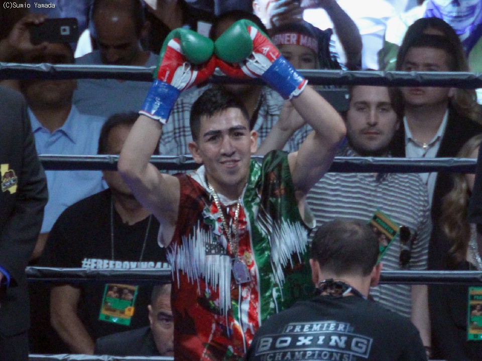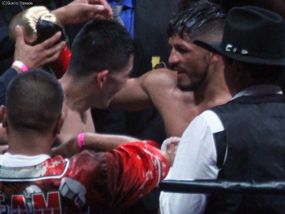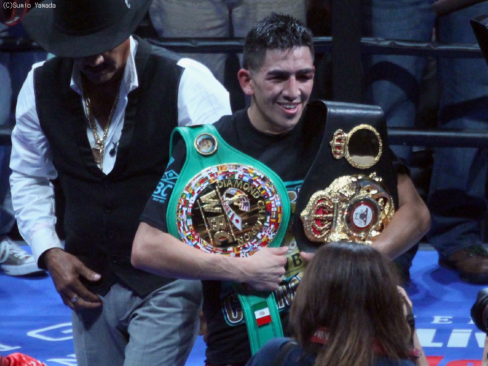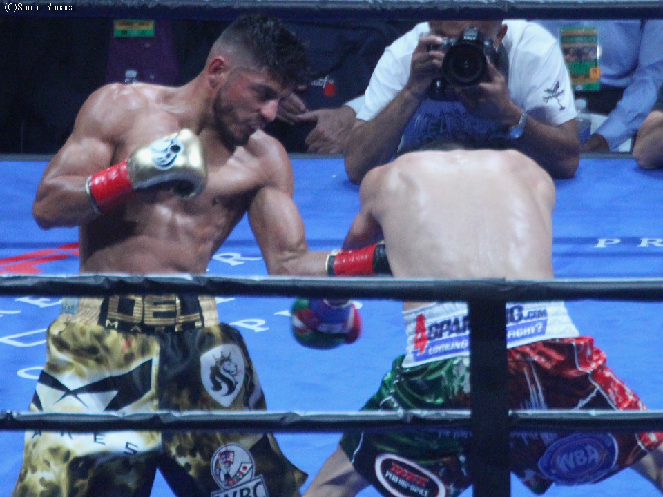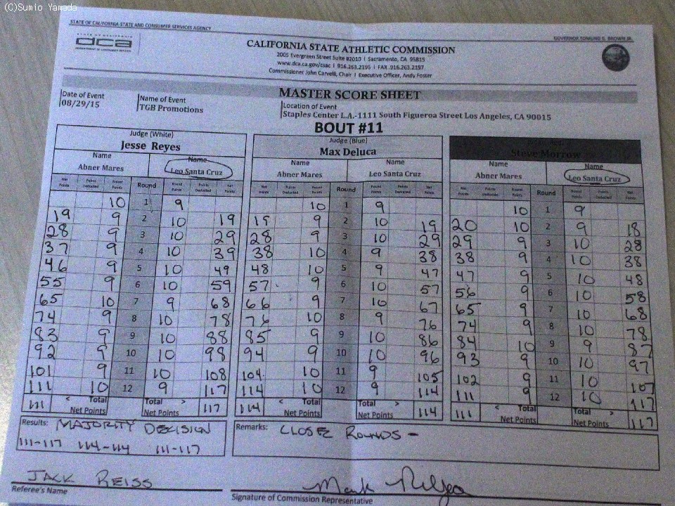 バンタム級からスーパーバンタム級、そしてフェザー級と常に先に制覇してきたマレスが積極的に距離を詰めるかたちで試合はスタートした。ファイター型のサンタ・クルスが戸惑うかと思われたが、そこは無敗の王者。慌てることなく中長距離を保ってボクシングに徹した。拮抗したラウンドが続いたが、パンチの正確さでサンタ・クルスが上回って試合は終盤に。このころになると両者の目の周辺は激闘を物語るように腫れ上がっていた。激しいパンチの交換は最終回まで続き、会場を埋めた1万3000人以上のファンは両者に大歓声を送った。採点はひとりが114対114のイーブンとしたが、残る二者は117対111でサンタ・クルスに軍配を挙げた。WBCのダイヤモンド・ベルトとWBAのスーパー王座を獲得したサンタ・クルスは32戦31勝(17KO)1分、敗れたマレスは32戦29勝(15KO)2敗1分。