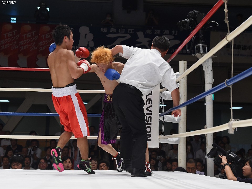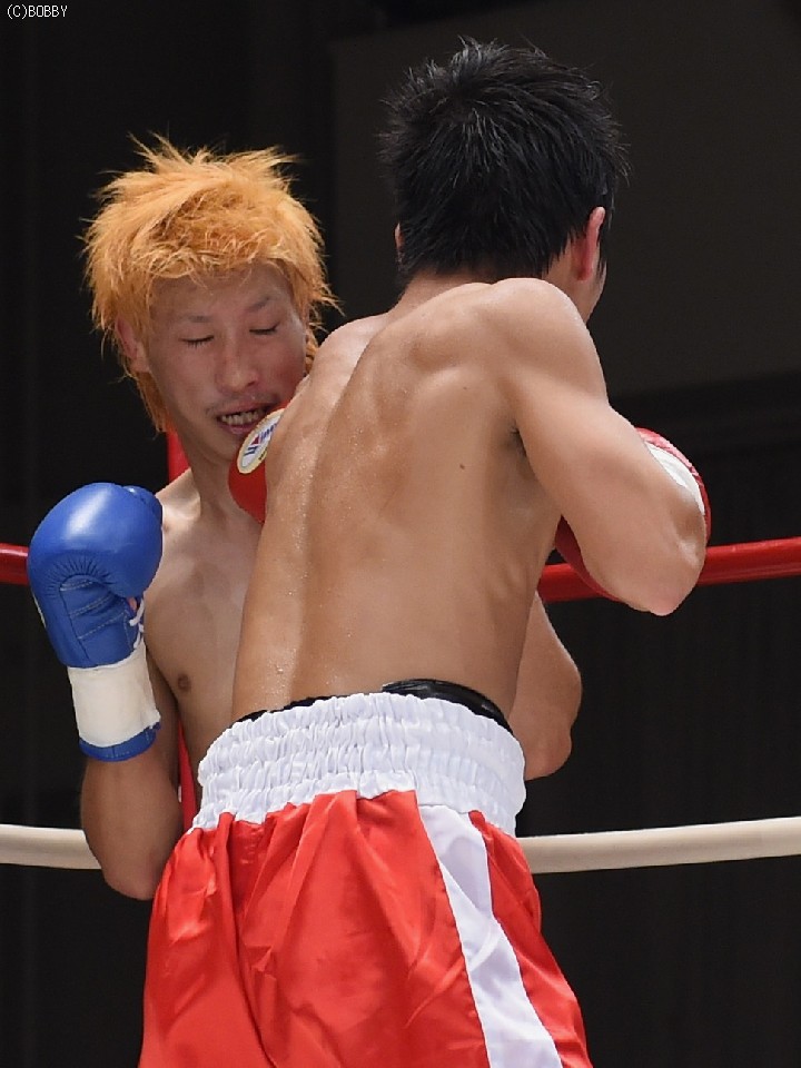 試合:2戦目の福田に対するは、後楽園ホールでは2戦2勝とゲンのいいかべりーん。積極的に前に出る福田をジャブで捌く立ち上がりから、ワンツーの手数にこちらもワンツー、フックで応戦。しかし2R、開始からワンツー連打に捕まり、右を効かされダウン。再開後はなんとか食らいついたが、ジャブで突き放せず、最後はフック、アッパーを追加されたところでレフェリーストップとなった。福田はこれで2戦2KO。