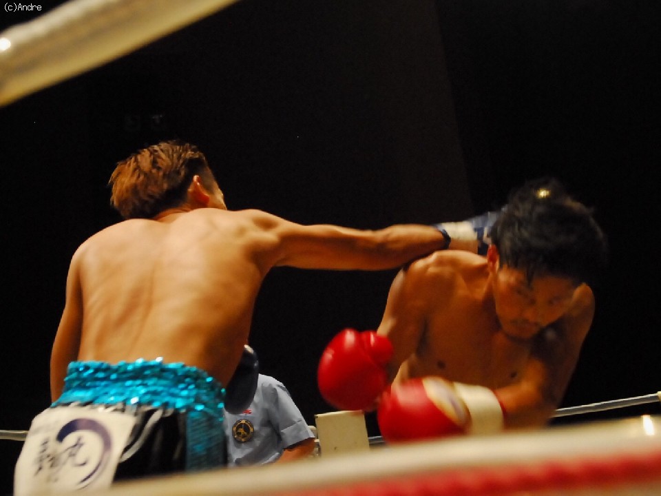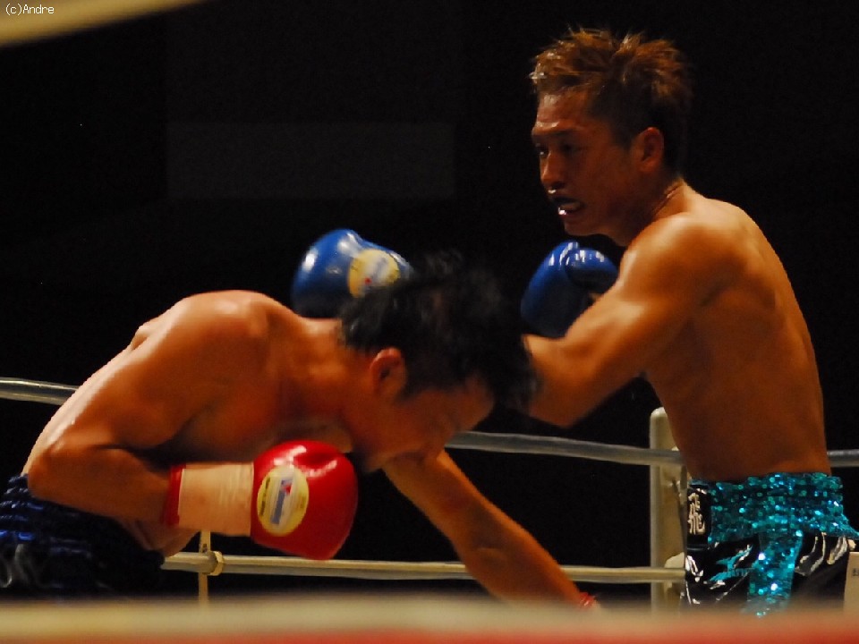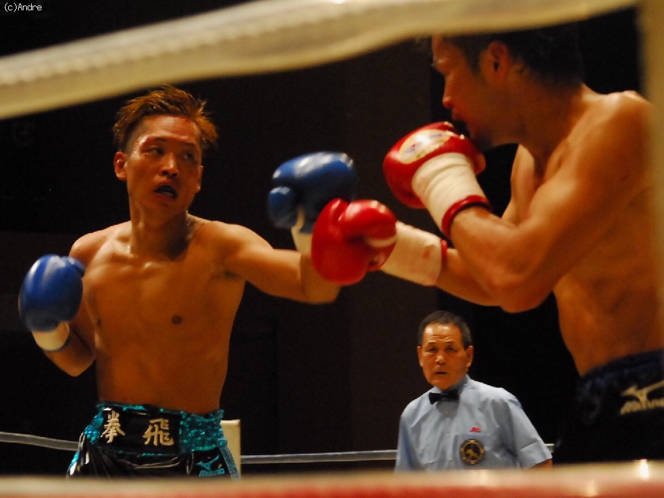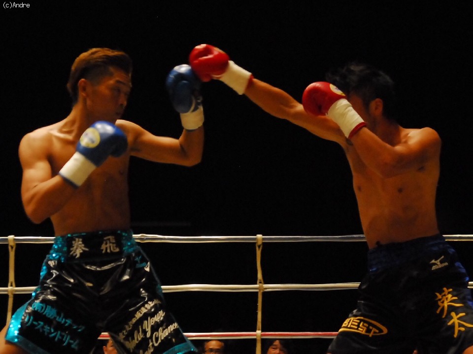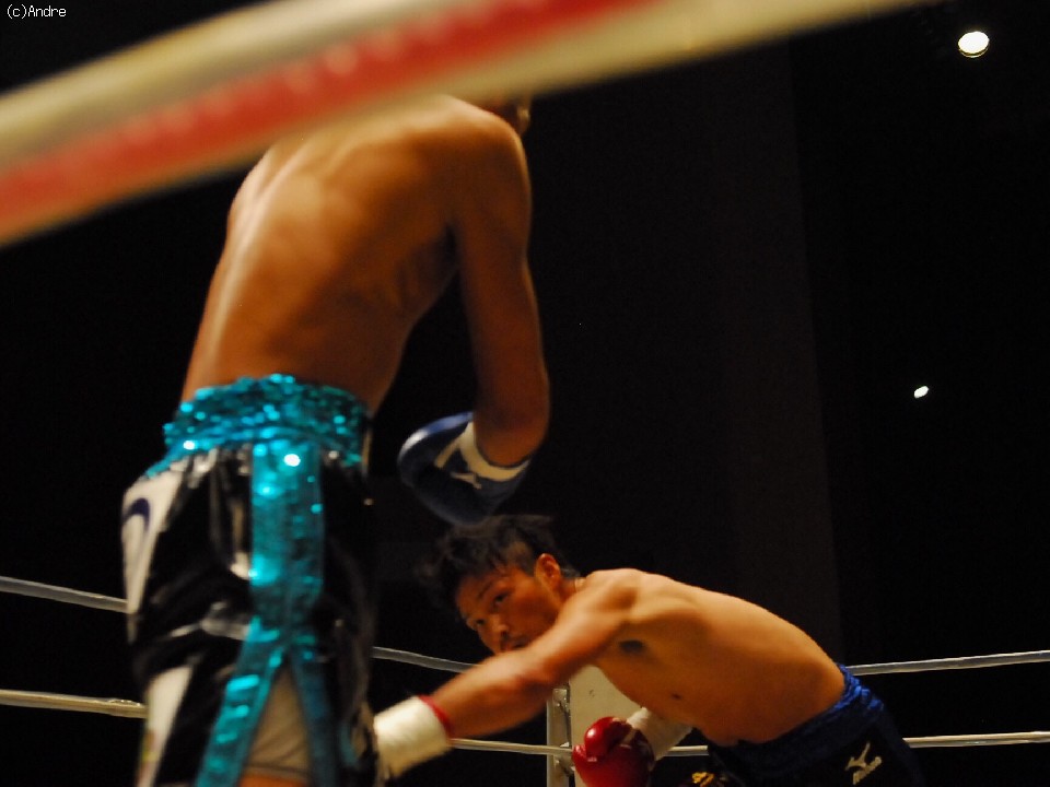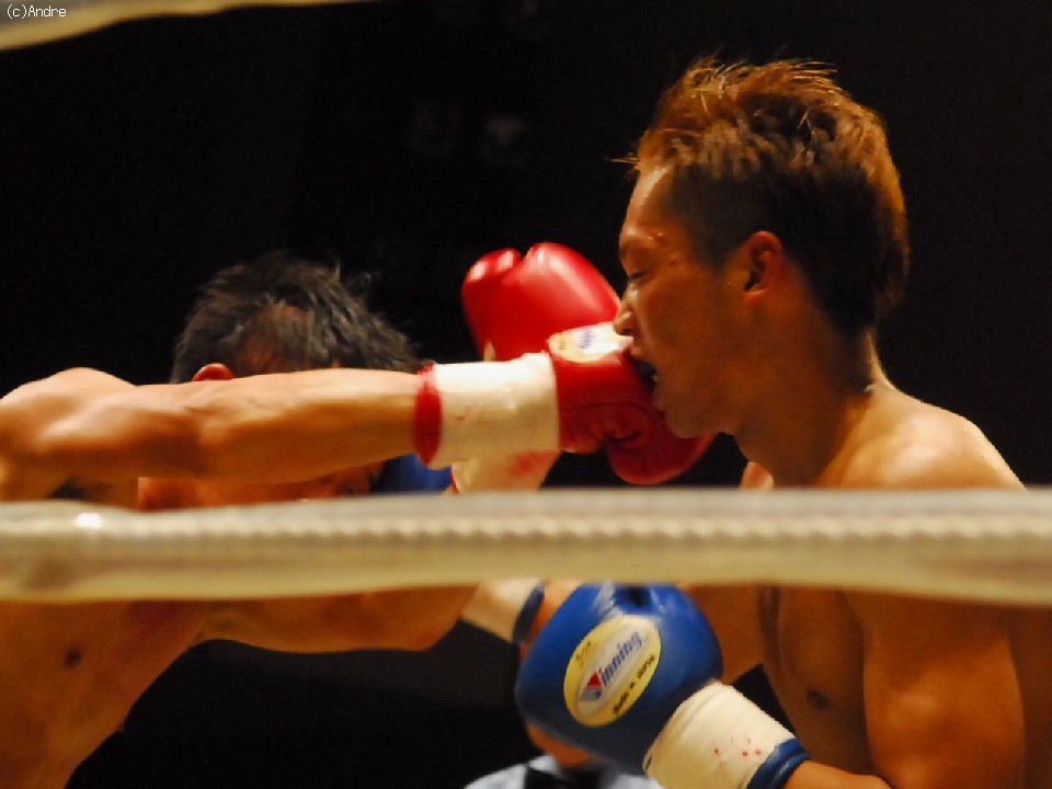 試合:サウスポーの東は右ガードを高く上げ右ジャブから左ストレートを打ち抜く。対して、大隈はワンツーから前に出るとラッシュを仕掛けるが決めきれない。両者、打ち合うも精度を欠く戦いは判定ドロー。
