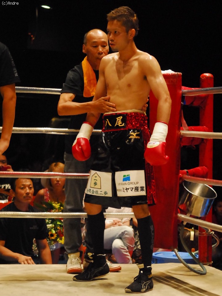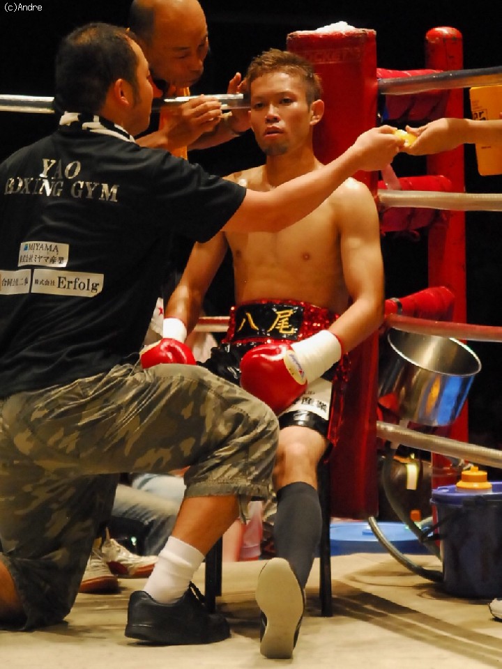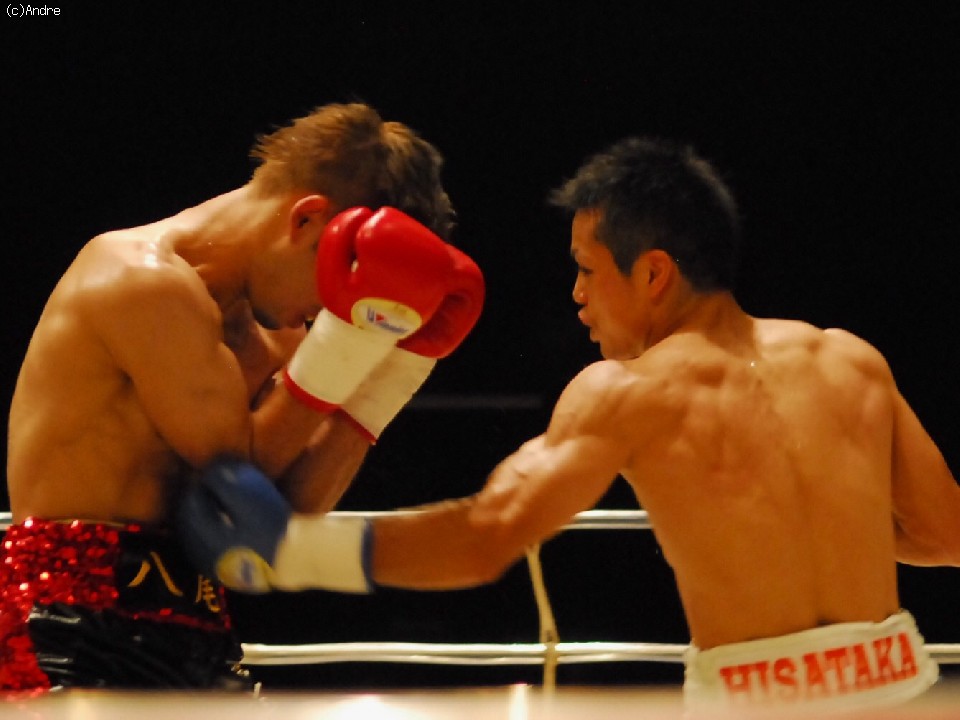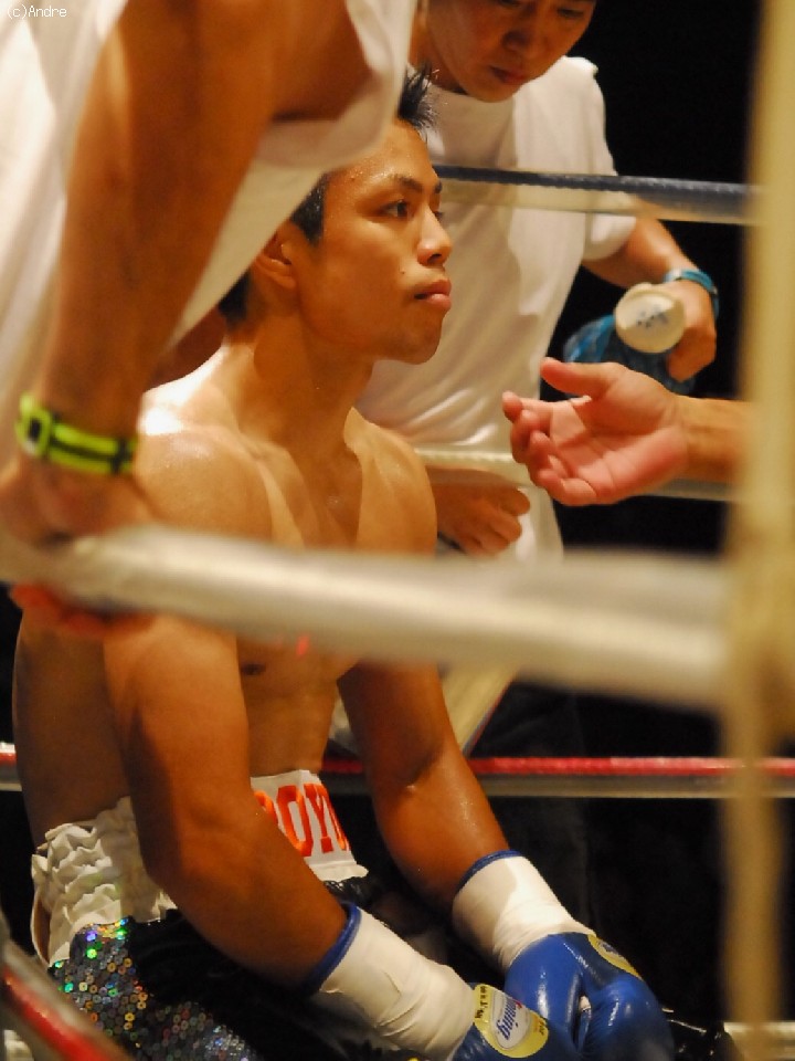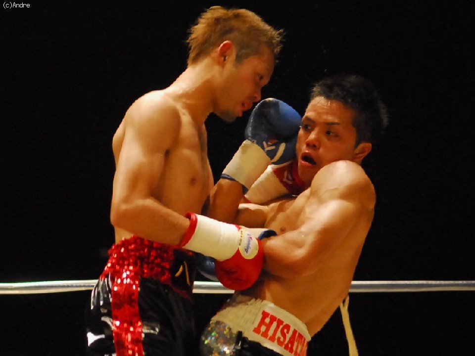 試合: 久高は左ジャブをあて距離をはかると右ストレートを上下に散らす。対して、田淵はプレスをかけると左フックを狙う。中盤、久高のスピードについていけない田淵がさらにプレスを強めると左右のボディからフックを狙うがやや精度に欠ける、久高はジャブでコントロールすると右オーバーハンドを的確にあてる展開。終盤に入ると、時折、田淵が久高を捉え連打を浴びせるが久高のガードにヒットは浅く、逆に打ち疲れた田淵に的確にカウンターをヒットする久高。技術の高さを見せ付けた久高が大差判定勝利。
