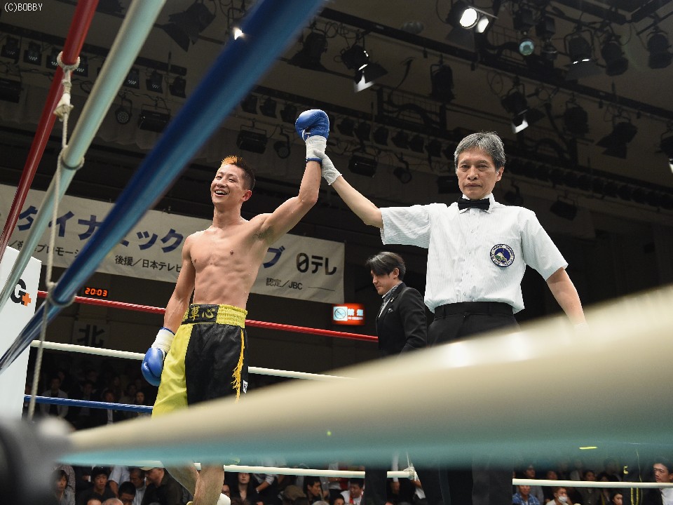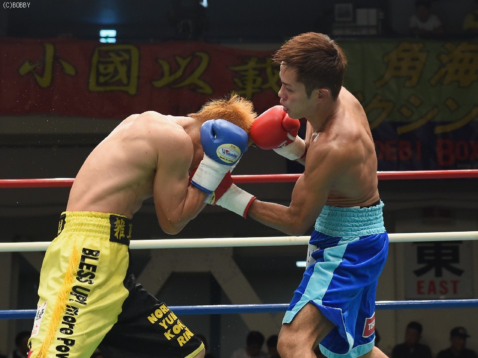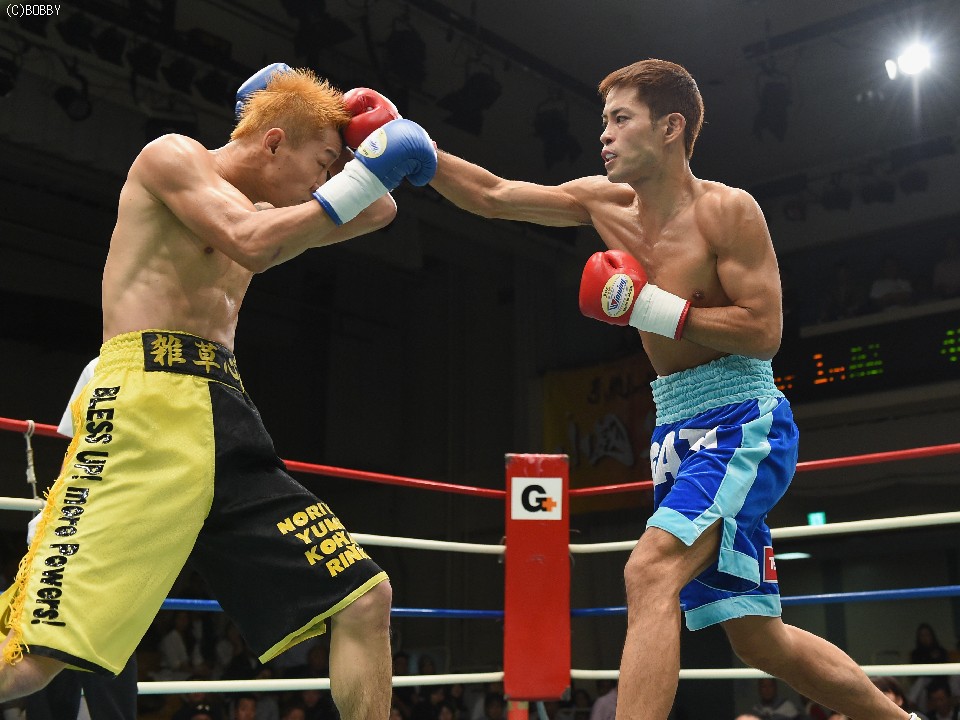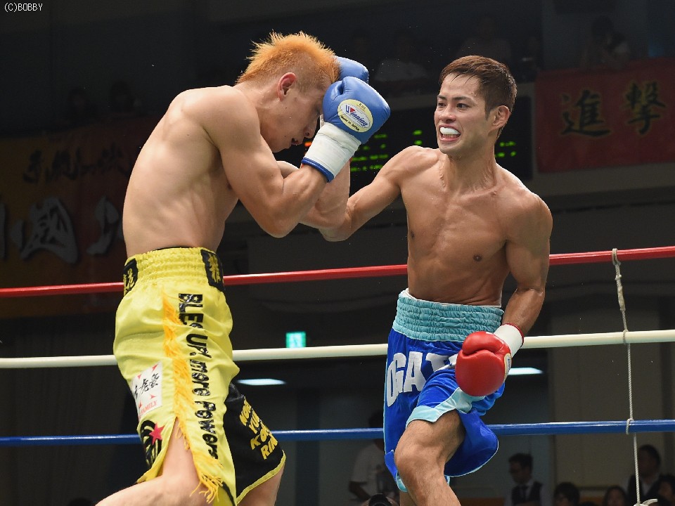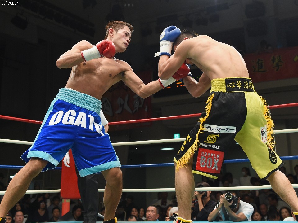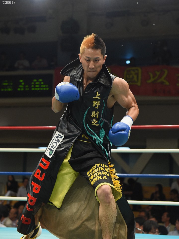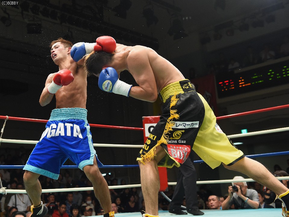 試合:33歳の上野が復活を懸けてランカー緒方に挑戦。静かな立ち上がりのなか、緒方のジャブを掻い潜り得意の左フックを当てた上野。フェイントを交えた丁寧な試合運びでジャブのスピードでも勝り、初回のポイントを奪った。一方、緒方はエンジンのかかりが遅く、2Rはボディを攻め込まれ後退。続く3Rもワンツーの連打からボディに入れられ手数を落とした。序盤の主導権を取った上野は、4Rに入りギアを上げるが、ここから緒方ももう一歩踏み込み右を返した。だが、上野は左フックから右クロスで攻め込みペースを離さず。6Rには左フックで緒方の膝を揺らし、右アッパーに繋げた。緒方も下がりながら左右を繰り出すが、上野にガードされどうにもペースが上がらず。7Rは立て続けに左ボディを効かされ、いよいよ苦しくなった。最終8R、明確なポイントが欲しい上野は右クロスをクリーンヒットし緒方を弾く。緒方は執念でワンツー、アッパーを返すが、挽回叶わず。上野が判定勝ちを飾り、ランキング復活をはたした。