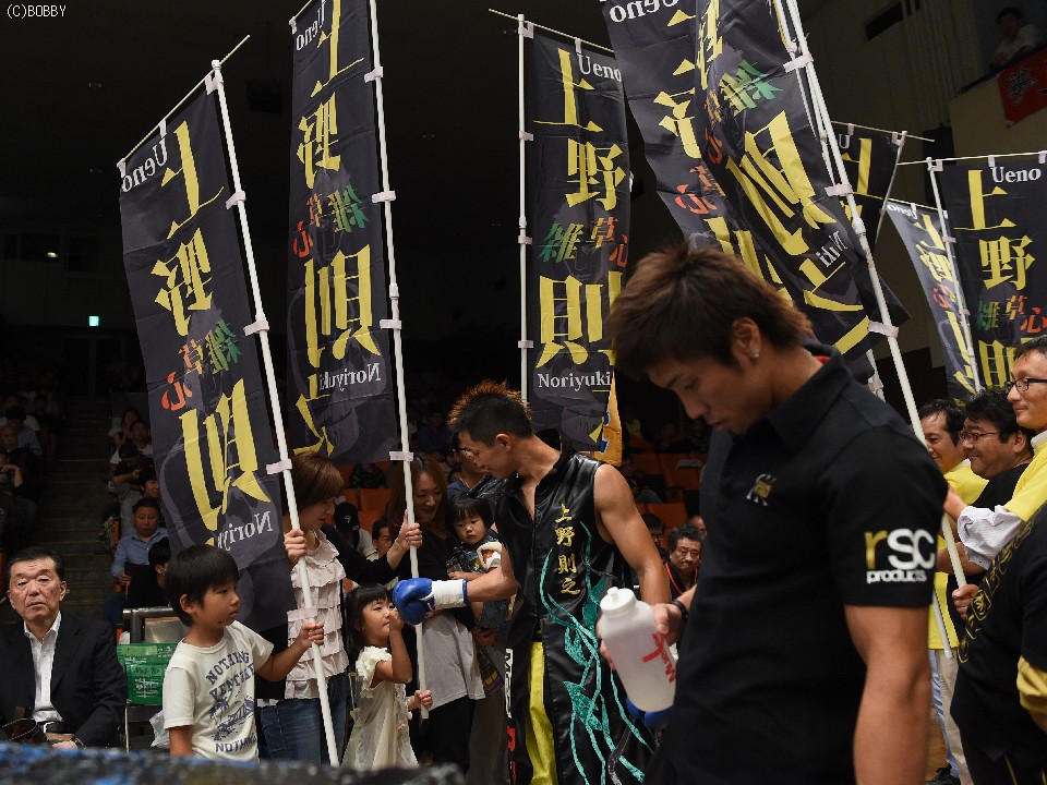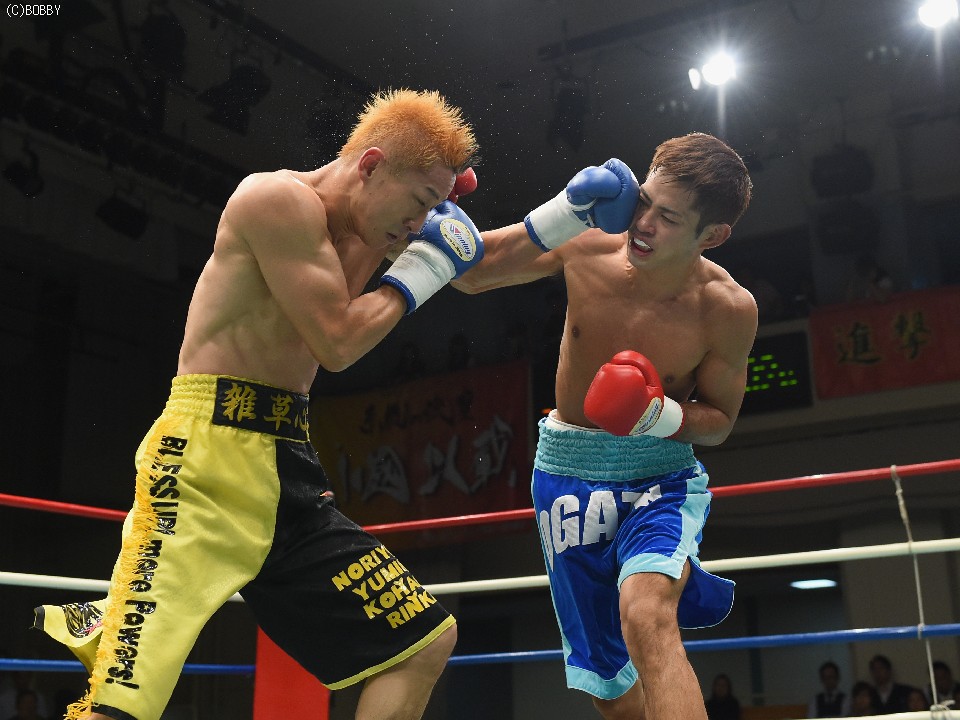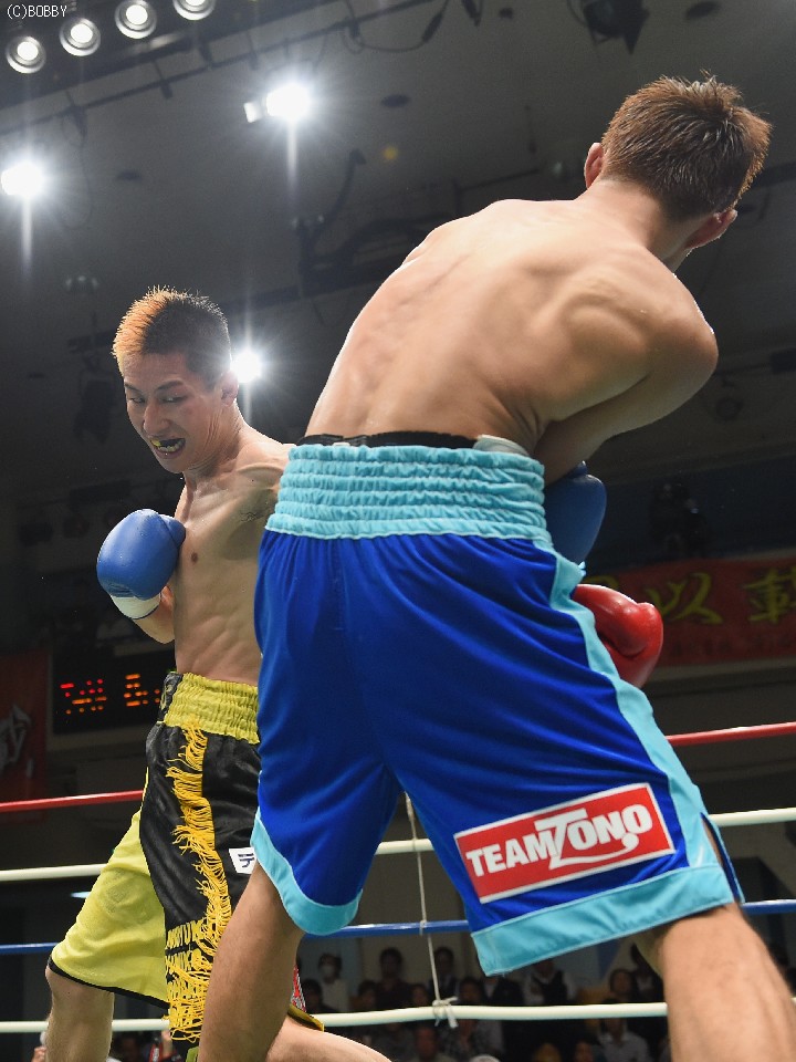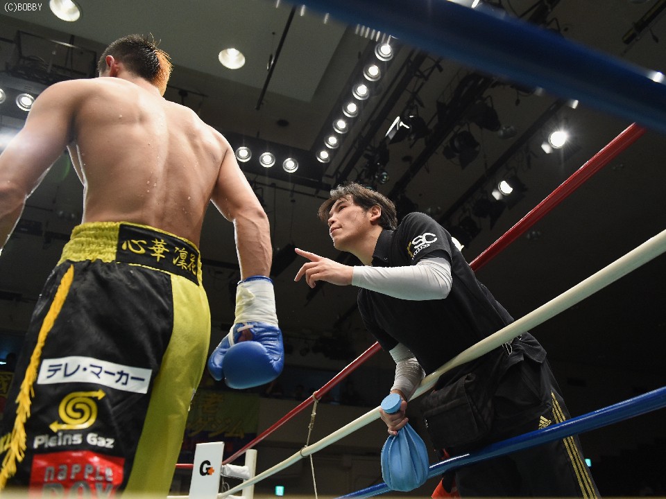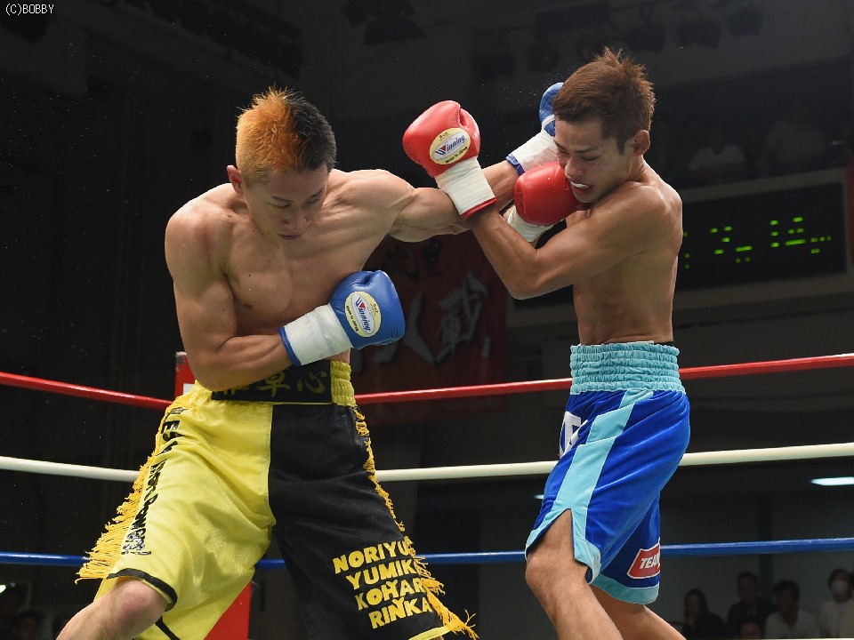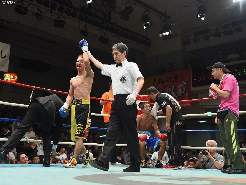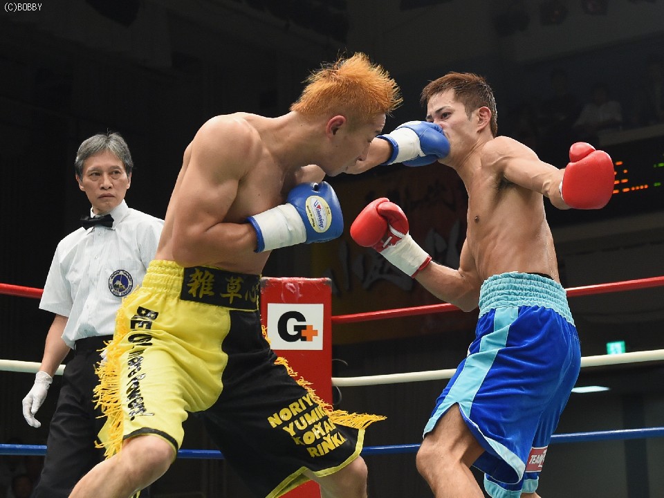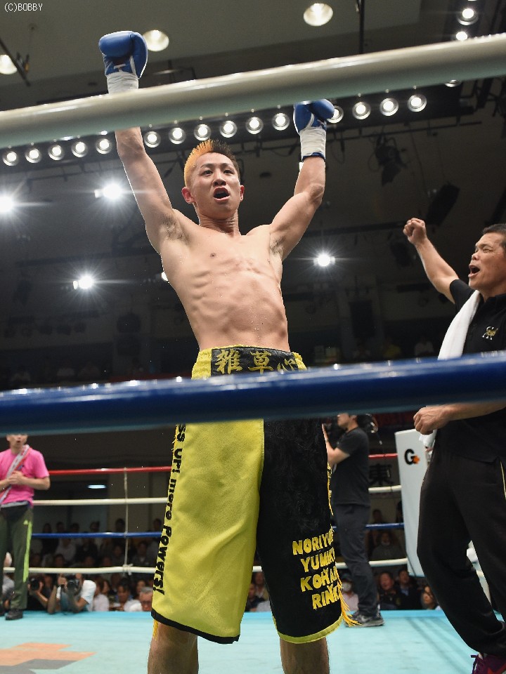 試合:33歳の上野が復活を懸けてランカー緒方に挑戦。静かな立ち上がりのなか、緒方のジャブを掻い潜り得意の左フックを当てた上野。フェイントを交えた丁寧な試合運びでジャブのスピードでも勝り、初回のポイントを奪った。一方、緒方はエンジンのかかりが遅く、2Rはボディを攻め込まれ後退。続く3Rもワンツーの連打からボディに入れられ手数を落とした。序盤の主導権を取った上野は、4Rに入りギアを上げるが、ここから緒方ももう一歩踏み込み右を返した。だが、上野は左フックから右クロスで攻め込みペースを離さず。6Rには左フックで緒方の膝を揺らし、右アッパーに繋げた。緒方も下がりながら左右を繰り出すが、上野にガードされどうにもペースが上がらず。7Rは立て続けに左ボディを効かされ、いよいよ苦しくなった。最終8R、明確なポイントが欲しい上野は右クロスをクリーンヒットし緒方を弾く。緒方は執念でワンツー、アッパーを返すが、挽回叶わず。上野が判定勝ちを飾り、ランキング復活をはたした。