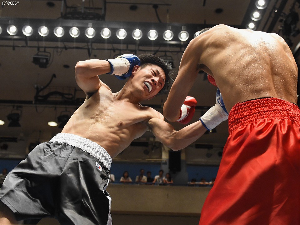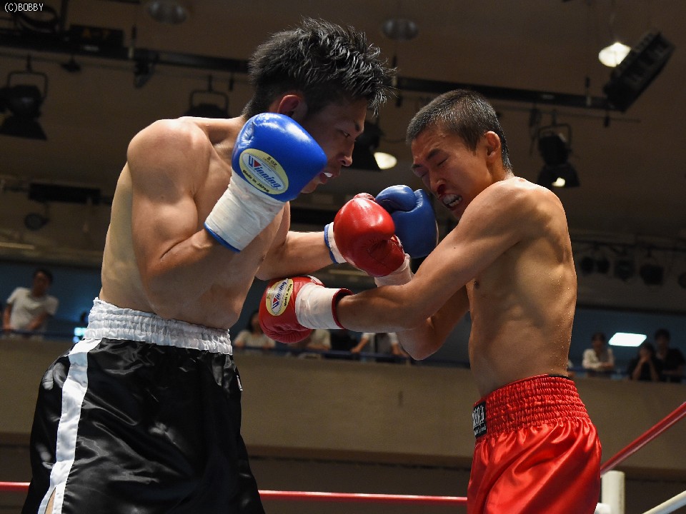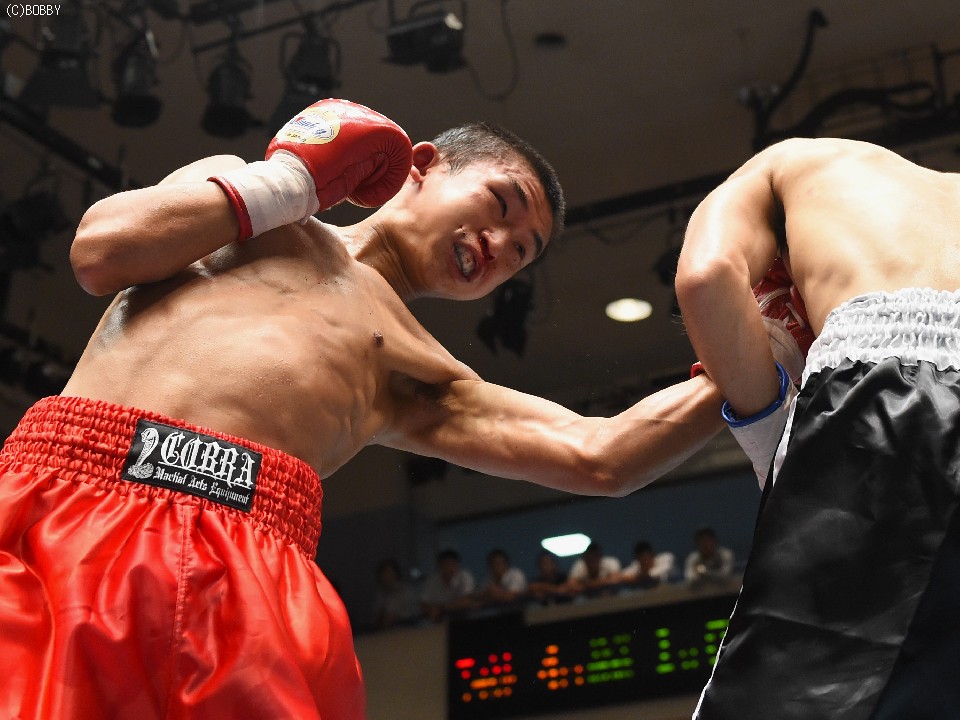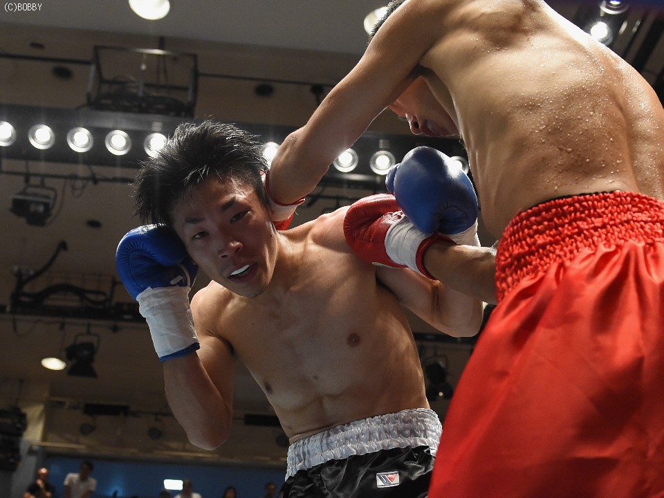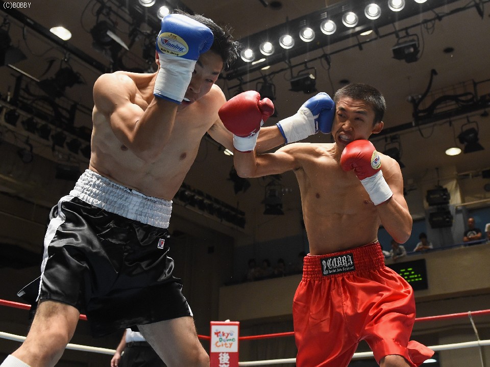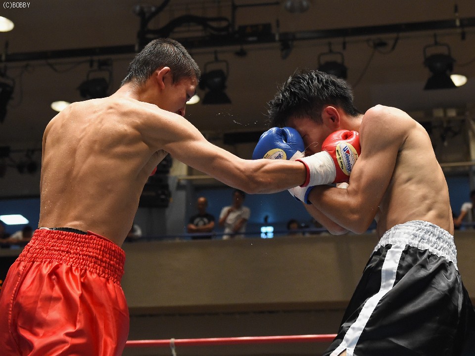 試合:ジャブを散らしペースを取りに出る小川が、固い立ち上がりの今淵をボディストレートを軸に攻める。今淵も打ち終わりを狙ってはワンツーで反撃に出るが、攻守のバランスが今一つ。それでも、3Rには打ち合い覚悟で攻撃を強め、右ストレートで小川の膝を揺らし流れを引き寄せかけたが、小川も押しきられることなく応戦。前半のポイントを守った。