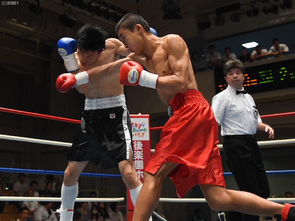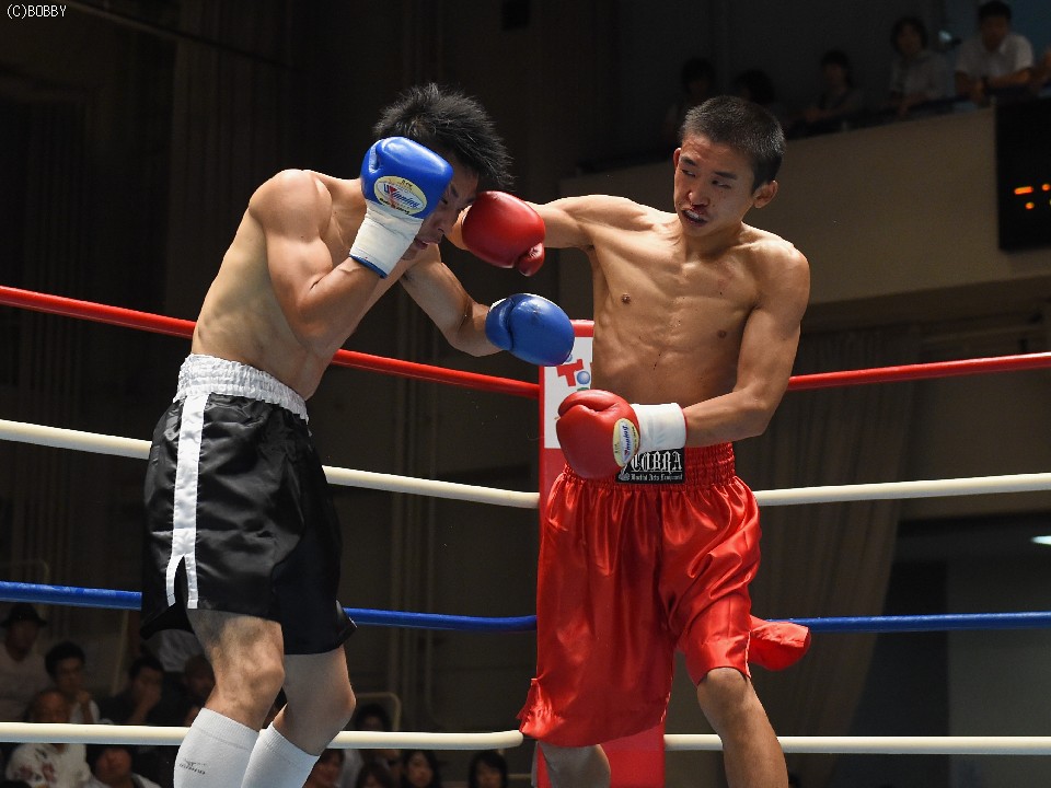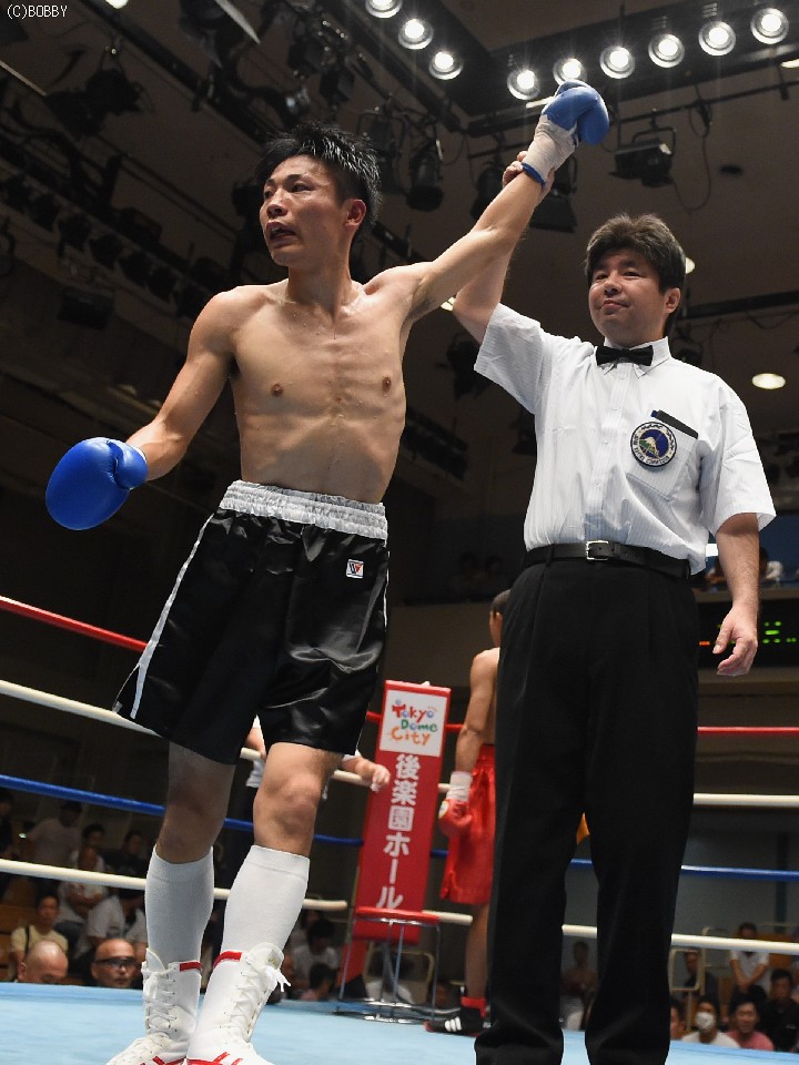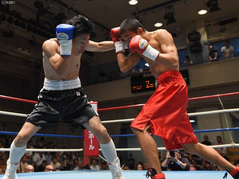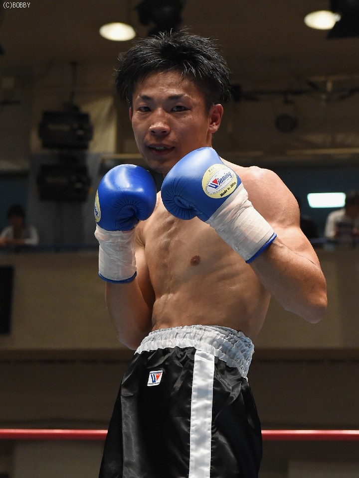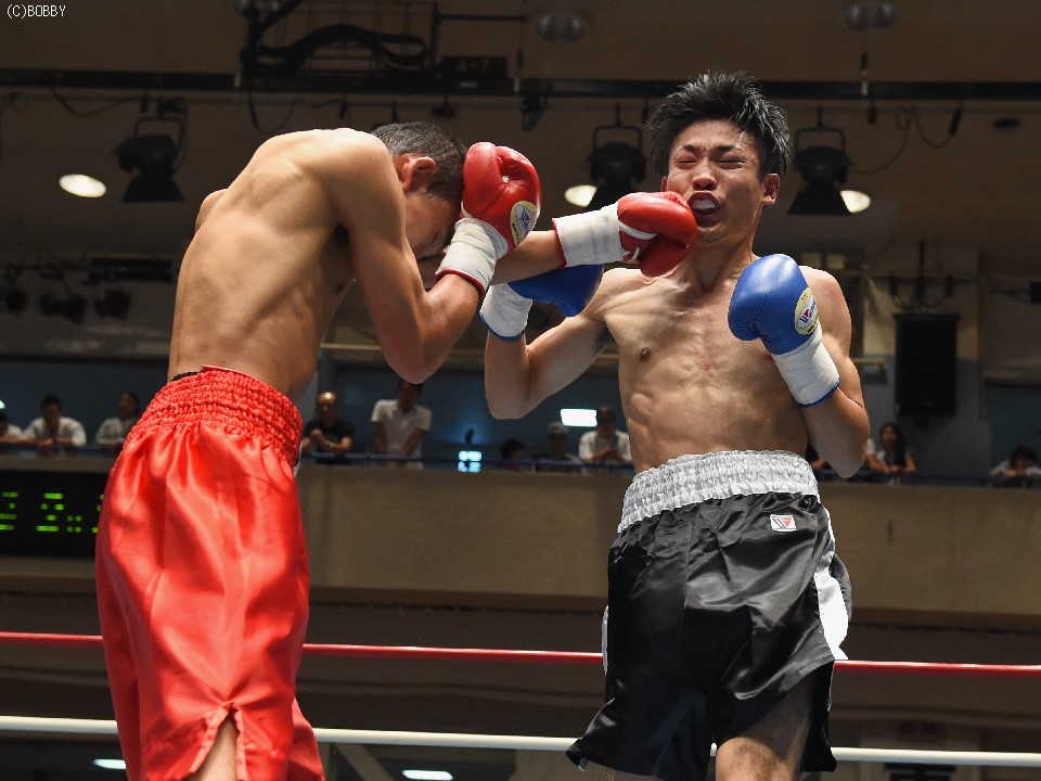 試合:ジャブを散らしペースを取りに出る小川が、固い立ち上がりの今淵をボディストレートを軸に攻める。今淵も打ち終わりを狙ってはワンツーで反撃に出るが、攻守のバランスが今一つ。それでも、3Rには打ち合い覚悟で攻撃を強め、右ストレートで小川の膝を揺らし流れを引き寄せかけたが、小川も押しきられることなく応戦。前半のポイントを守った。