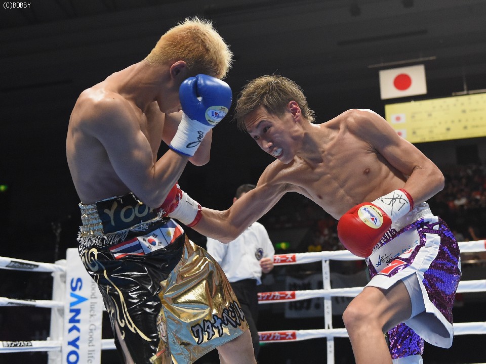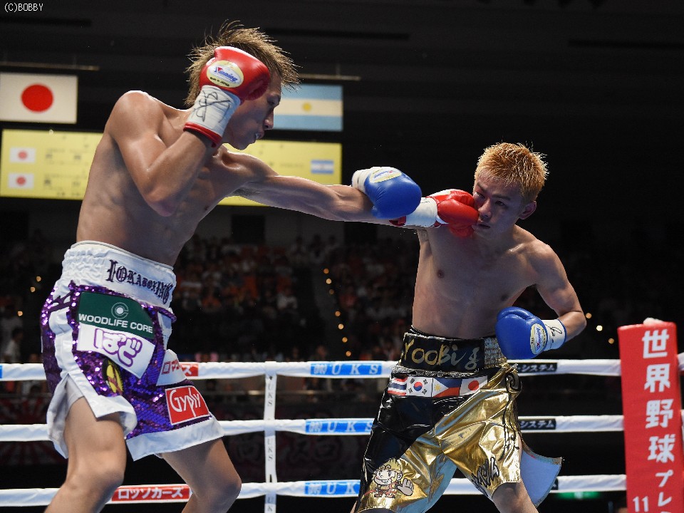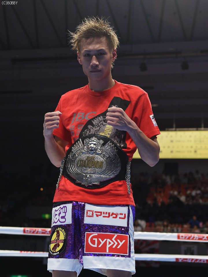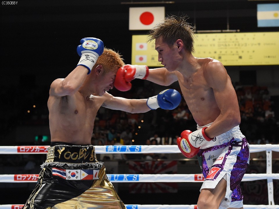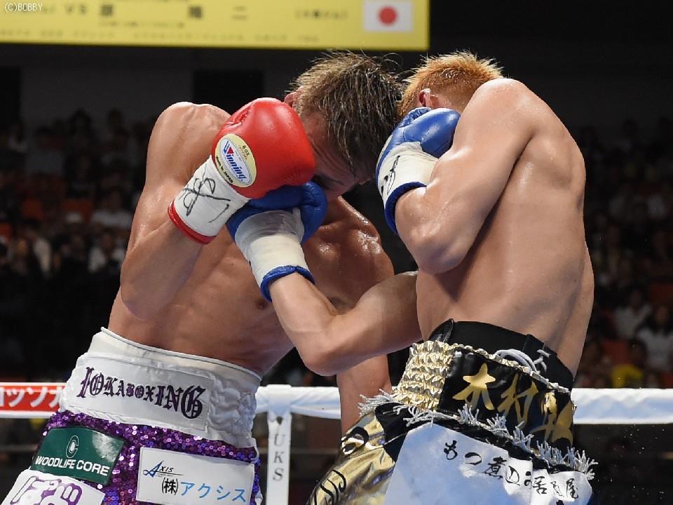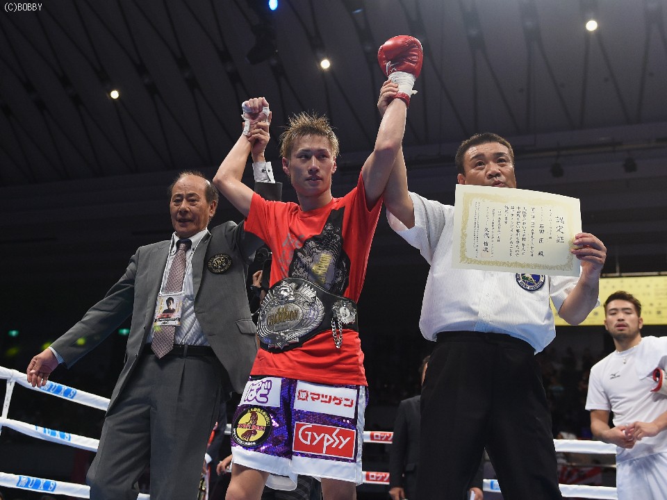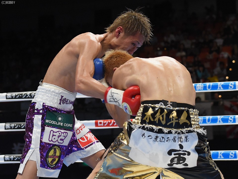 試合:元WBOアジアパシフィック・Sフライ級暫定王者、元韓国同級王者の肩書きを持つ木村を迎え、石田が3度目の防衛戦に臨んだ。スピードに定評のある両者とあって、ジャブを突いての距離の探り合いでスタートしたが、立ち上がりは王者・石田が右のカウンターで上回った。木村も2Rに入り攻撃的に出ると、ジャブから右を上下に繋げるなど動きにキレが増した。石田も冷静に距離を保ち、ジャブ、ワンツーで引き離しにかかるが、木村の速いペースに序盤でスタミナを消耗。それでも有効打では上回り、左フックで木村の右目下を大きく腫らすなど、5回終了時の採点は48-47,49-46,50-46でリード。この採点を聞いてプレスを強めた木村は、単発のボディを効かせるが、序盤のスピードは影を潜め、石田にワンツーで迎え撃たれてしまう。それでも終盤はボディから上に返しヒットを奪ったが、石田もここ一番で右を好打し主導権を離さず。決め手には欠けたが、最後までジャブを突いて試合を組み立てた石田が、日本タイトル初挑戦の木村に最大8ポイント差をつける判定勝ちを収め、V3に成功した。