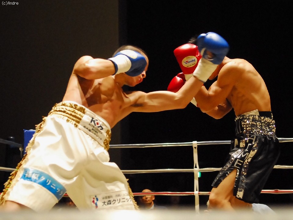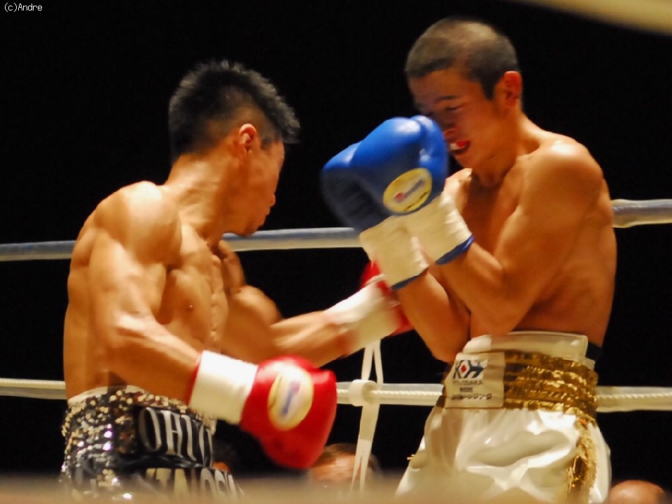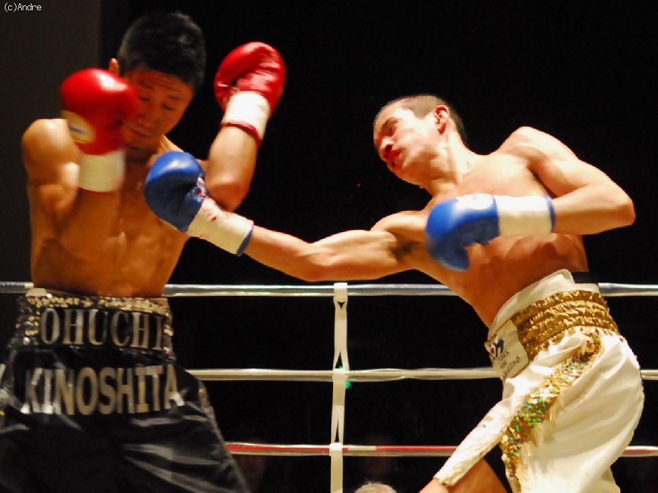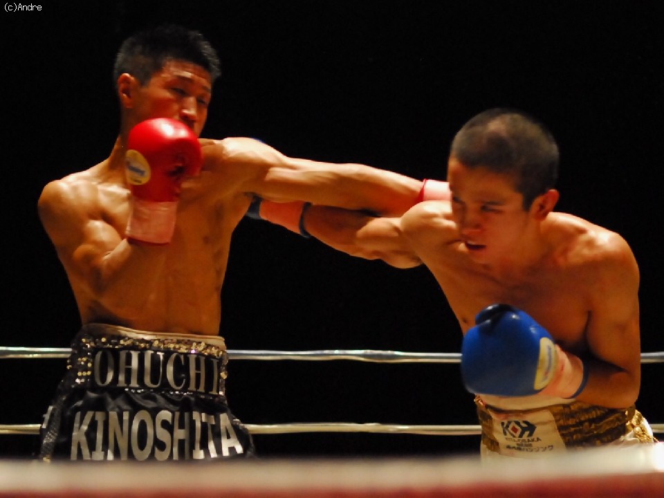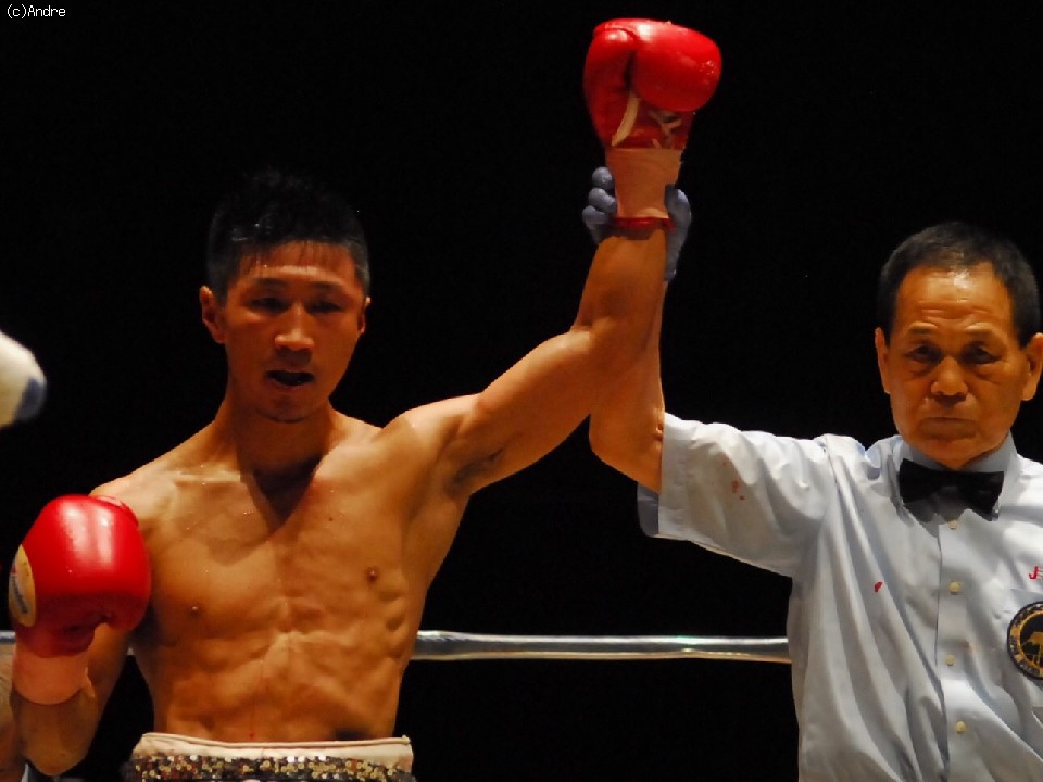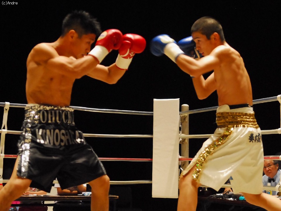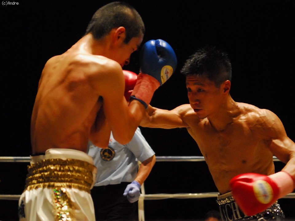 試合:スピードのある両者。上久保は足を使いジャブで距離をはかると左ボディをあてる。対して、東洋太平洋ランカーの大内は上久保の打ち終わりに右のオーバーハンドで応戦する。3R、大内の右ストレートが決まり上久保は膝を揺らすもこのラウンドを凌ぐ。4R終盤、逆に上久保の放った右アッパーが決まり大内の膝が揺れるもここは大内が距離を詰めラウンドをしのぐ。すると7R終盤、大内の右がヒット、上久保がロープを背にするとラッシュを仕掛けレフェリーストップを呼び込む。