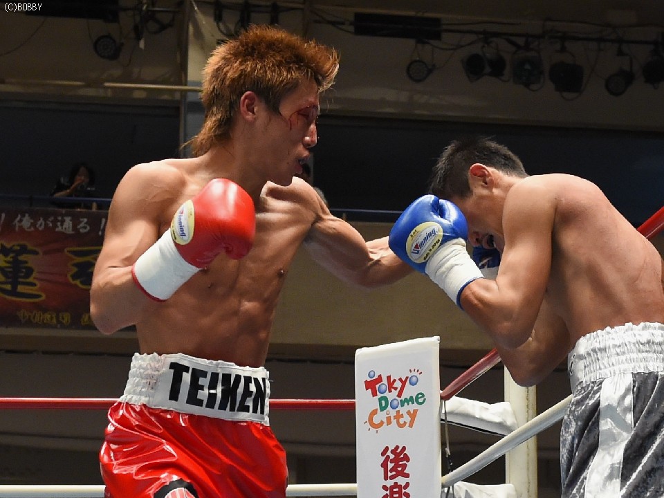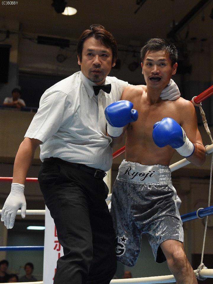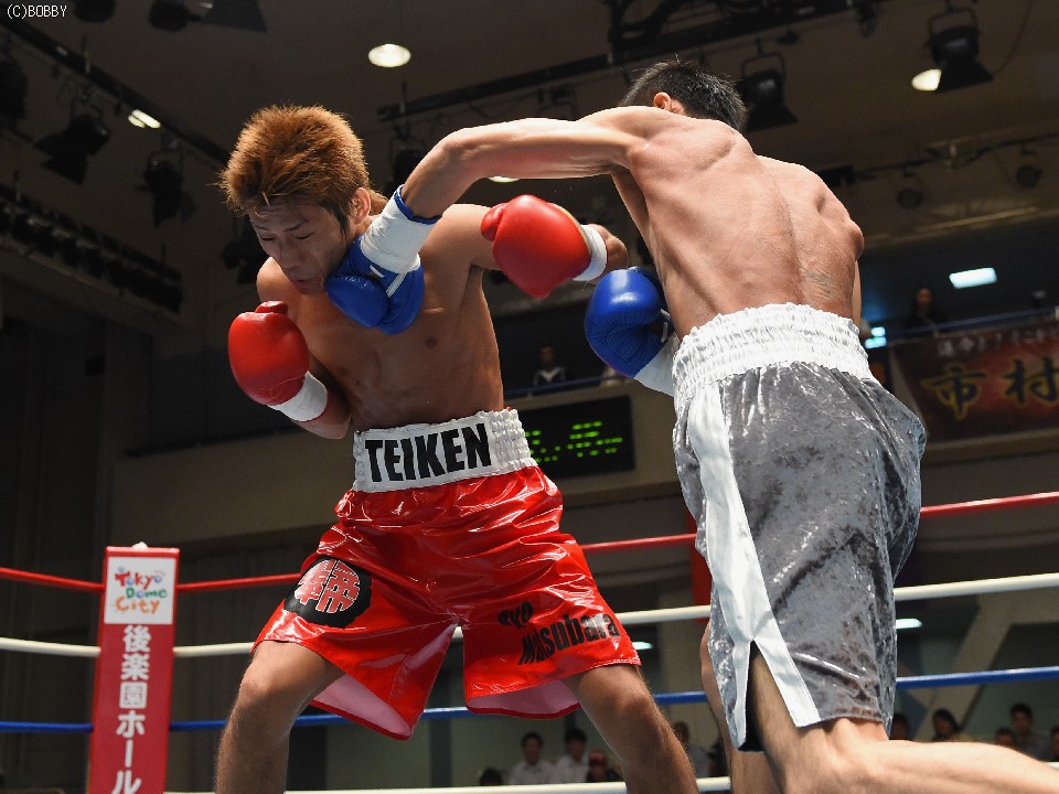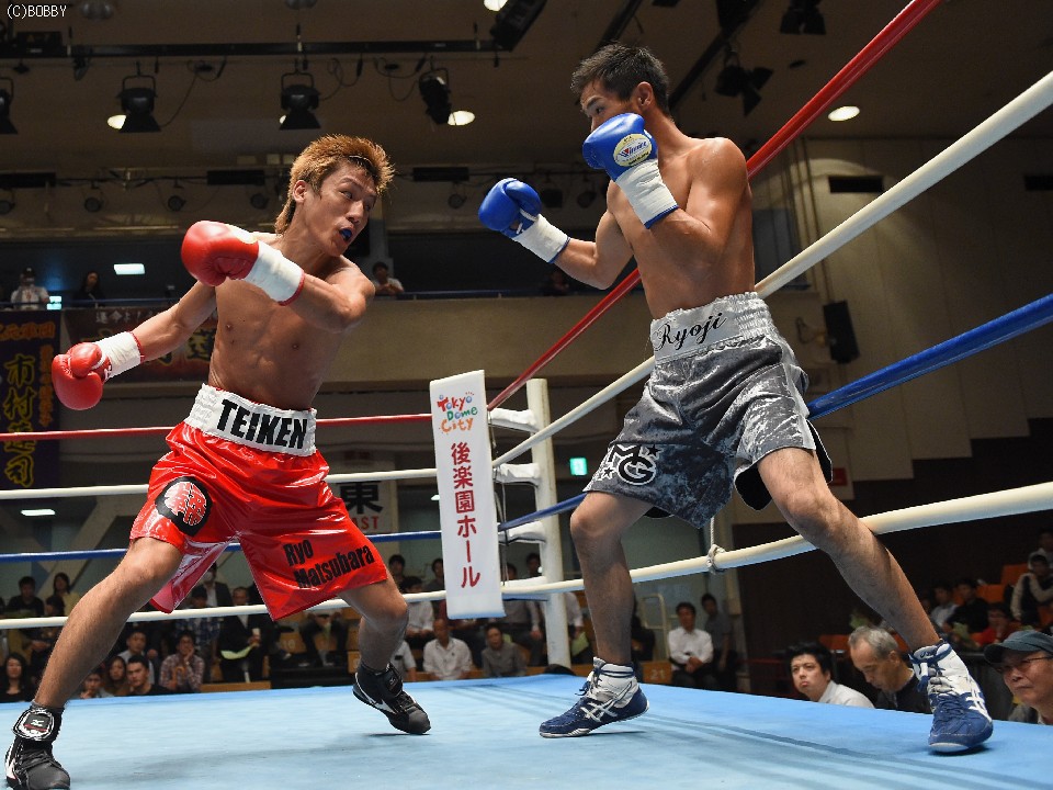 試合:初回、松原がパワフルな左右フックで追い込むが、サウスポー福永が多彩なパンチで迎え撃つと松原はガクッと腰を落とす。ここはチャンスだと追撃するが、打たれながらも松原の強引な姿勢は変わらない。すると2分、ロープに詰めて怒涛の連打。腰を沈めて防戦一方になった福永をレフェリーが救った。スリリングな打ち合いの末、松原が競り勝った。