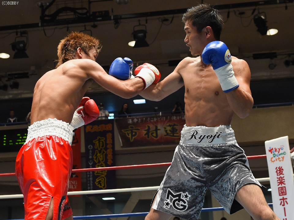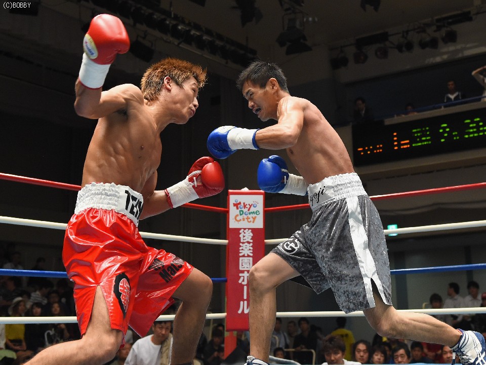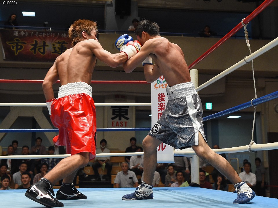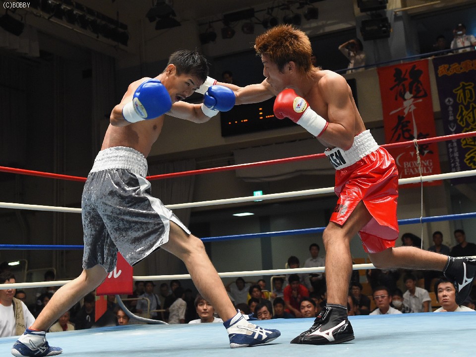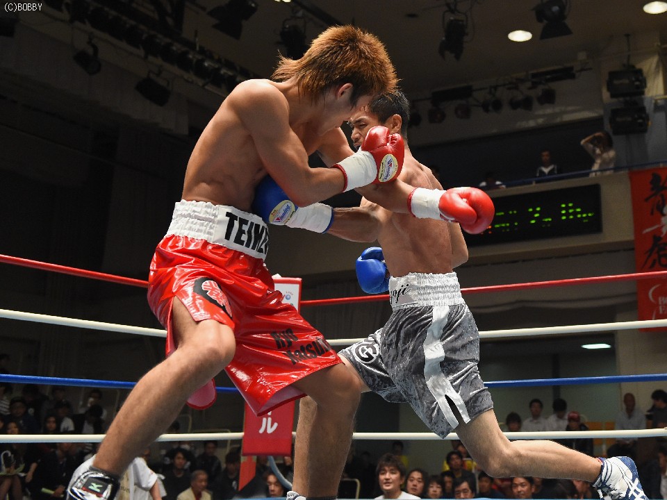 試合:初回、松原がパワフルな左右フックで追い込むが、サウスポー福永が多彩なパンチで迎え撃つと松原はガクッと腰を落とす。ここはチャンスだと追撃するが、打たれながらも松原の強引な姿勢は変わらない。すると2分、ロープに詰めて怒涛の連打。腰を沈めて防戦一方になった福永をレフェリーが救った。スリリングな打ち合いの末、松原が競り勝った。