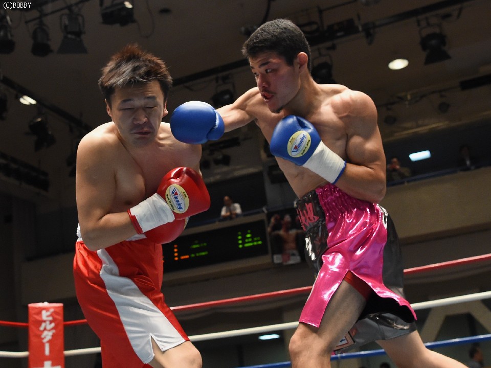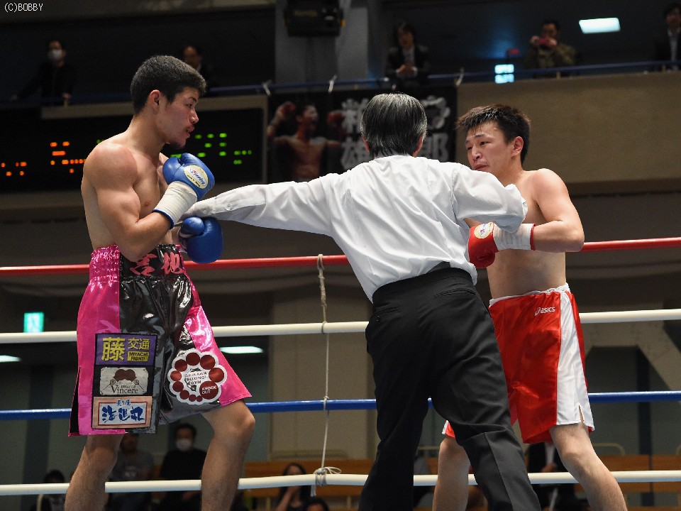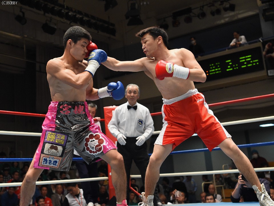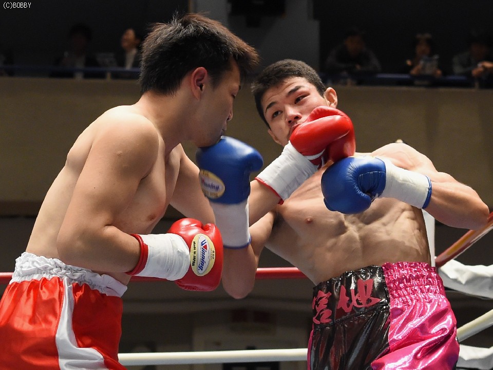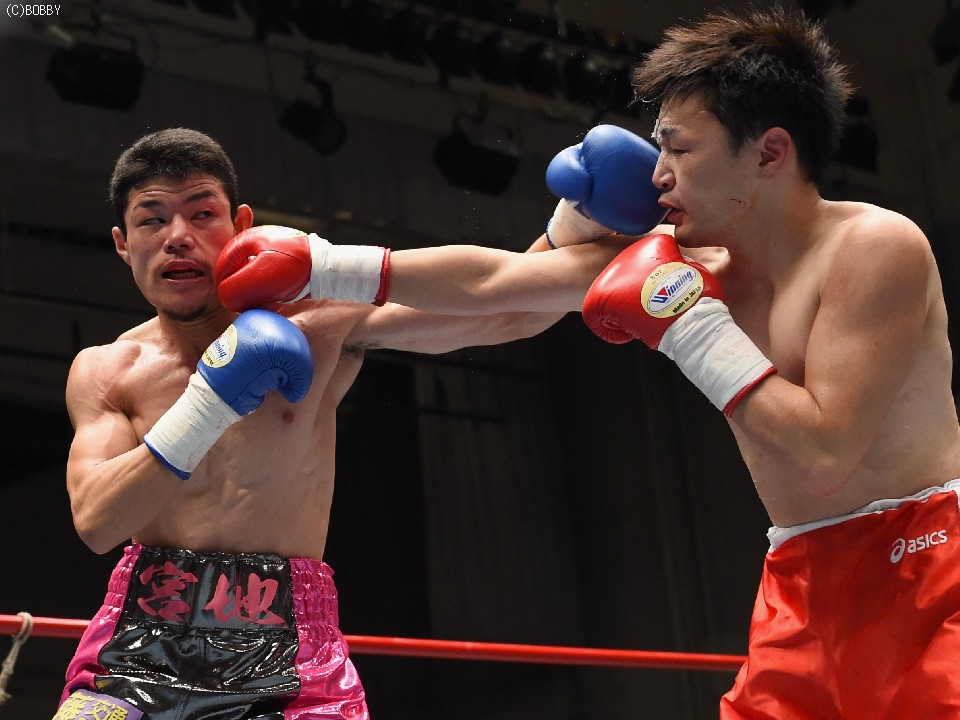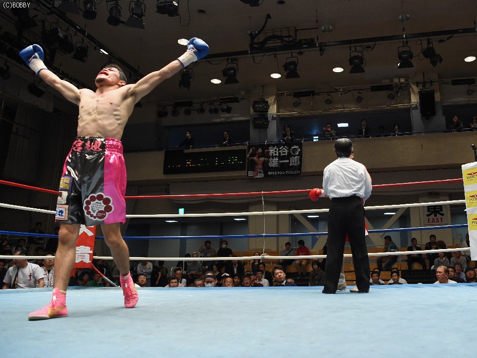 試合:サウスポー佐藤が前進してワンツーを繰り出すが、宮地の冷静な対処にパンチは空を切ってしまう。2R、宮地のワンツーが当たるが、佐藤も負けん気の強さを発揮して打ち返す。3R、中間の距離でのパンチの交換となるが、宮地のパンチが正確さで上回りダメージを与えていく。1分30秒を過ぎた頃、宮地の右ストレートが顔を弾くと一気に詰めて最後は左フックでフィニッシュに持ち込んだ。