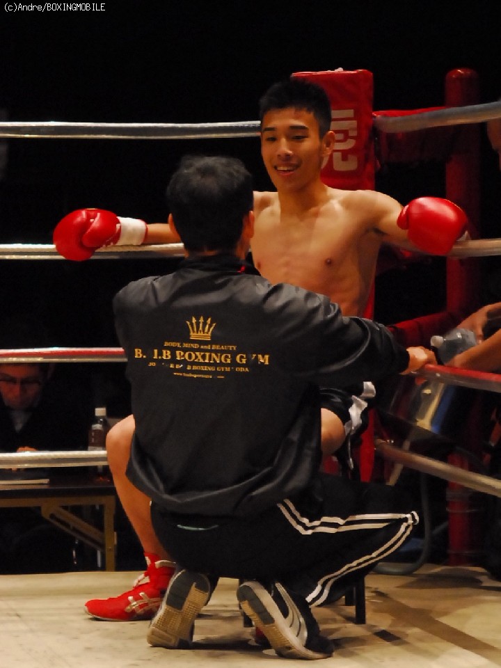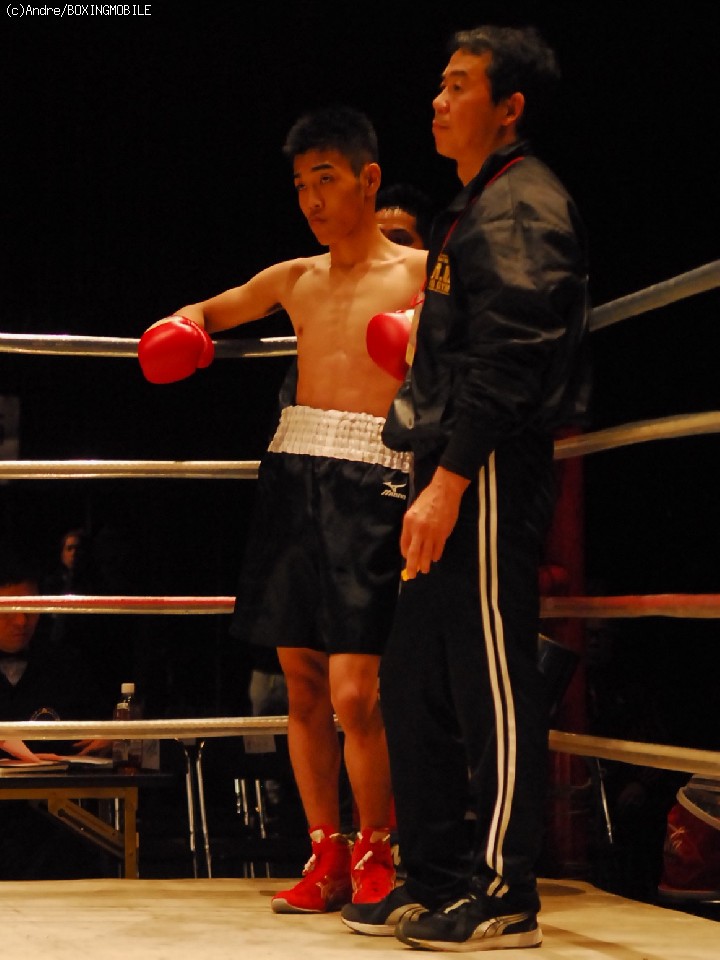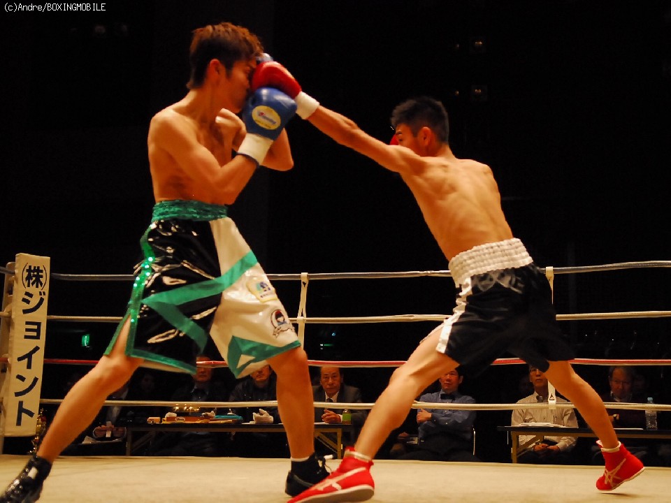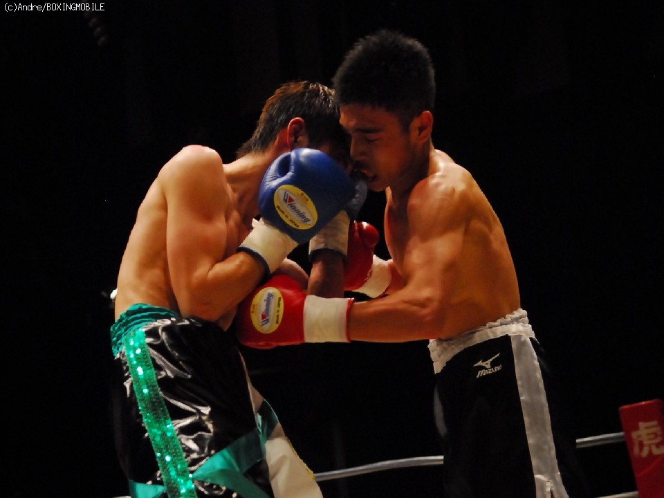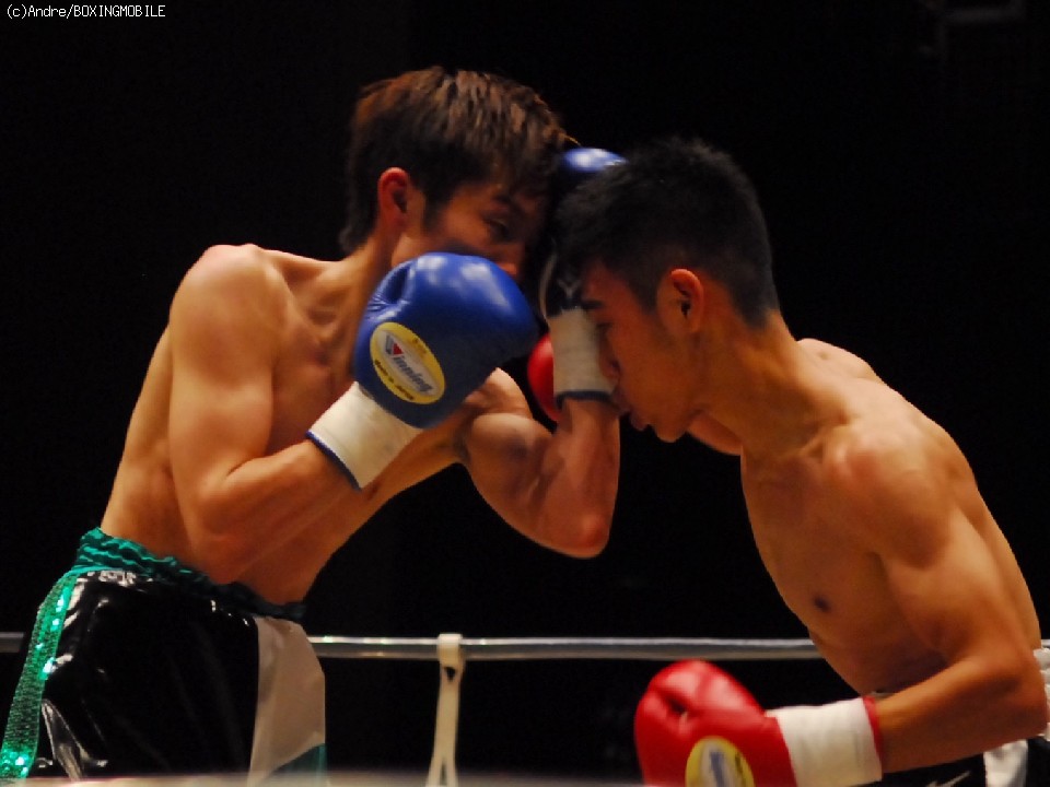 試合: 岡は踏み込んでワンツーをあてていく。対して、寺田は接近すると左ジャブから左フックで応戦。ラウンドの前半岡が攻勢をかけるが後半は寺田の手数が勝る。最終ラウンド、両者頭おつけて打ちあうも決定打には恵まれず、判定で寺田が勝利。