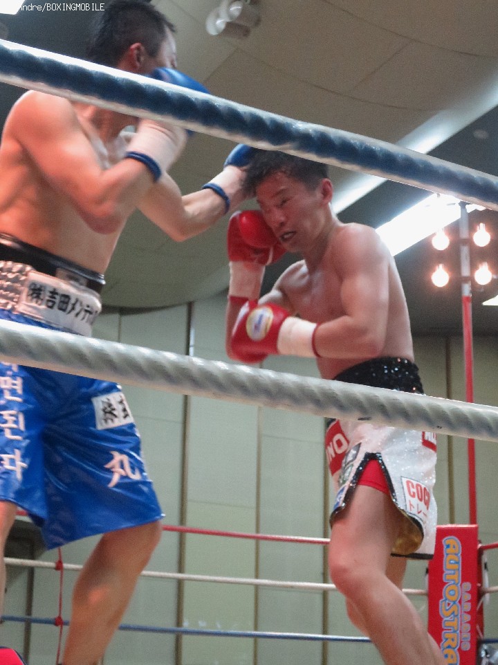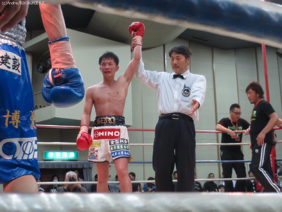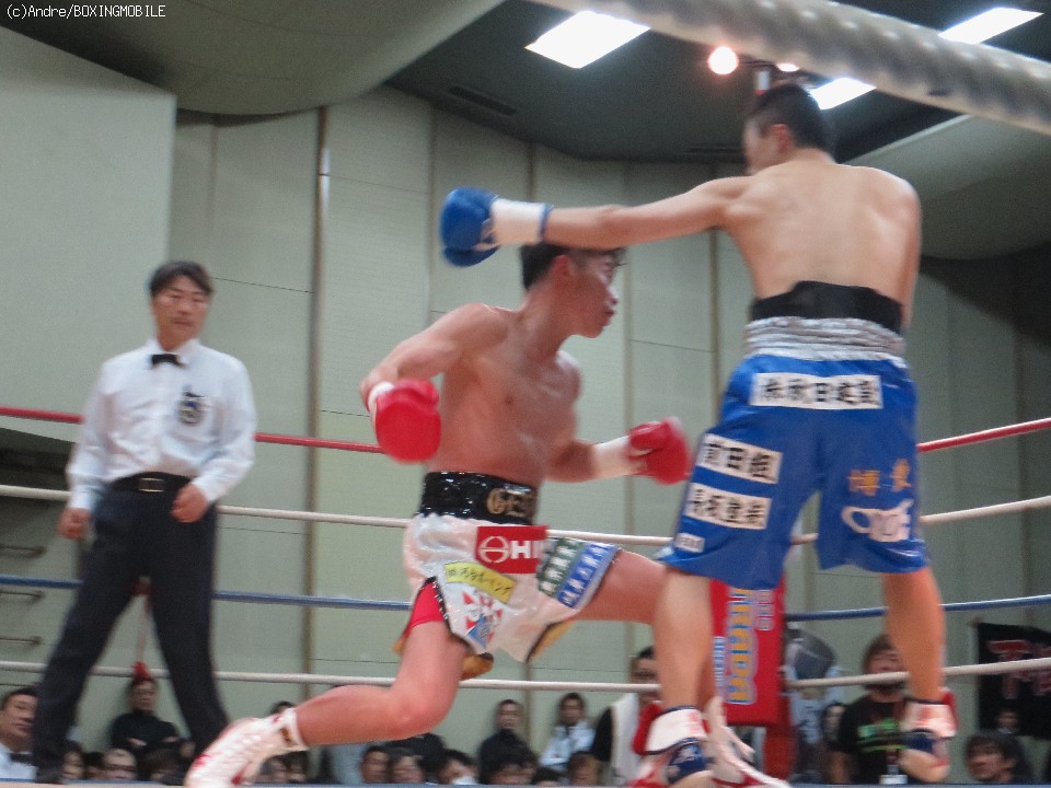 試合: 5戦全勝(4KO)で日本ミニマム級3位の華井が関西のベテラン諸を迎え初のメインイベントに登場。序盤両者、フェイントを使い出方を伺う。3ラウンド、両者偶然のバッティングにより華井の右目尻が切れる。独特なリズムから放つ右のオーバーハンドを効果的にあてる諸が前半はペースを握る。終盤、足を使いコツコツとジャブからペースを作る諸に対して、倒しに行きたい華井は細かいパンチを刻み、打ち合いに持ち込む。最終ラウンド、両者足を止めて打ち合う。後半盛り返した華井が勝ちを拾った。