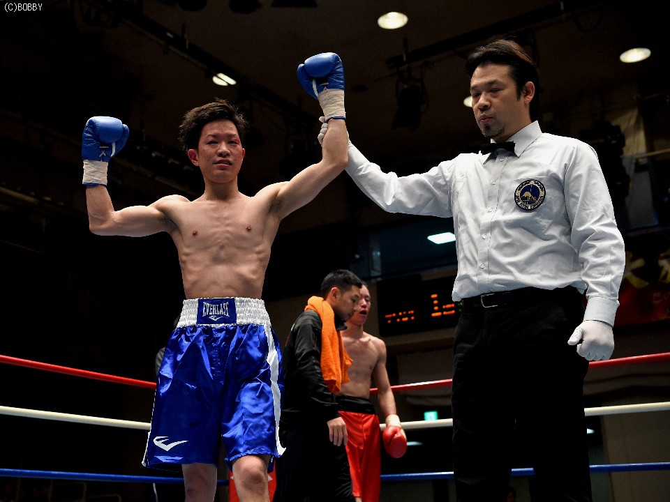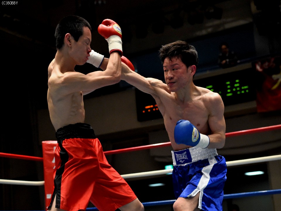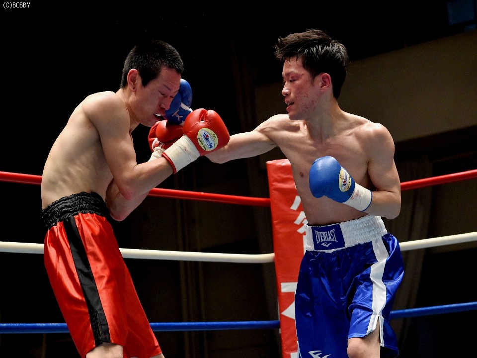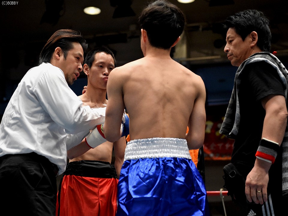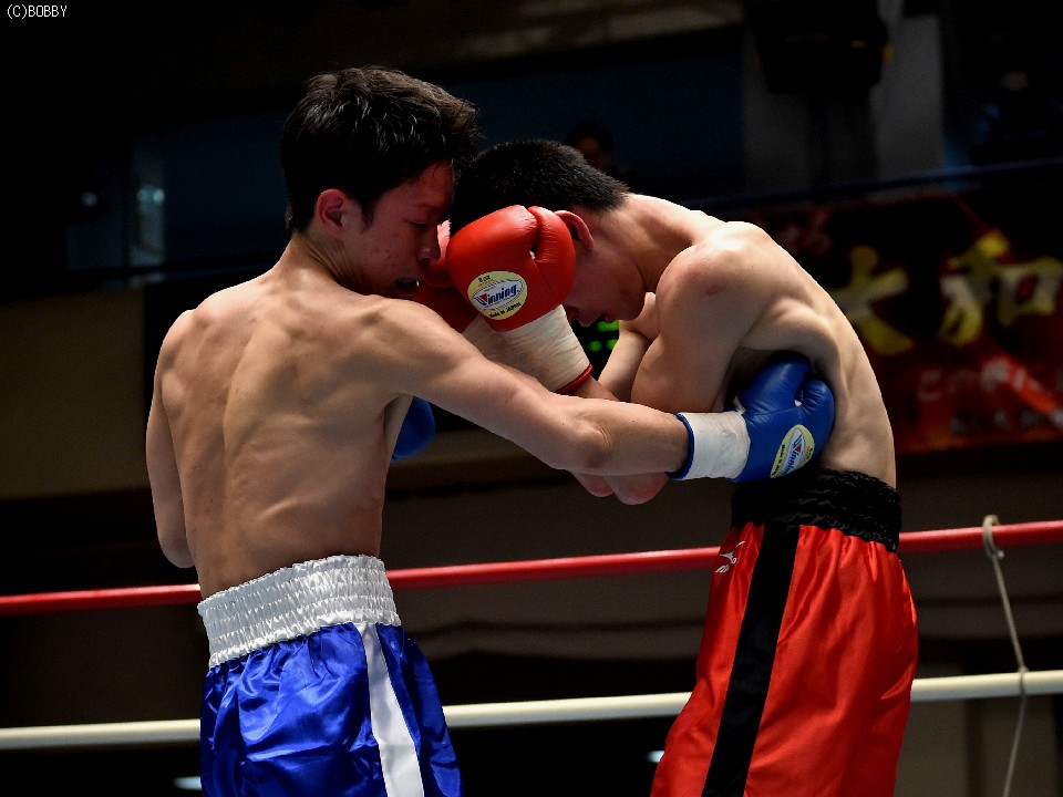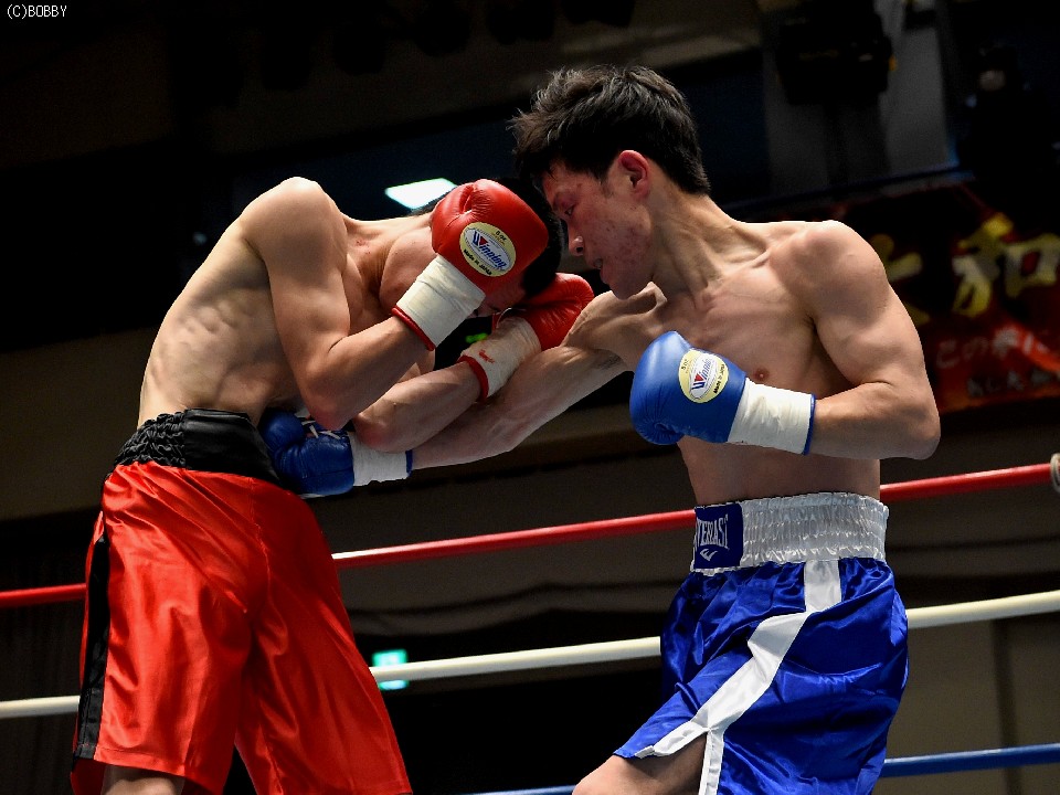 試合:ガードを固めた百田が突進するも、長身の篠田に距離を取られ右アッパー、左フックと打ち込まれてしまう序盤。それでもワンツーでしつこく追った百田は、詰めては左右ボディで食い下がり、後半に入りスタミナを切らした篠田を攻め続けた。最終4R、篠田も再びフック、アッパーを強打するが、百田の右に顔を跳ね上げられるなど劣勢は否めず。百田が2勝目を飾った。