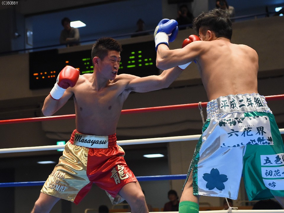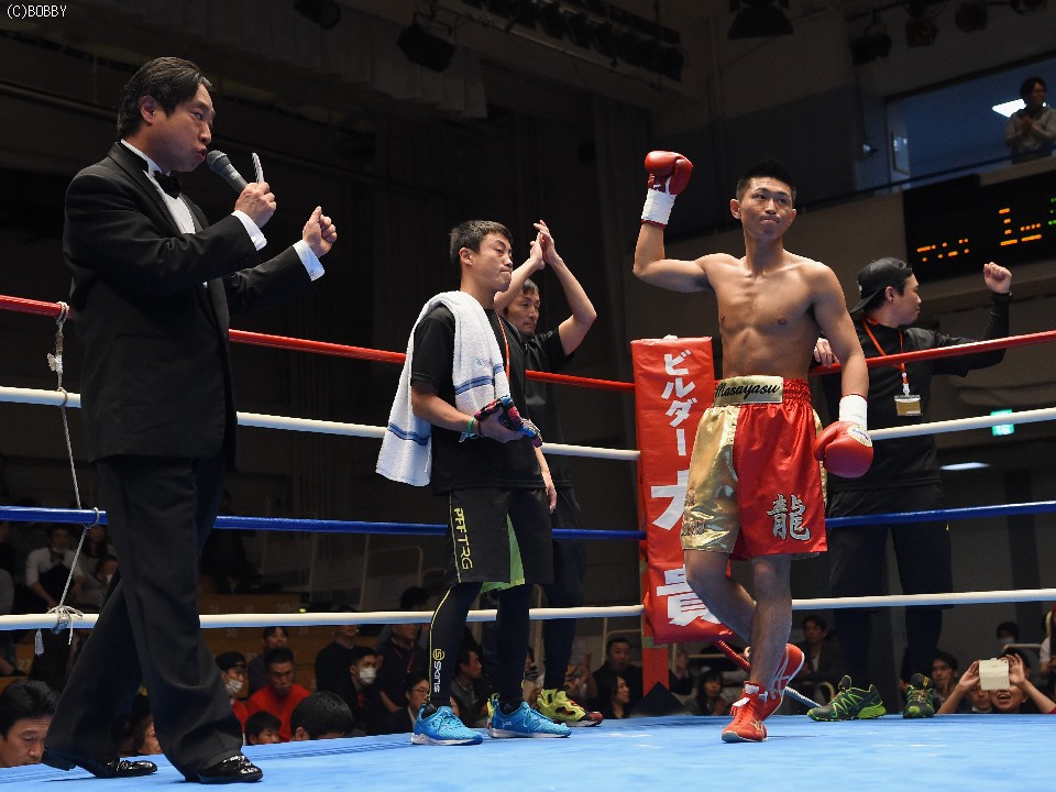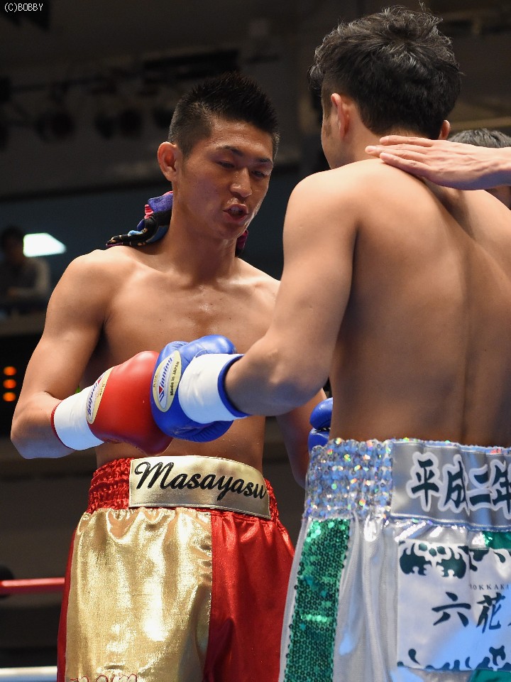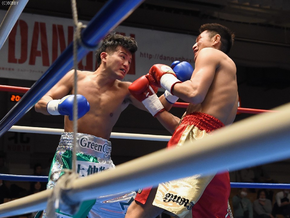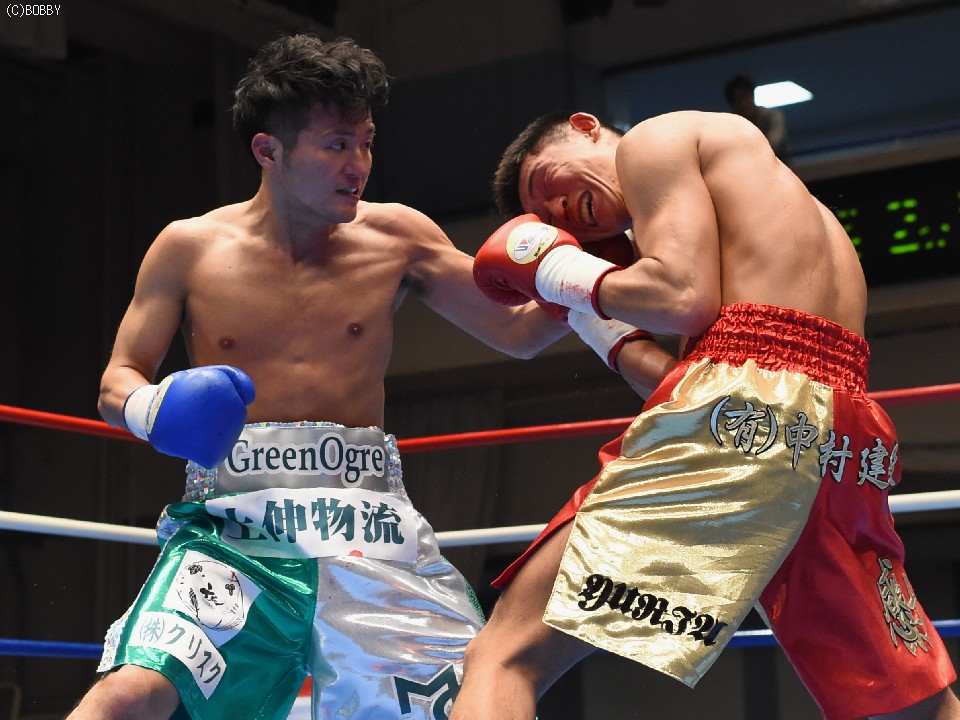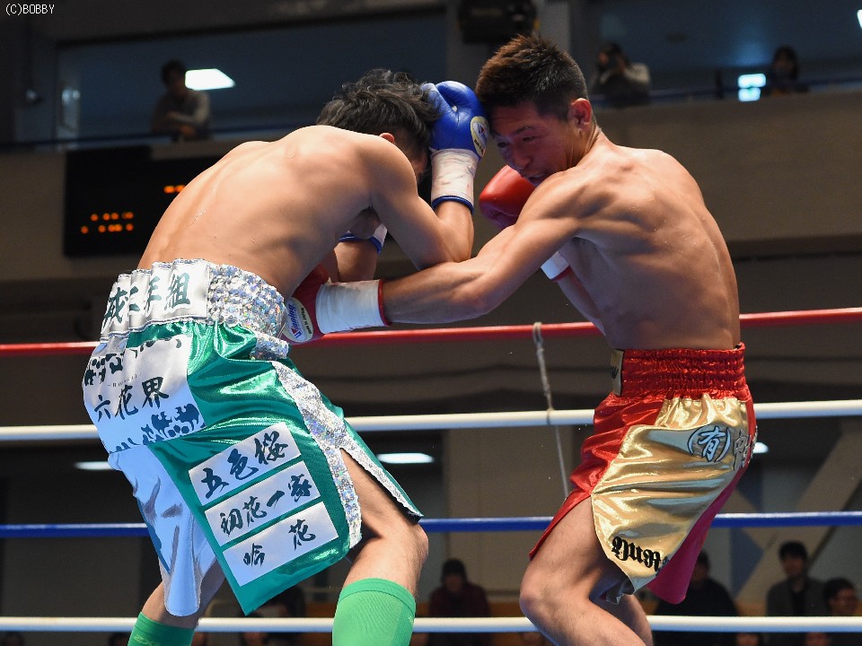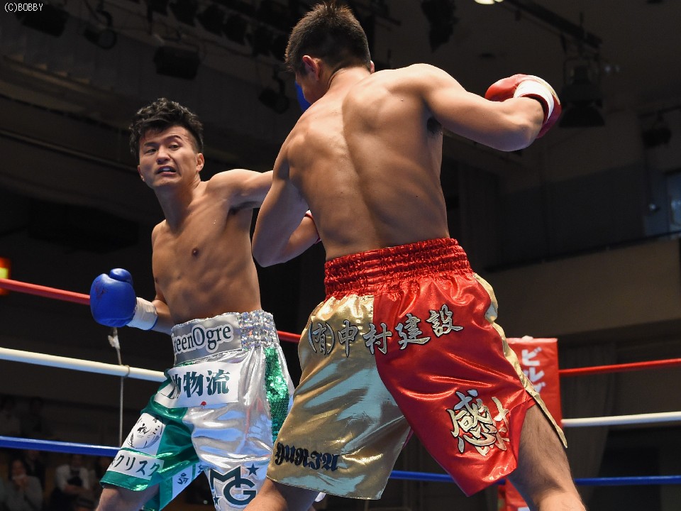 試合:低く構えるファイター上田がいつものようにゴングと同時に駆け寄り、フック系の左右の強打を振るう。だが、これを予測していた中村も耐えながらワンツー、アッパーとストレート系を返し、初回から打撃戦へと発展した。どちらも一歩も引かない打ち合いに場内は早くもヒートアップ。2R、この声援を聞きさらにペースをあげた両者だが、中村の回転が上回ると強烈な右で上田の顔面を弾いた。最後はロープ際で完全に仰け反った上田をレフェリーが抱え、試合を止めた。