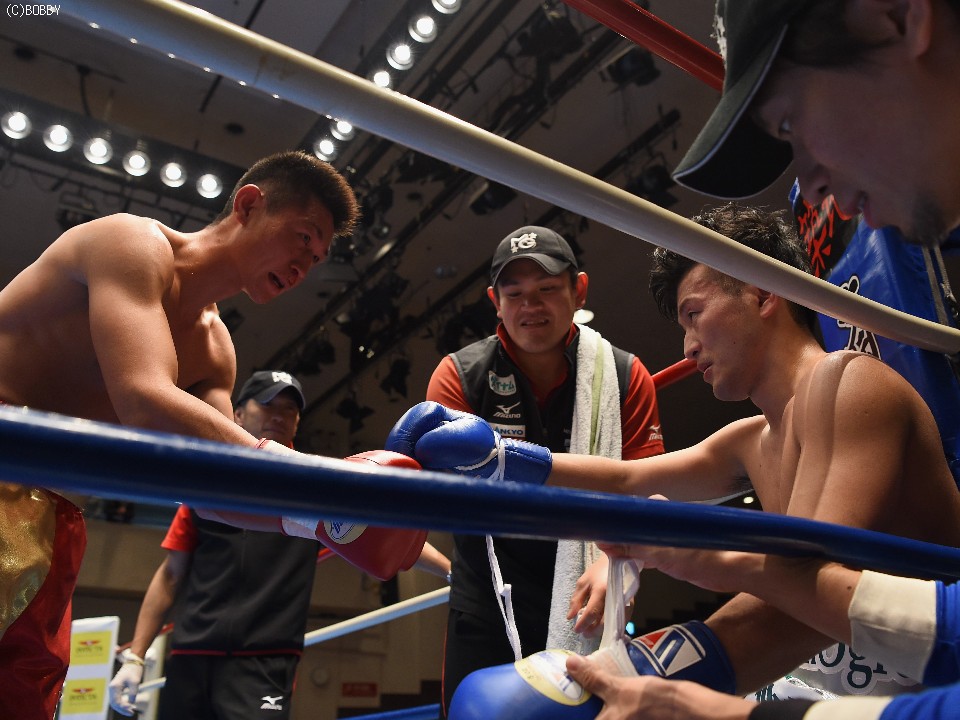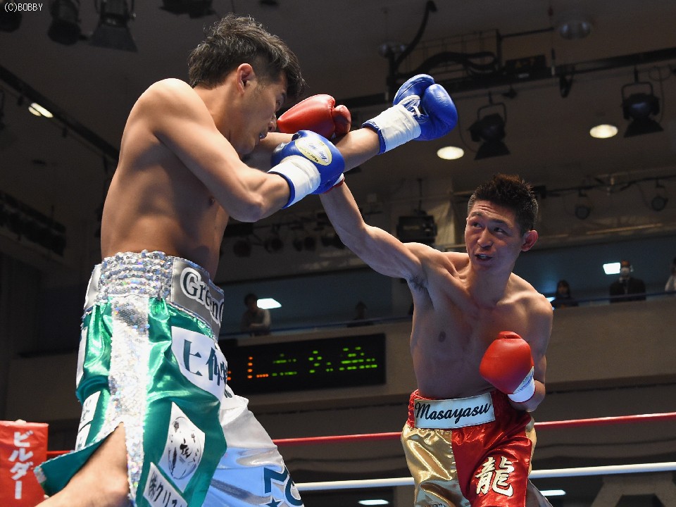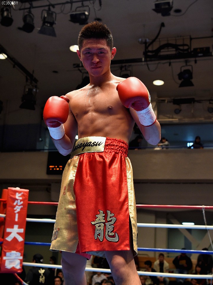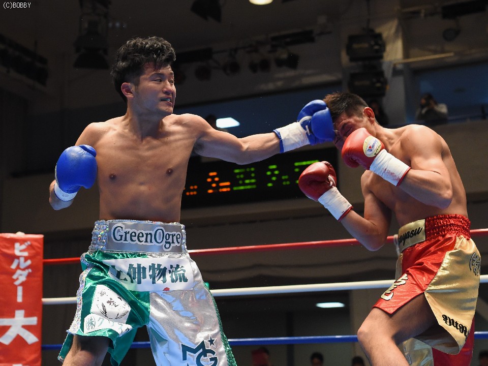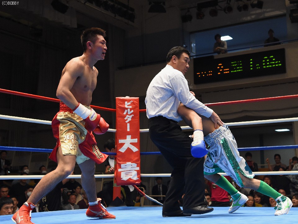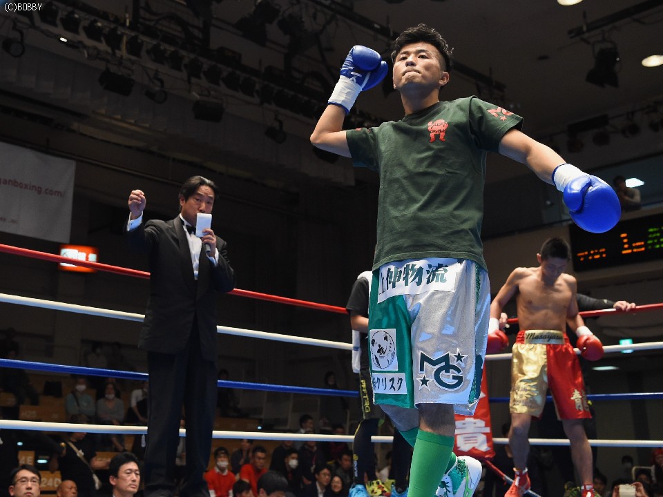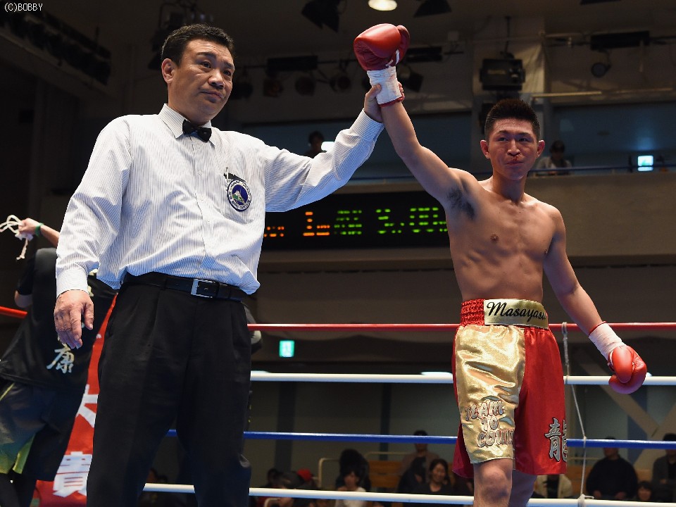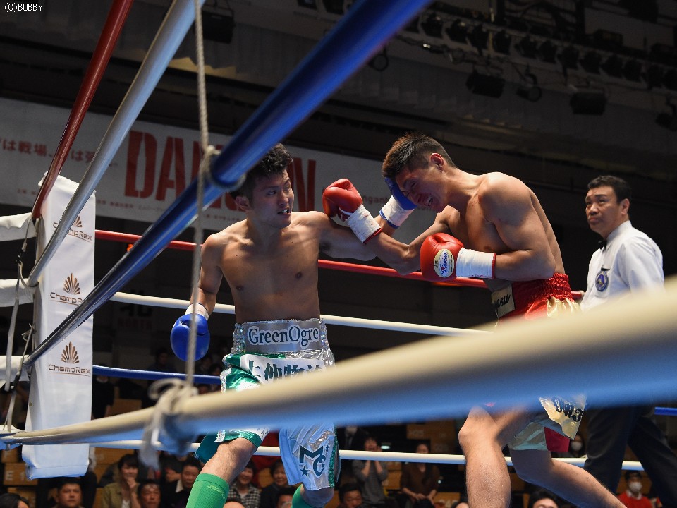試合:低く構えるファイター上田がいつものようにゴングと同時に駆け寄り、フック系の左右の強打を振るう。だが、これを予測していた中村も耐えながらワンツー、アッパーとストレート系を返し、初回から打撃戦へと発展した。どちらも一歩も引かない打ち合いに場内は早くもヒートアップ。2R、この声援を聞きさらにペースをあげた両者だが、中村の回転が上回ると強烈な右で上田の顔面を弾いた。最後はロープ際で完全に仰け反った上田をレフェリーが抱え、試合を止めた。