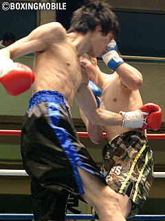 試合:ノーランカー同士ながらも好カード。タイで東洋SFe6位に勝ち、敵地で日本SB3位玉越と引き分けている石東(いしどう)と、前戦でB級杯優勝&MVPの実績ある小平をKOし波に乗る天笠との一戦。初回、石東が開始から果敢にフック中心の連打で攻め立てアグレッシブをアピールするなかこのR終盤、一回り大きい天笠が右を合わせるなどタイミングによる好打を見せる。翌2R、やはり果敢に入ってくる石東に対し天笠が右を合わせダウンゲット。石東は再開後怯まず必死に左右フックでくいついていくが天笠がインからのショート連打を浴びせると、石東の動きが止まると即座にレフリーストップかかかった。天笠の快勝。