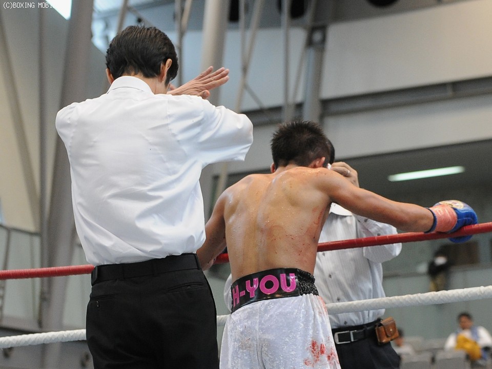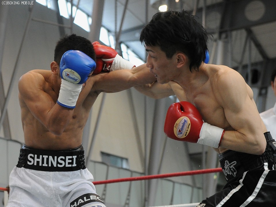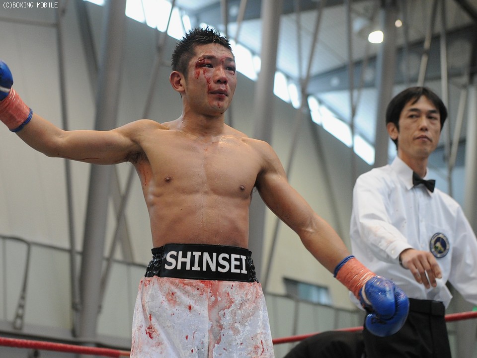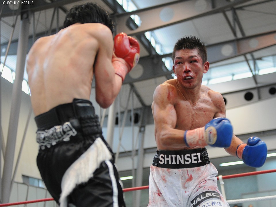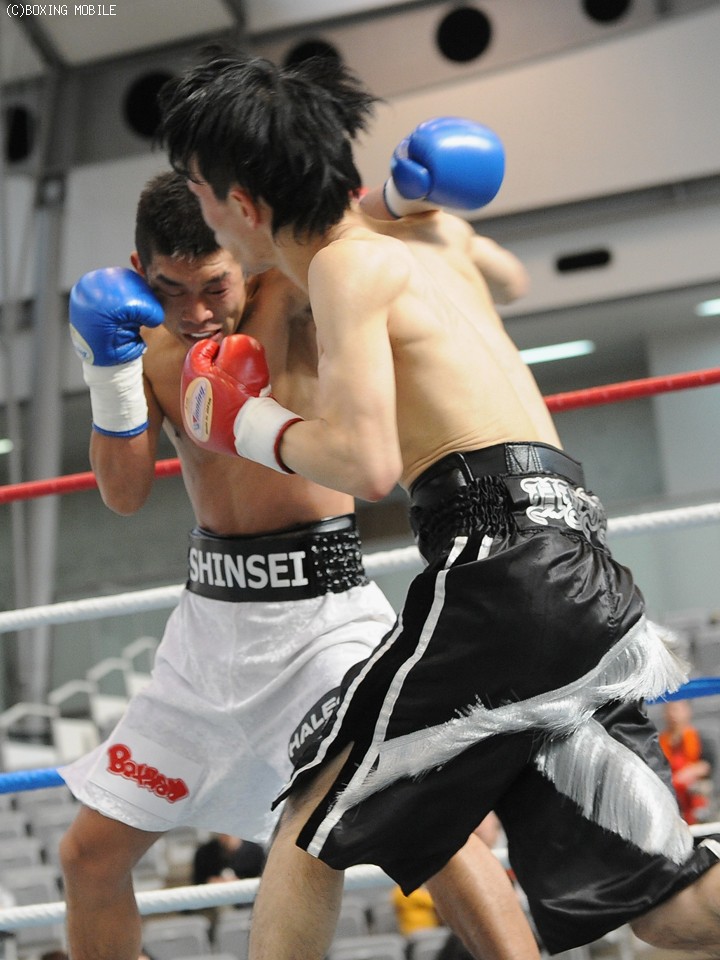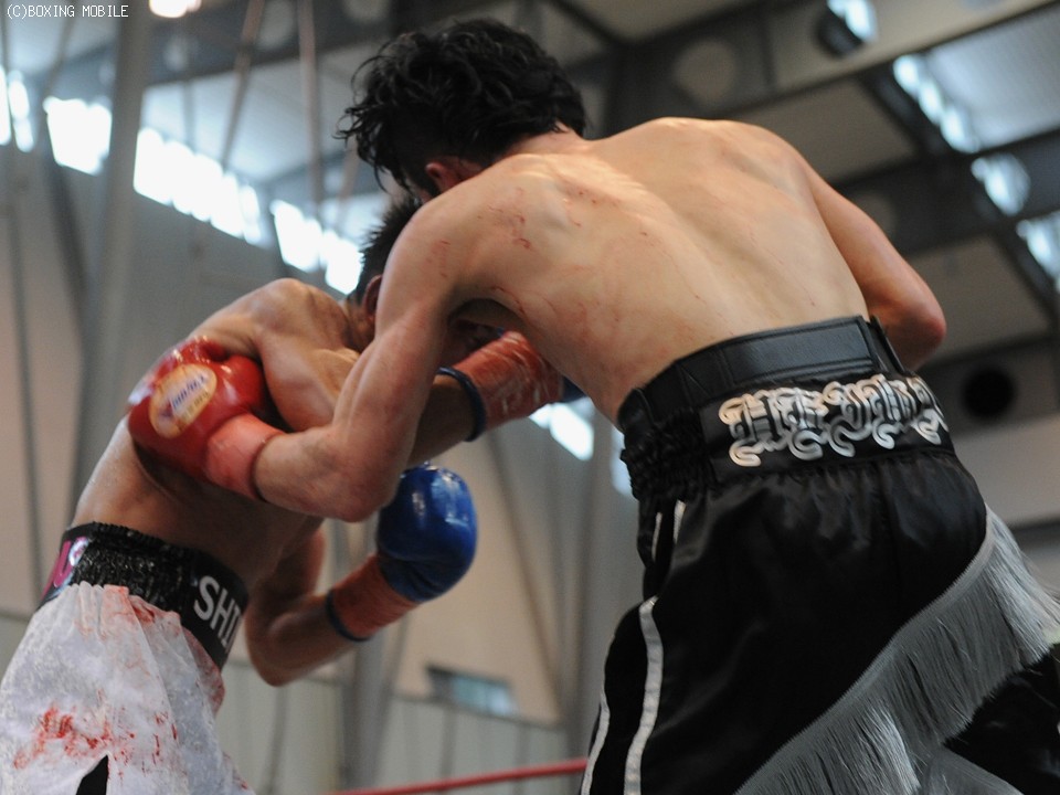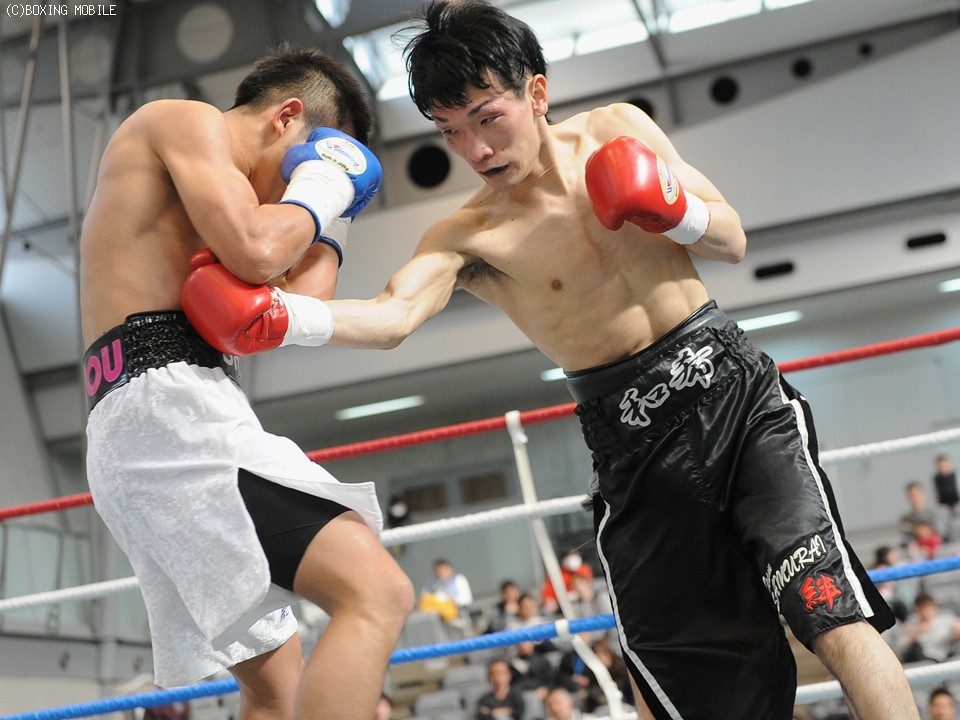 試合:前戦でランカー対決を制した小澤に深蔵がアタック。初回、テンポよくジャブを打ち込み圧力をかけた小澤が右クロスに繋げ、距離が詰まると左ボディから左右フックをヒット。早くも主導権を握った。深蔵も下がらずにアッパー、ボディを返すが、小澤の勢いは止まらず。打ち合いが激しさを増すなか、2R終了間際に小澤がバッティングで右目上をカット。すると勝負を焦ったのか、3Rの立ち上がりに深蔵の右ショートをもらい、思わず膝をつくダウンを喫した。ここからポイント挽回に出た小澤は左ボディ、右クロをまとめ押し込むが、深蔵も頭をつけて迎撃。小澤の出血が酷くなり、3度目のドクターチェックでレフェリーが試合をストップしや。4R途中採点となったが、手数と回転力で上回った小澤がダウンポイントを跳ね返し僅差で勝利。ランキングを死守した。