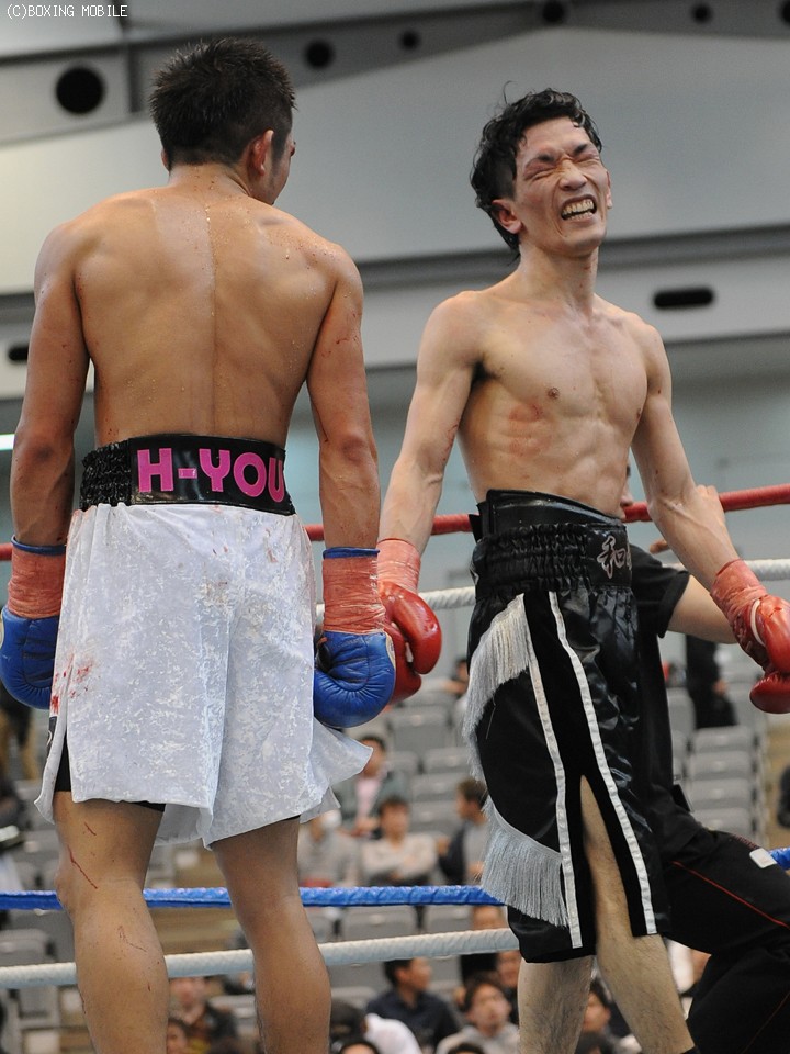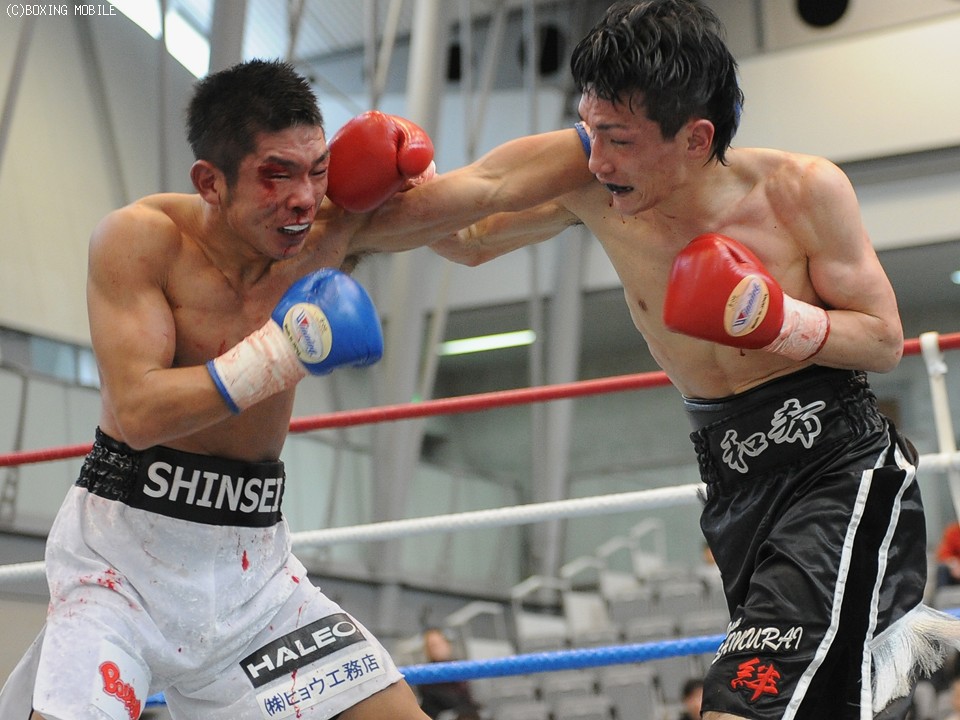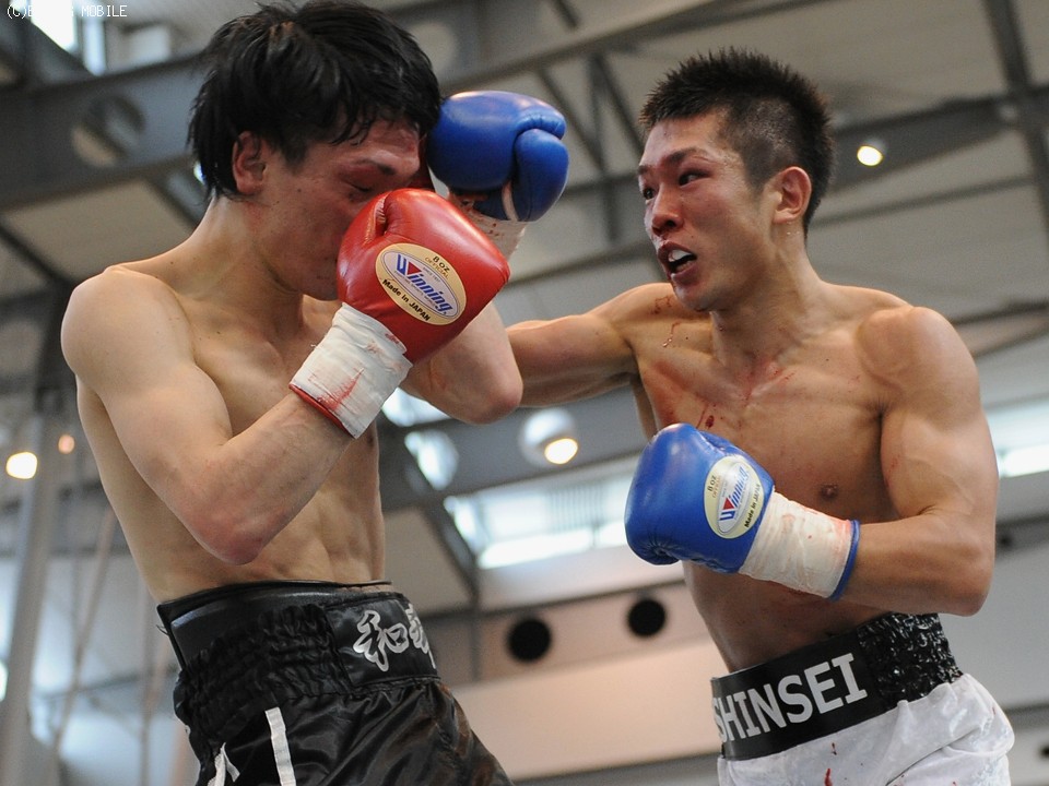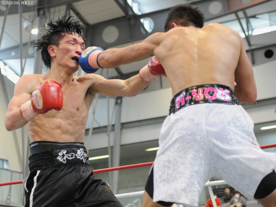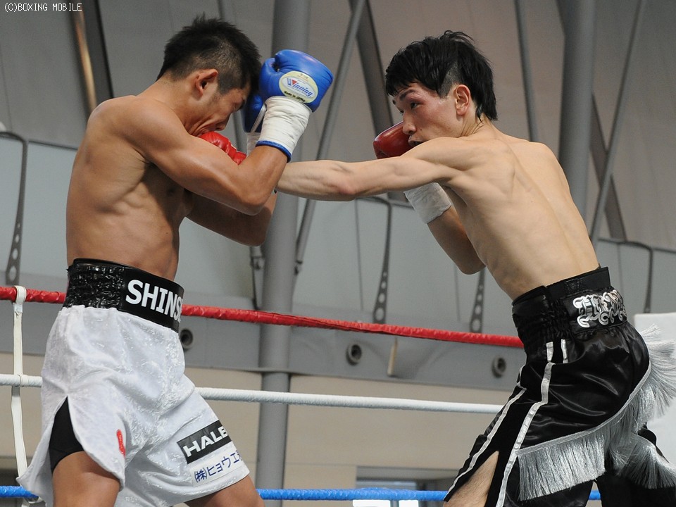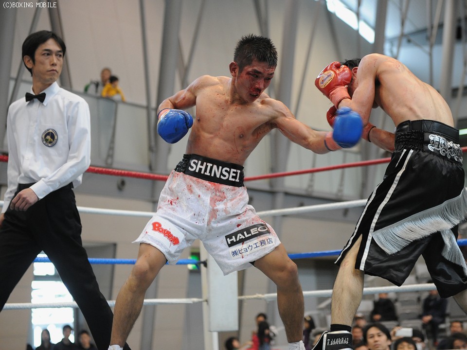 試合:前戦でランカー対決を制した小澤に深蔵がアタック。初回、テンポよくジャブを打ち込み圧力をかけた小澤が右クロスに繋げ、距離が詰まると左ボディから左右フックをヒット。早くも主導権を握った。深蔵も下がらずにアッパー、ボディを返すが、小澤の勢いは止まらず。打ち合いが激しさを増すなか、2R終了間際に小澤がバッティングで右目上をカット。すると勝負を焦ったのか、3Rの立ち上がりに深蔵の右ショートをもらい、思わず膝をつくダウンを喫した。ここからポイント挽回に出た小澤は左ボディ、右クロをまとめ押し込むが、深蔵も頭をつけて迎撃。小澤の出血が酷くなり、3度目のドクターチェックでレフェリーが試合をストップしや。4R途中採点となったが、手数と回転力で上回った小澤がダウンポイントを跳ね返し僅差で勝利。ランキングを死守した。