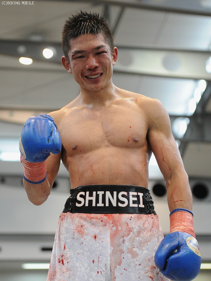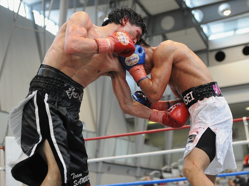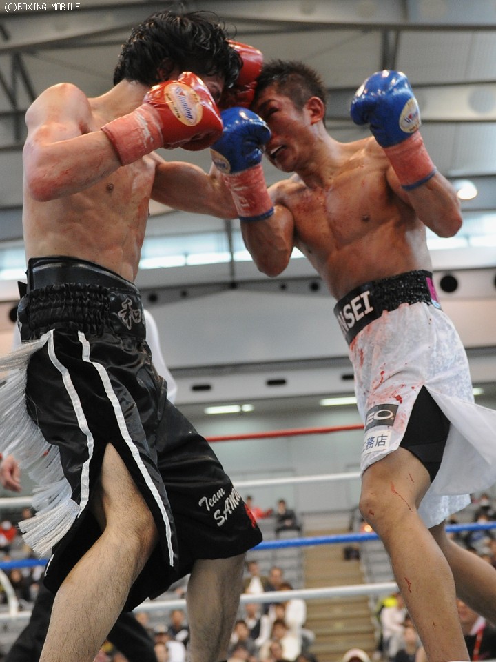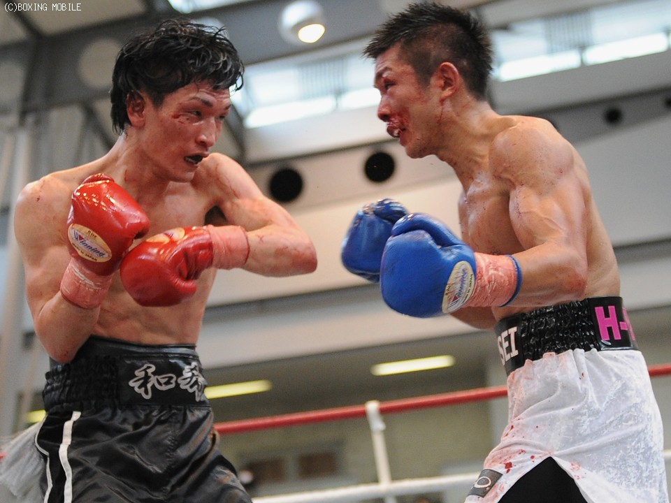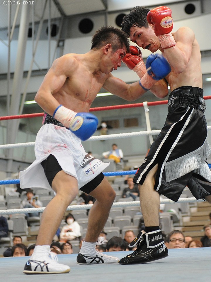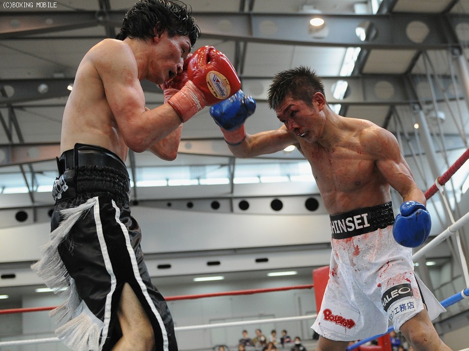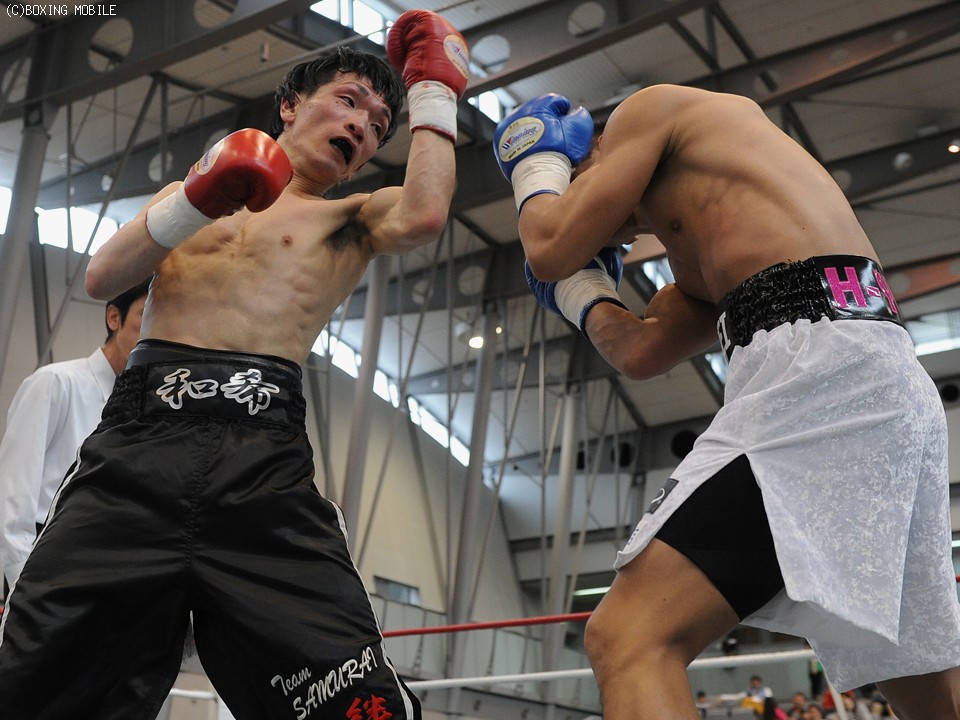 試合:前戦でランカー対決を制した小澤に深蔵がアタック。初回、テンポよくジャブを打ち込み圧力をかけた小澤が右クロスに繋げ、距離が詰まると左ボディから左右フックをヒット。早くも主導権を握った。深蔵も下がらずにアッパー、ボディを返すが、小澤の勢いは止まらず。打ち合いが激しさを増すなか、2R終了間際に小澤がバッティングで右目上をカット。すると勝負を焦ったのか、3Rの立ち上がりに深蔵の右ショートをもらい、思わず膝をつくダウンを喫した。ここからポイント挽回に出た小澤は左ボディ、右クロをまとめ押し込むが、深蔵も頭をつけて迎撃。小澤の出血が酷くなり、3度目のドクターチェックでレフェリーが試合をストップしや。4R途中採点となったが、手数と回転力で上回った小澤がダウンポイントを跳ね返し僅差で勝利。ランキングを死守した。