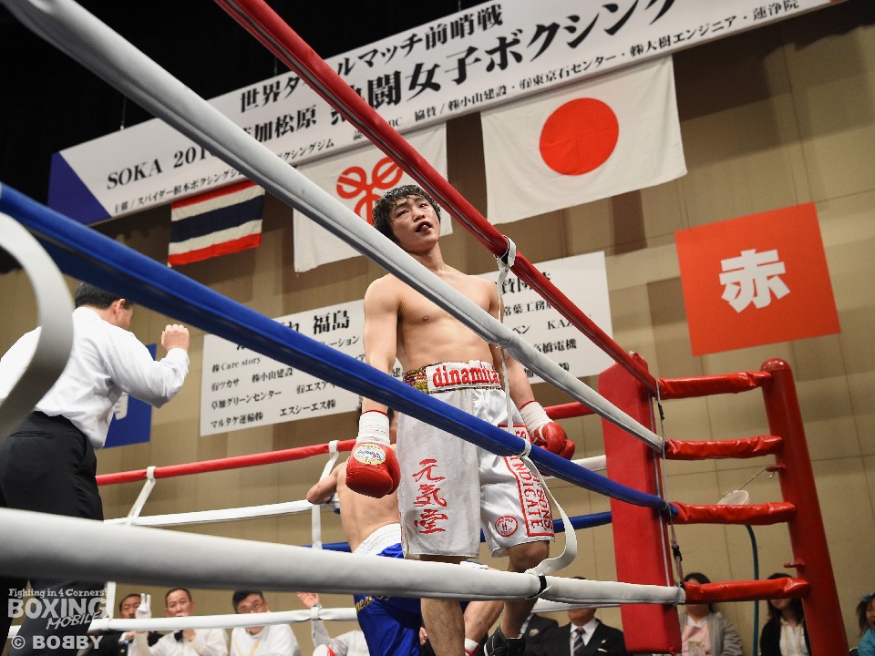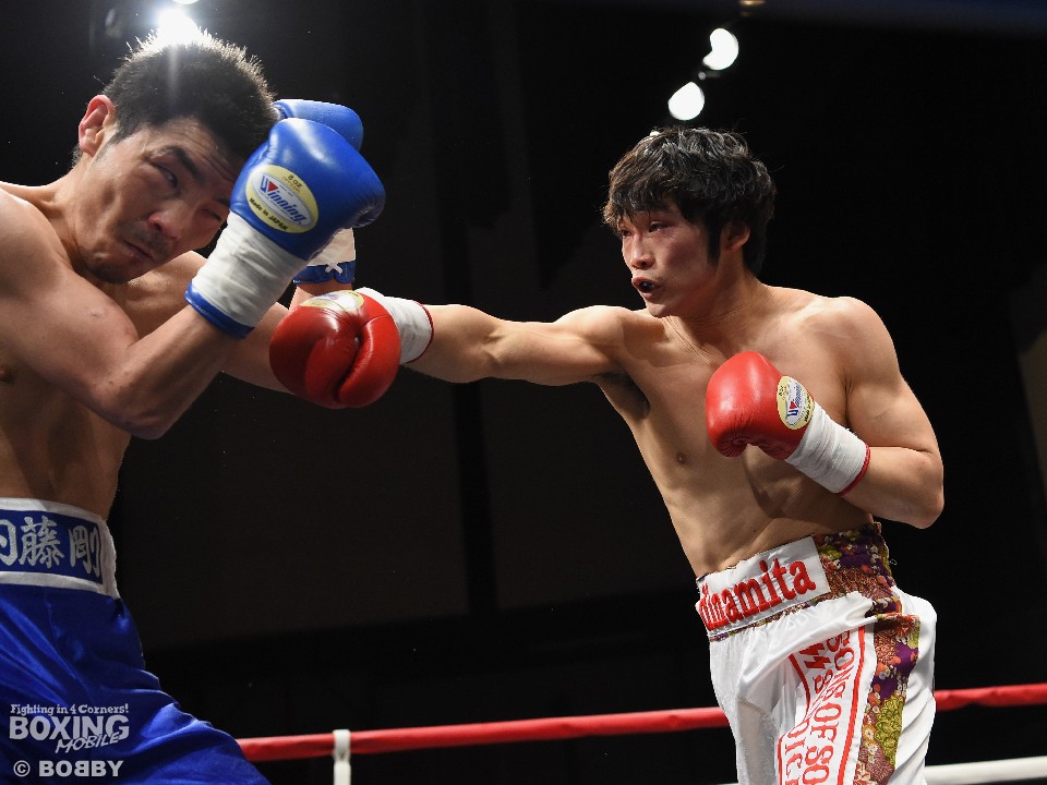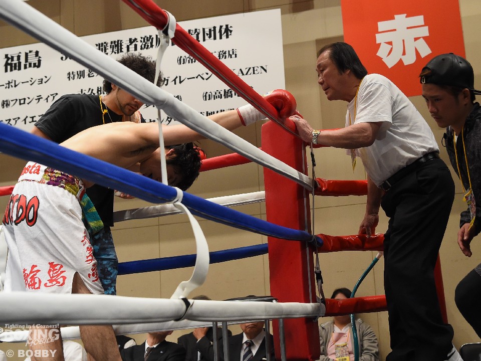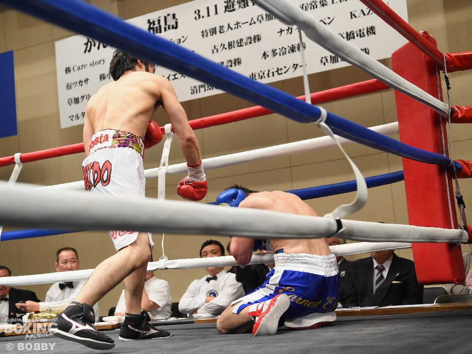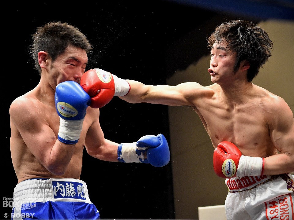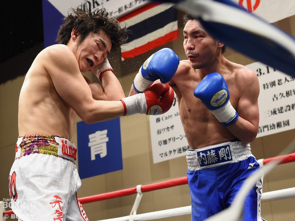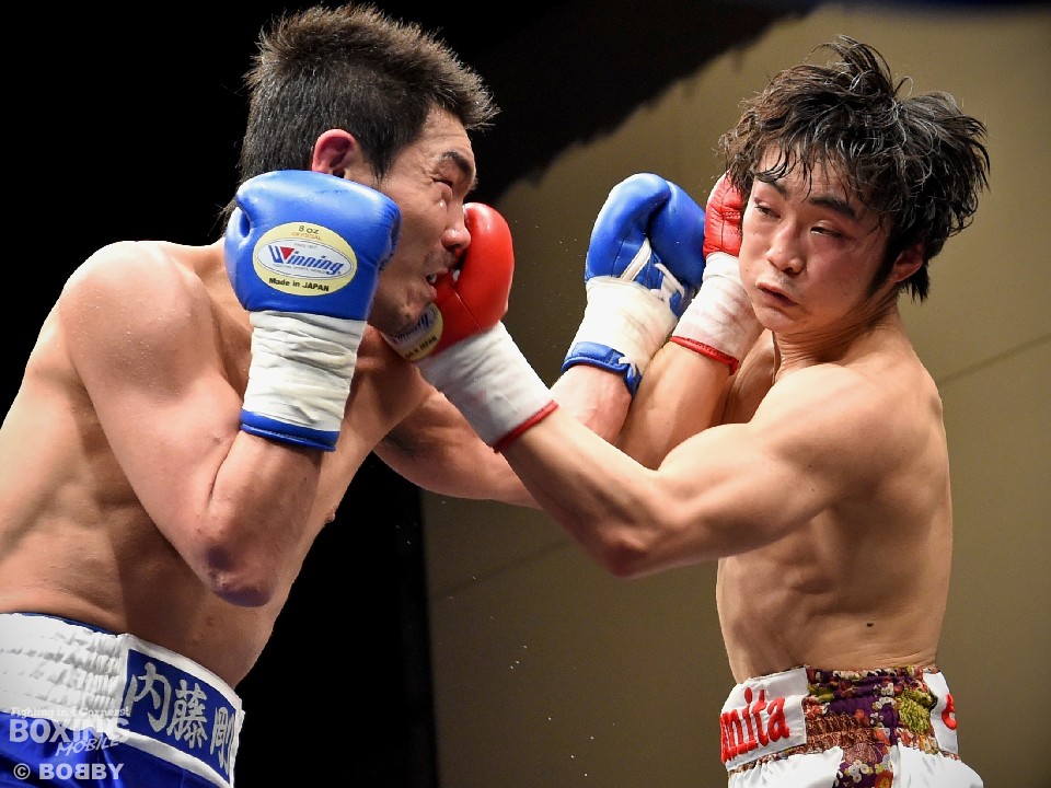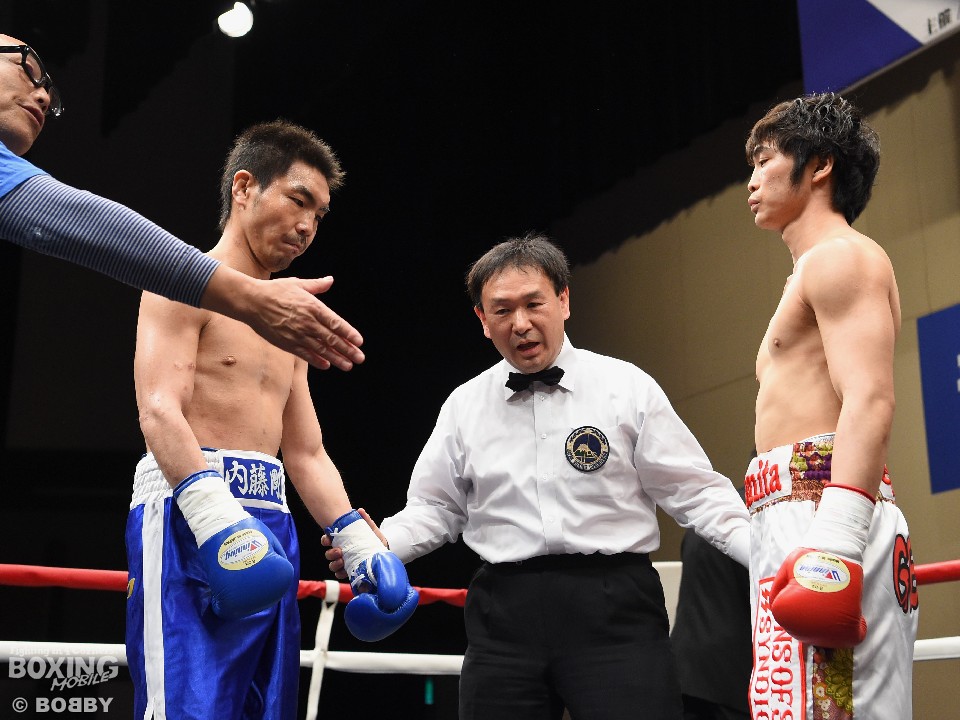 試合:足を使いジャブでリズムを図る内藤に対し、嶋崎はジャブを合わせては距離をキープし右ストレートを上下に伸ばすと、初回終盤にはペースを上げ左右フックを振り回した内藤に右を合わせ、膝を落とした。2Rには内藤を後退させると、ロープ際で左ボディを効かせ左フックを好打。腰を沈ませた内藤はロープに救われこの回を乗り切ったが、以降も嶋崎の圧力にロープを背にする展開は変わらず。単発ながら右を浴びせた嶋崎が4R、右ストレートで倒しフィニッシュ。内藤は辛うじて起き上がったが、ダメージを考慮したレフェリーは10カウントを数え上げた。