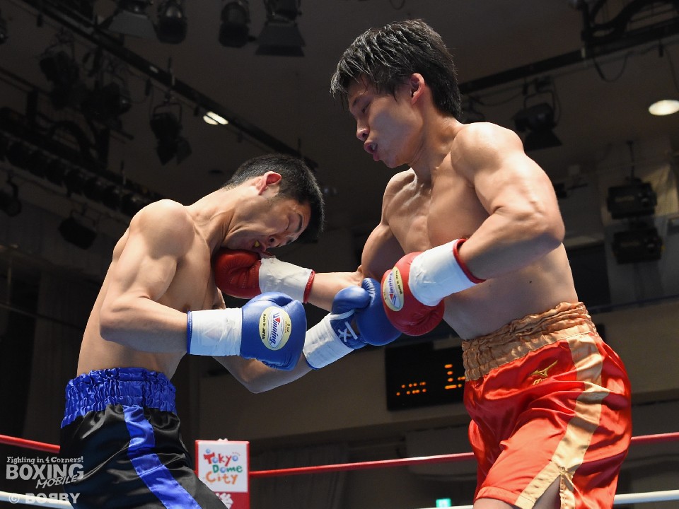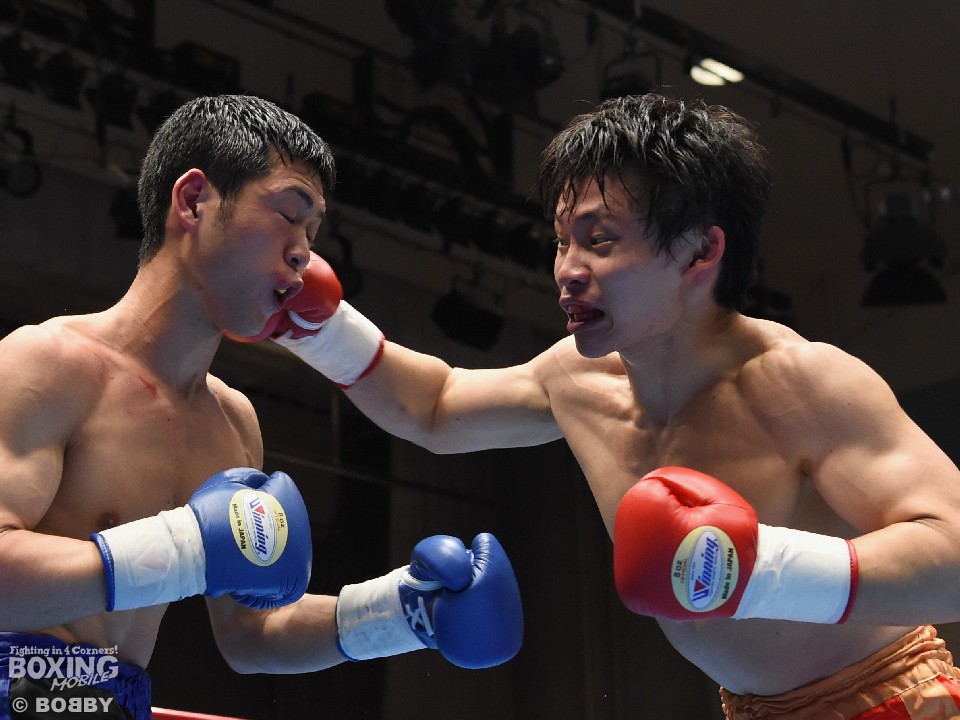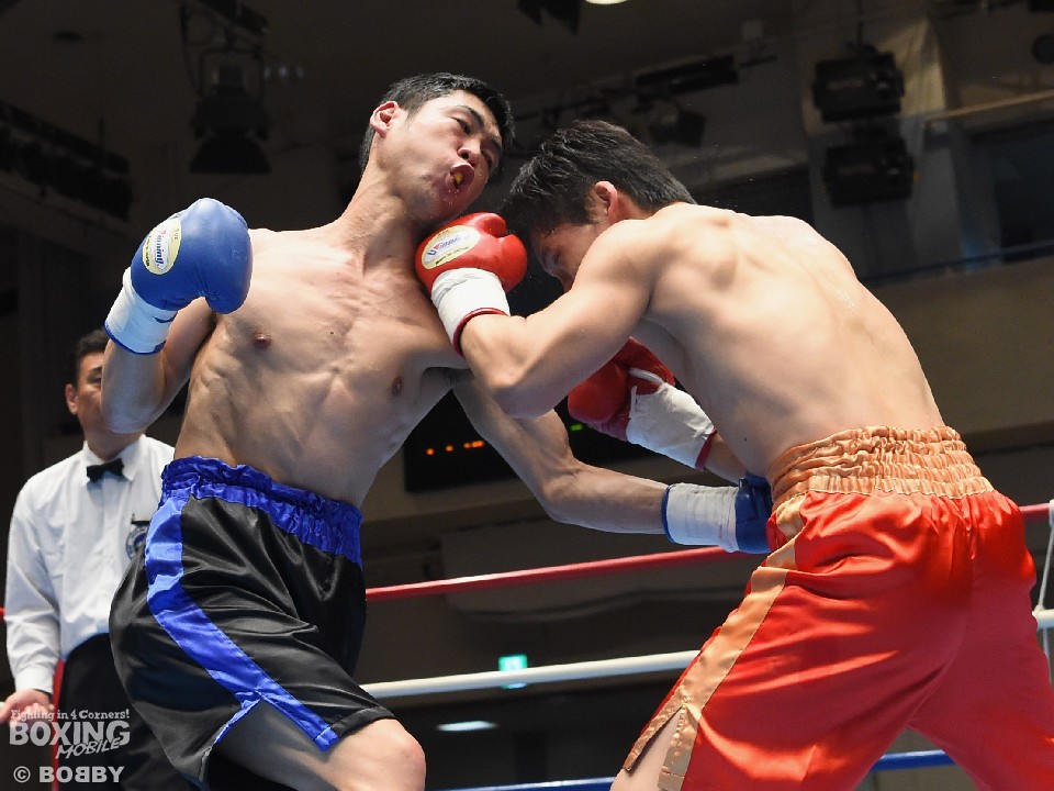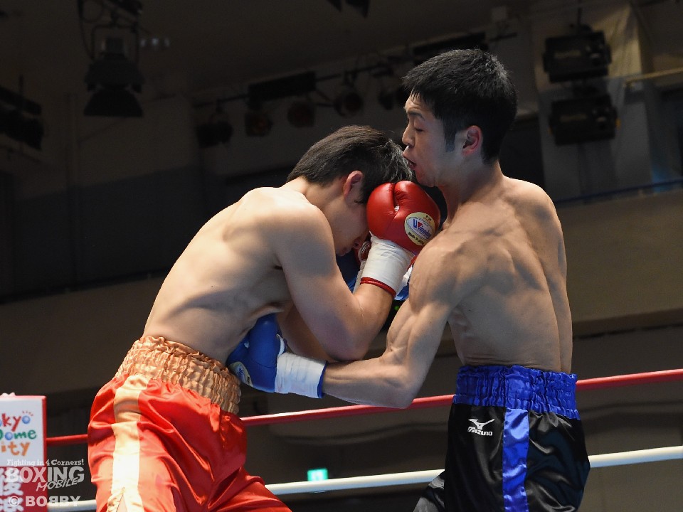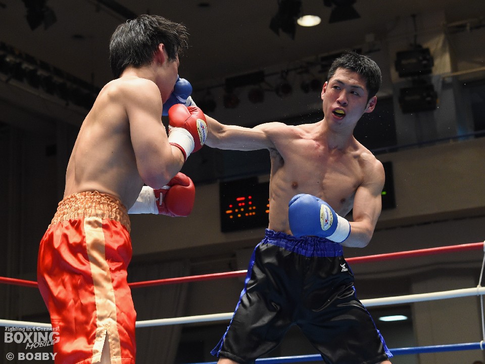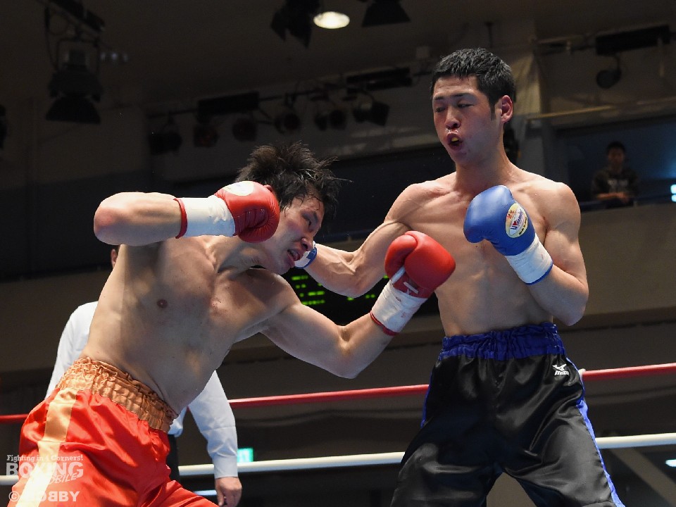 試合:ゴングと同時にリング中央に出たサウスポーの奥野がワンツー、フックで先制したが、松本もガードを固めプレスをかけると右クロスから左フックの強打をヒット。奥野は手数を出し対抗するが、なかなか松本のガードは破れず。逆にボディを効かされるとガードが下がってしまい、最後まで顔面に左右をもらう場面が目立った