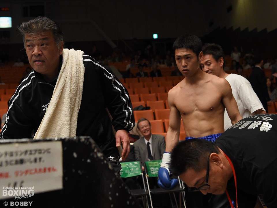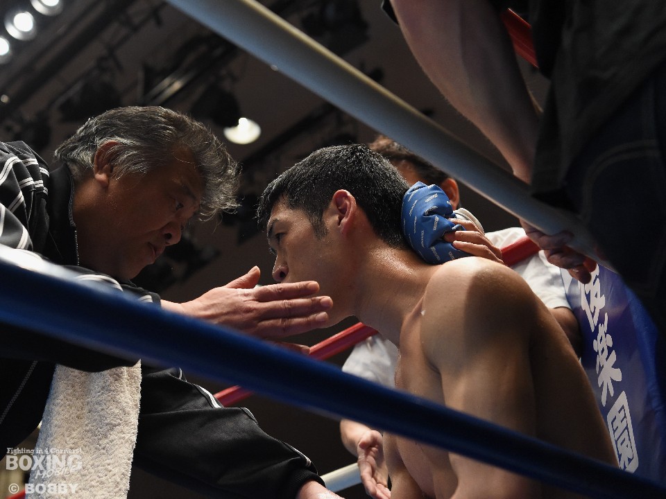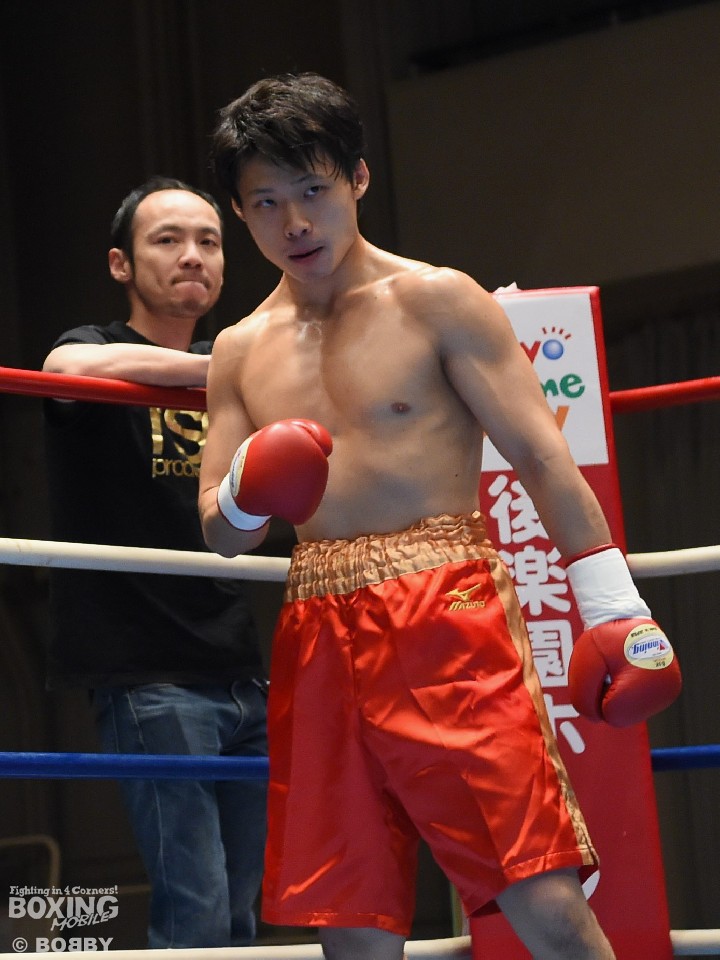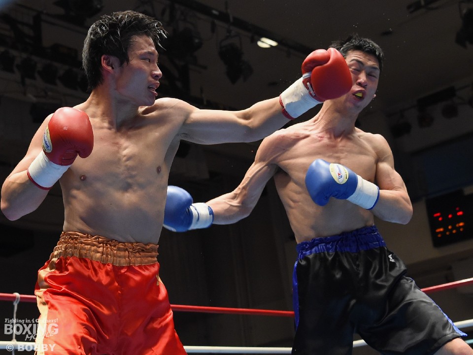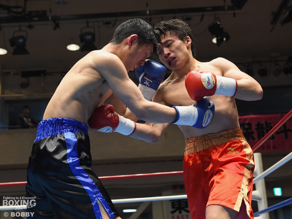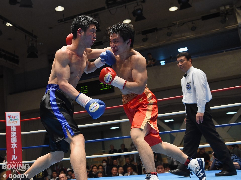 試合:ゴングと同時にリング中央に出たサウスポーの奥野がワンツー、フックで先制したが、松本もガードを固めプレスをかけると右クロスから左フックの強打をヒット。奥野は手数を出し対抗するが、なかなか松本のガードは破れず。逆にボディを効かされるとガードが下がってしまい、最後まで顔面に左右をもらう場面が目立った
