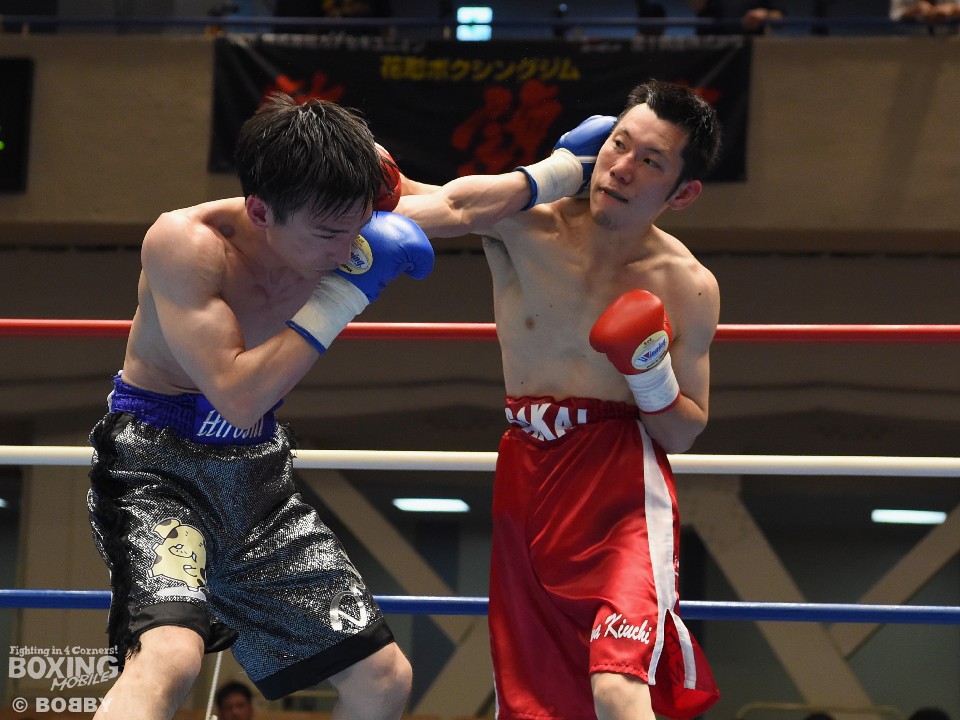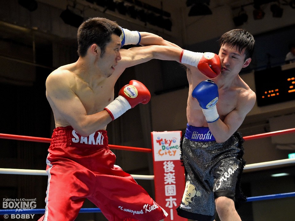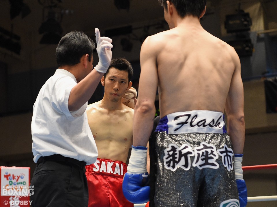 試合:坂井が細かいパンチを繰り出して距離を詰めると、新座も左ボディ、右ストレートを返し対抗。すると初回終了間際に右を浴びせダウンを奪った。坂井に大きなダメージはなく、以降も積極的に前へ出たが、有効打で上回る新座をなかなか崩せず。最終Rでようやく捉え始めたが、新座も反撃しラストは激しく打ち合った。
