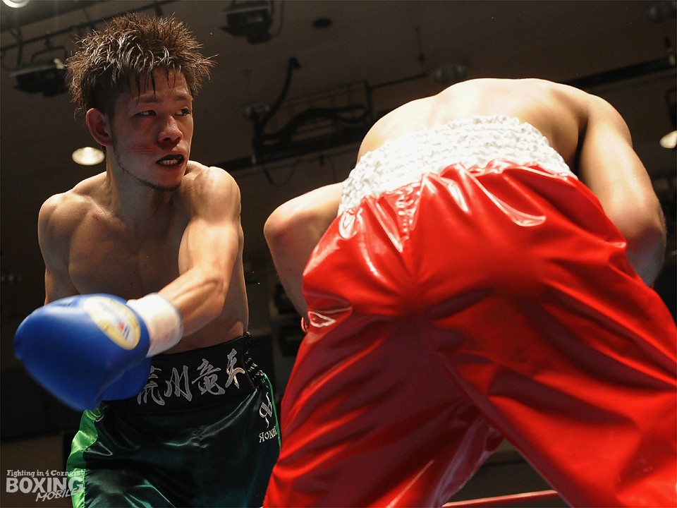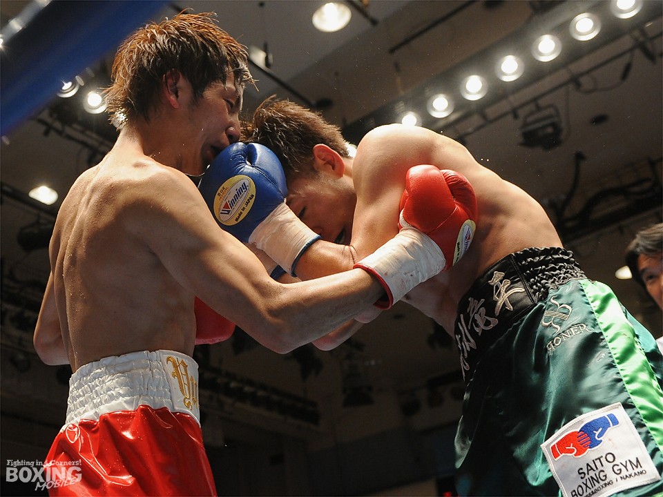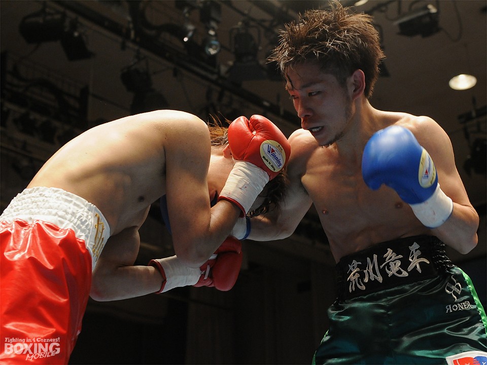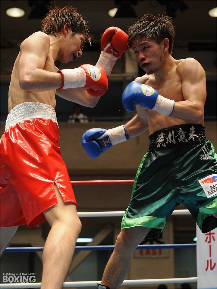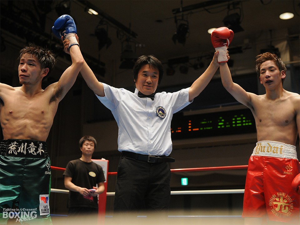 試合:この日、デビュー戦を迎えたサウスポー荒川が積極的にワンツーを繰り出し試合を組み立てると2分過ぎには左ストレートをクリーンヒット。対する松本はジャブを飛ばし、荒川に鼻血を流させるが、荒川も手数を緩めることなくワンツーの連打でペースをわたさない。3回は足を止めて細かい連打の応酬となり、互角の打ち合いを展開。最終回は両応援団の大声援を背に激しく打ち合ったが、判定は3者ともに38-38のドローの採点が下された。