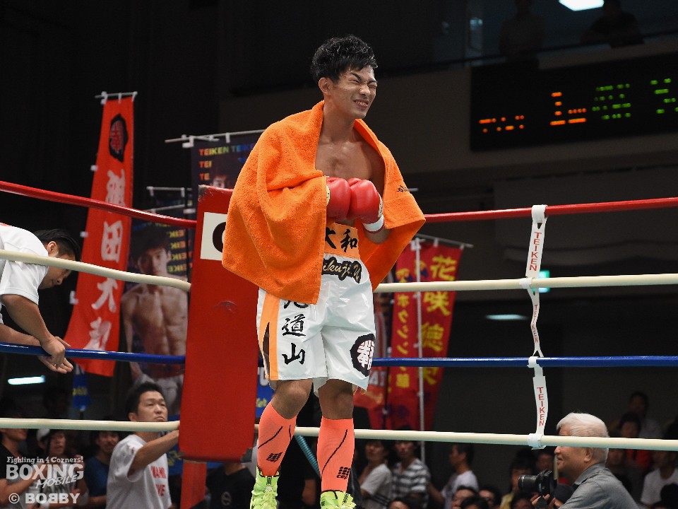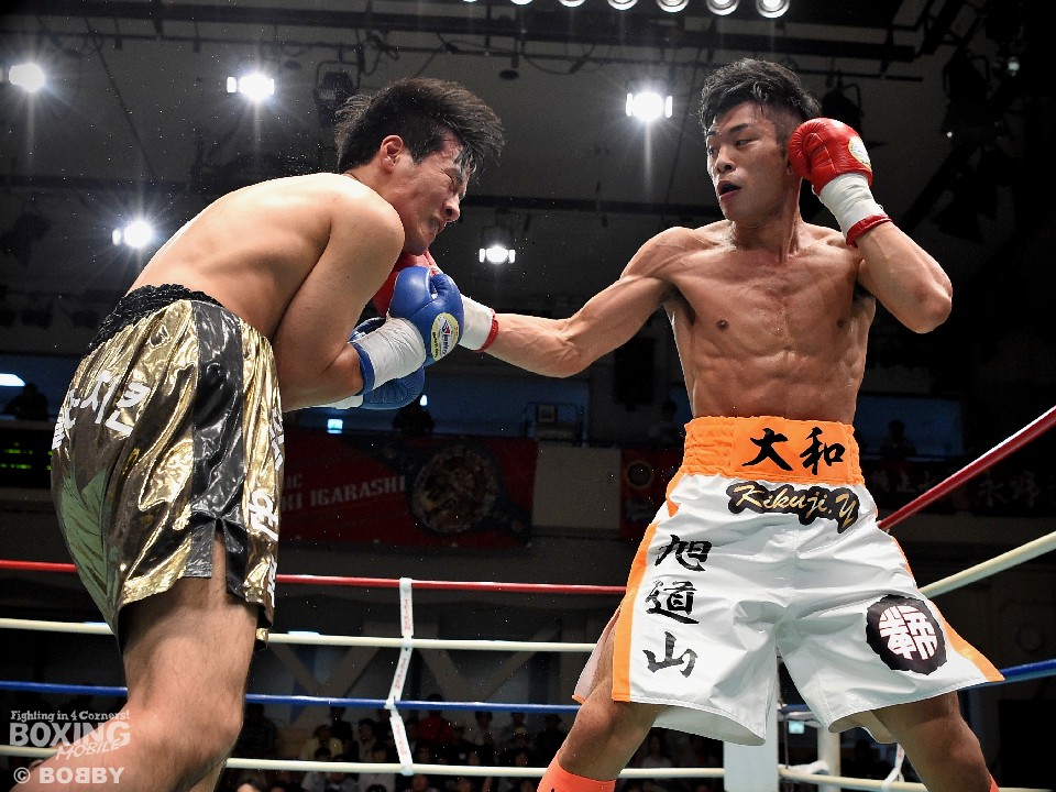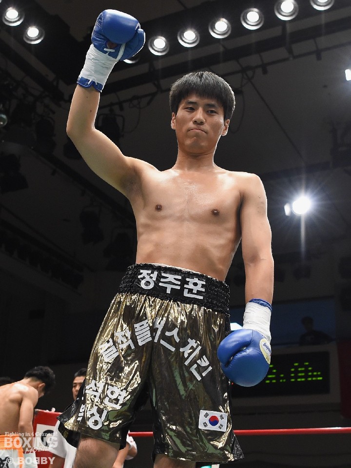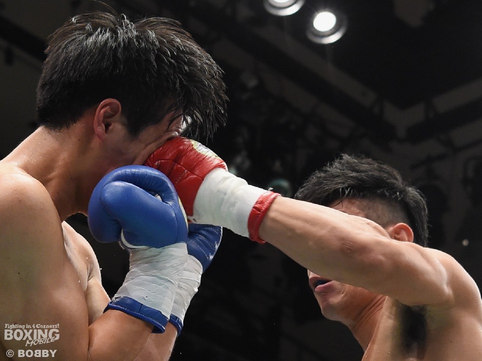 試合:プロ3戦目のサウスポー波田が、まずは右ジャブを突いてリズムを掴む。韓国ランカーで戦績5戦4勝1敗のジューフンもガードを固め圧力を掛けるが、攻撃の切り替えがワンテンポ遅く、初回終盤に捉えられてしまった。ジャブを突いて距離をキープし続けた波田は、右フック、左ボディ、左ストレートを効果的に当て初回以降も試合を掌握。韓国人も手数では負けていなかったが、ボディを攻められると体を丸めてしまい、防戦一方となったところでレフェリーが試合を止めた。波田はこれでデビューから3連続KO勝利となった。