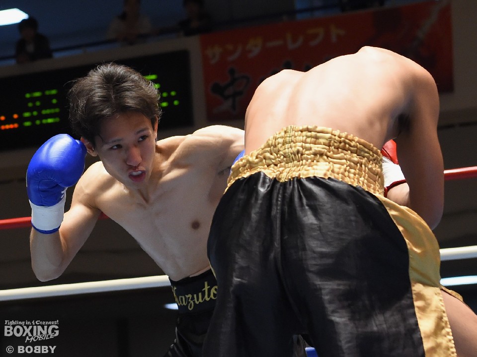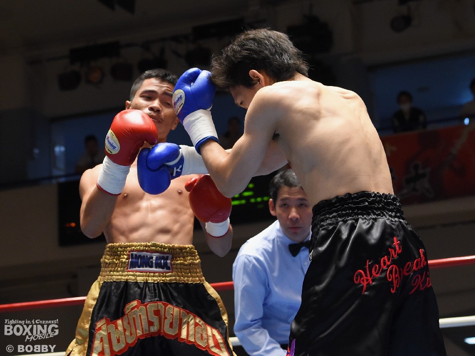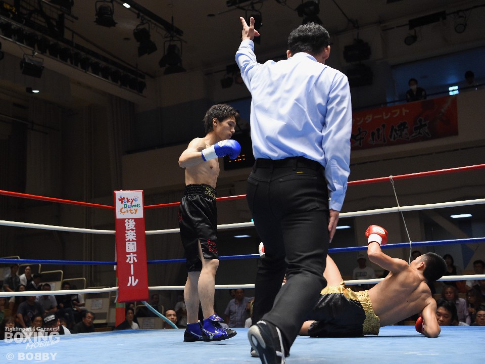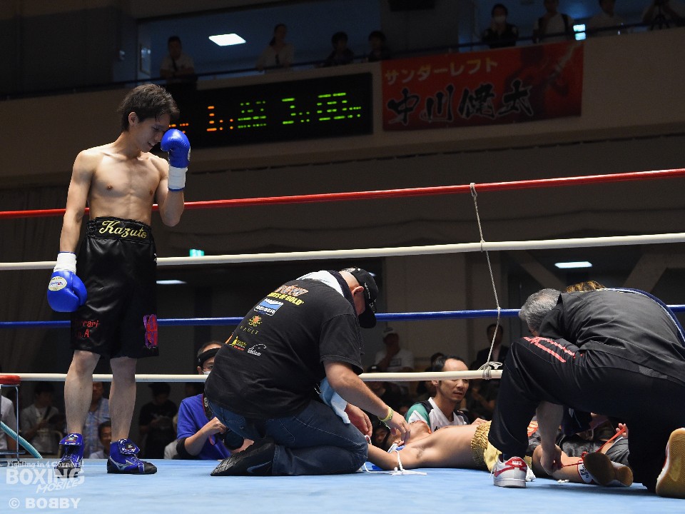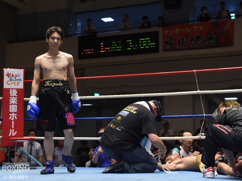 試合:開始からプレスをかけた中根が右フック一発でタイ人を撃沈。起き上がれないトーンを見てレフェリーがカウント途中でストップを宣告した。